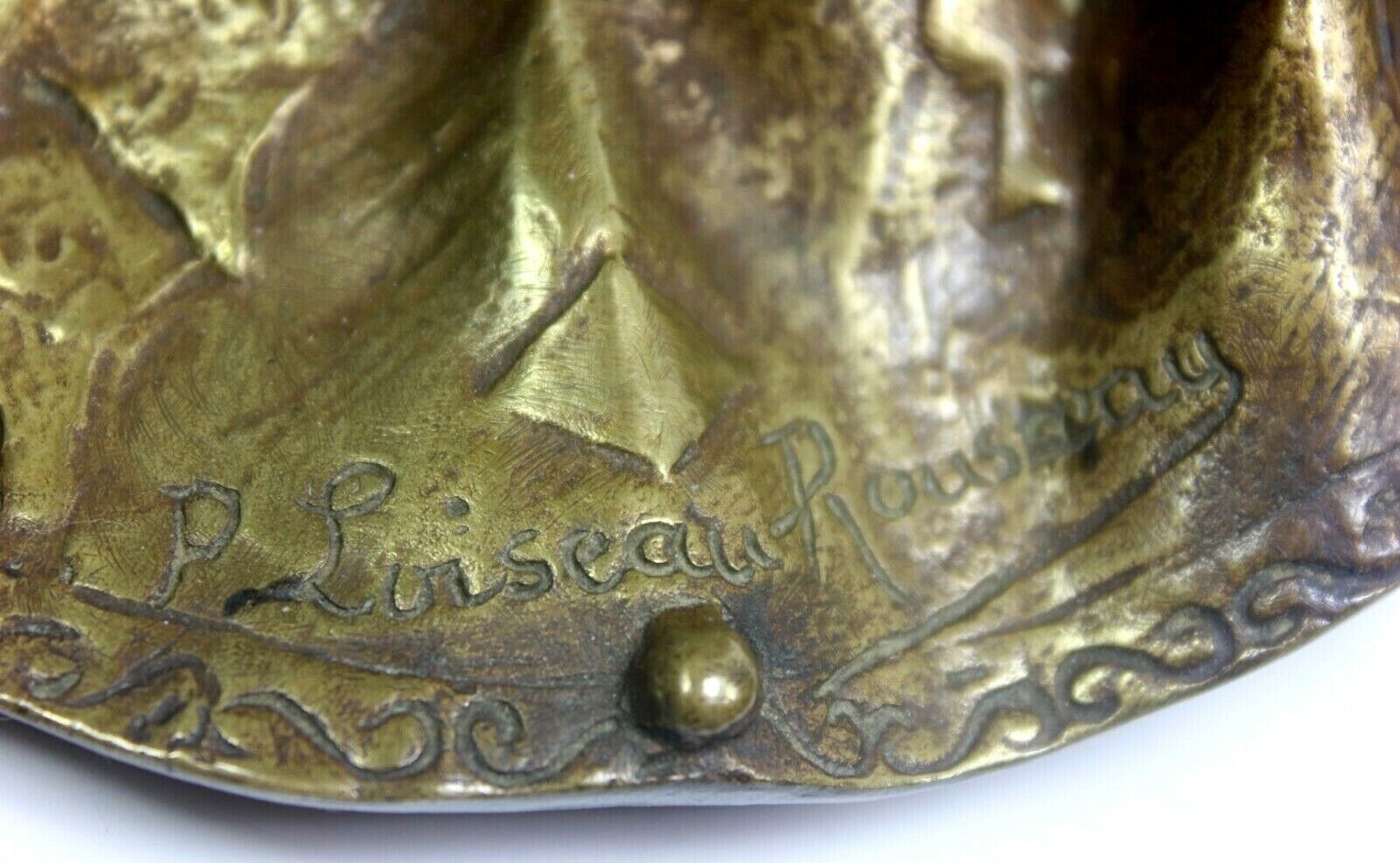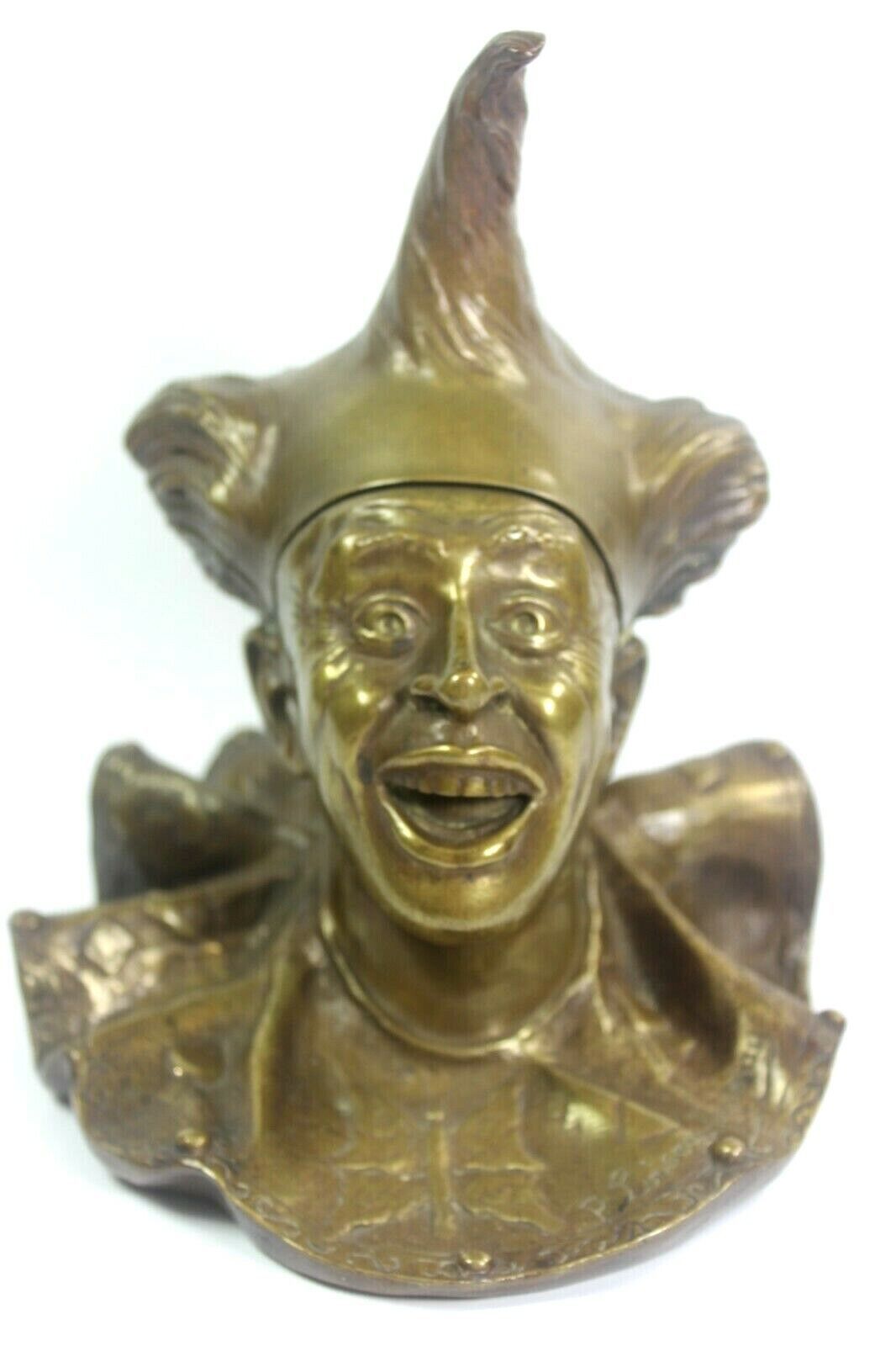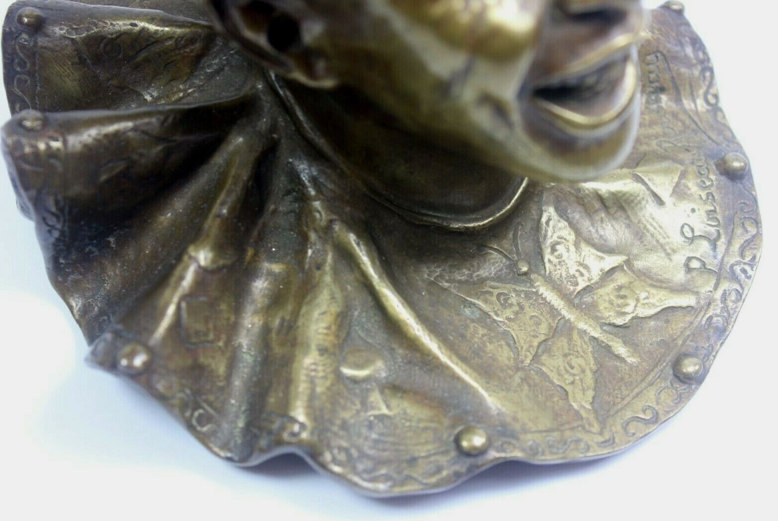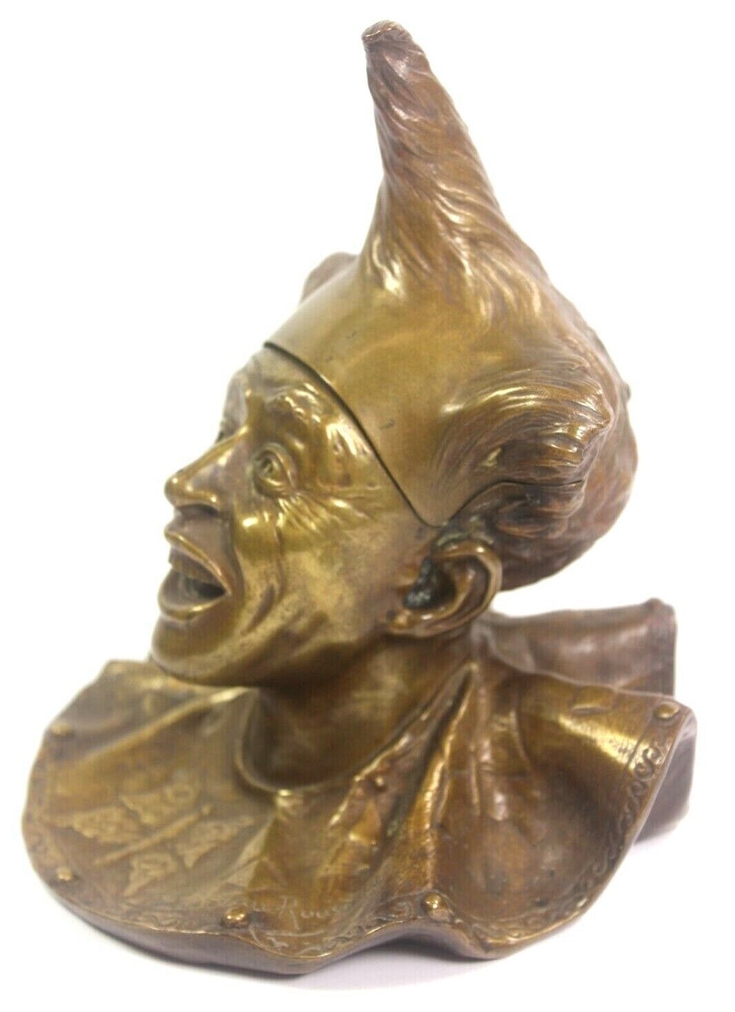 Bronze figural inkwell sculpture of a Harlequin clown by Paul Loiseau Rousseau (French 1861-1927). It is signed on the right side of the clown’s collar.