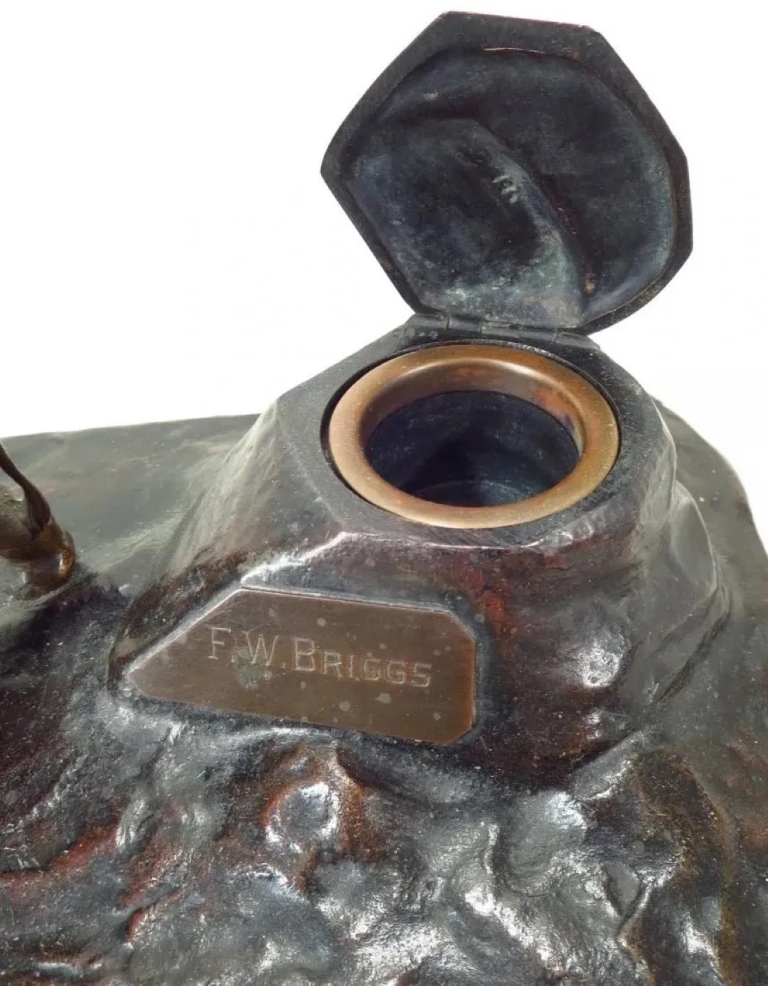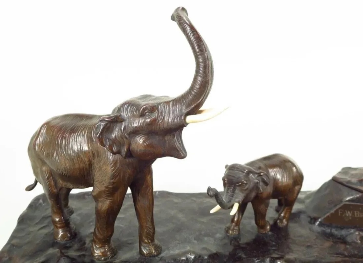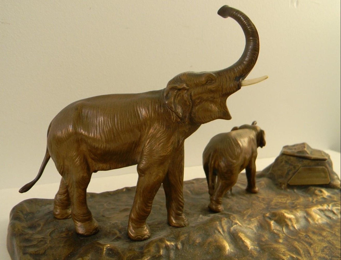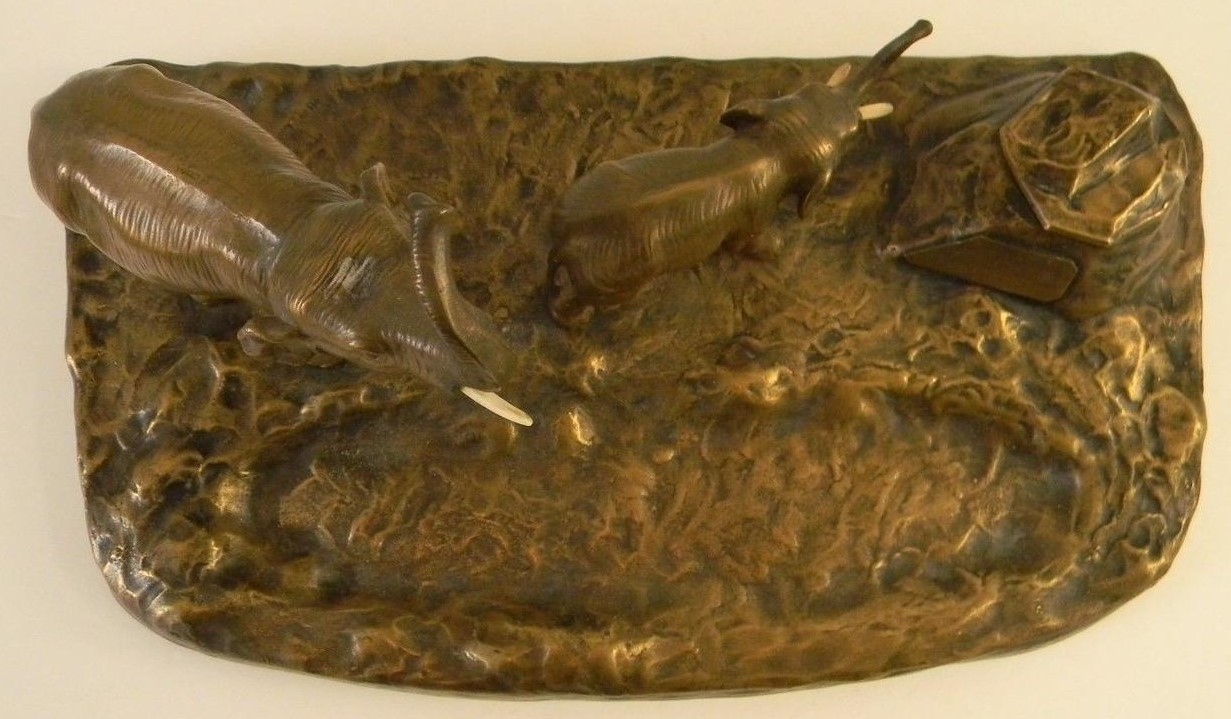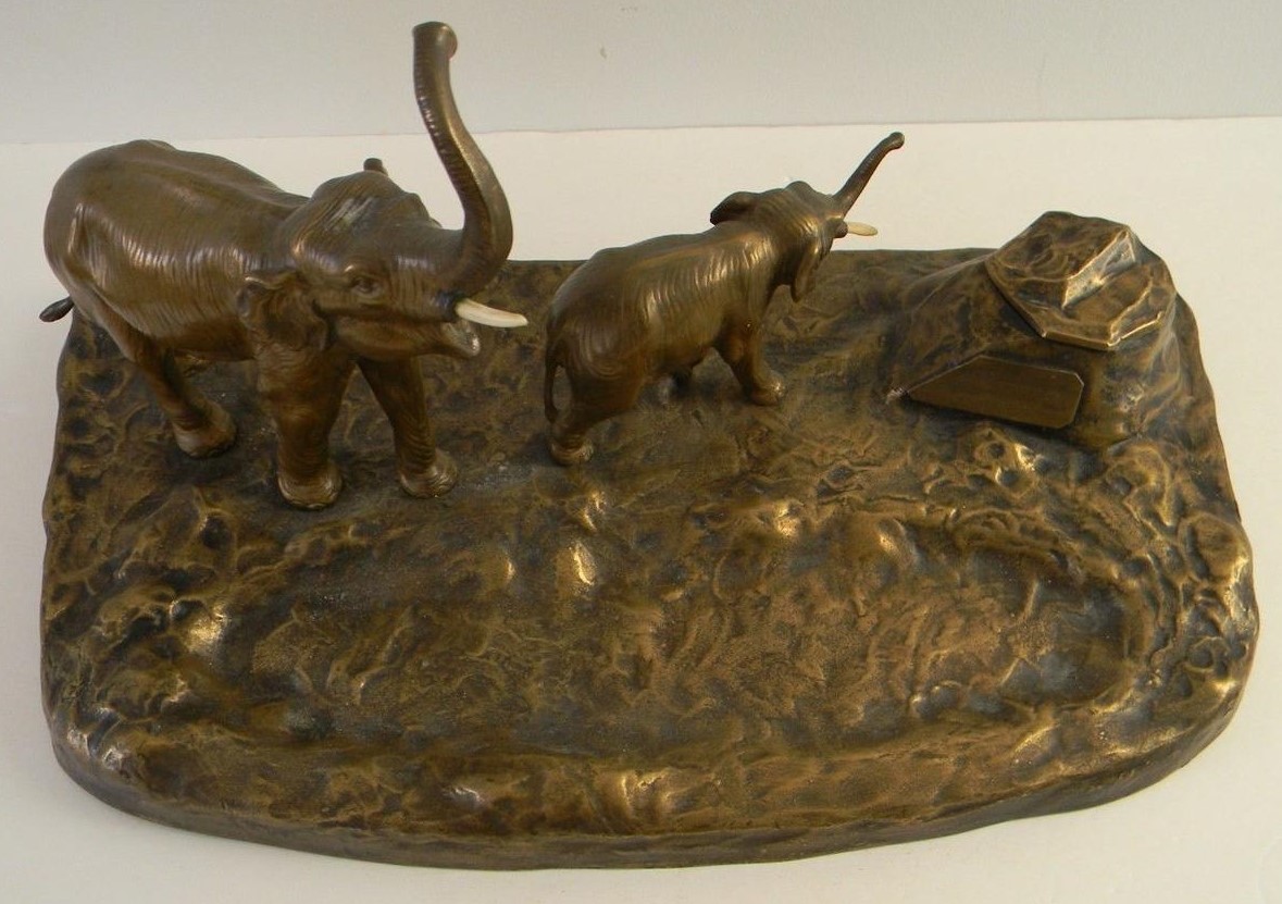 This large bronze inkstand features two elephants roaming the savannah. One tusk on the large elephant is broken off.