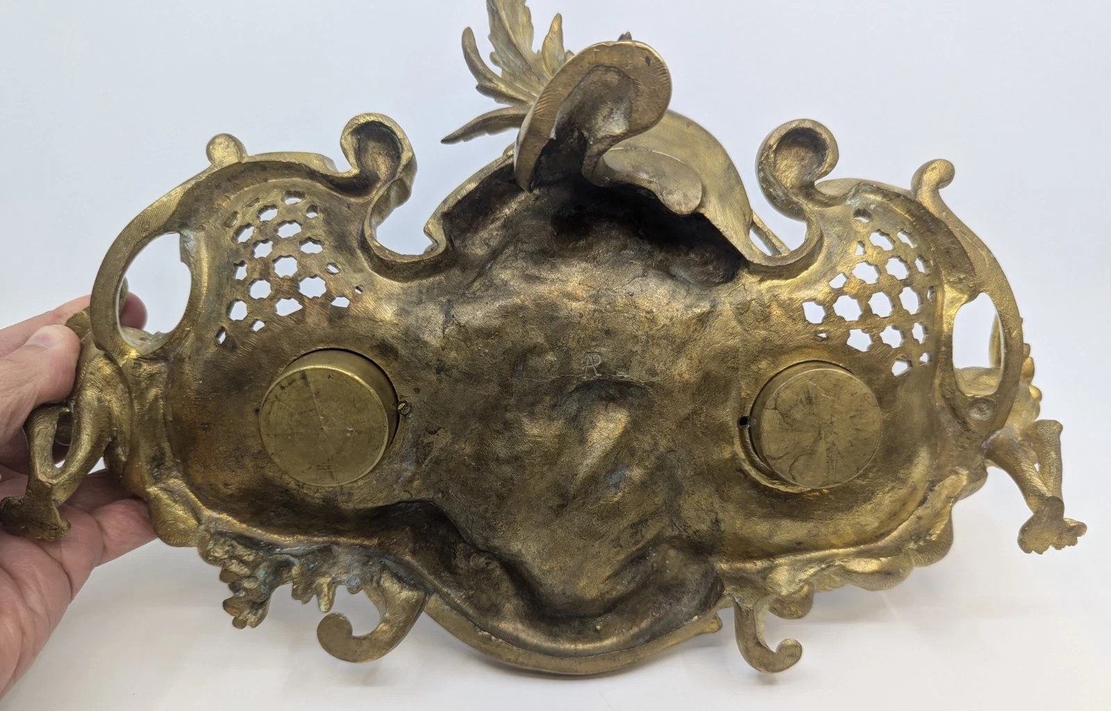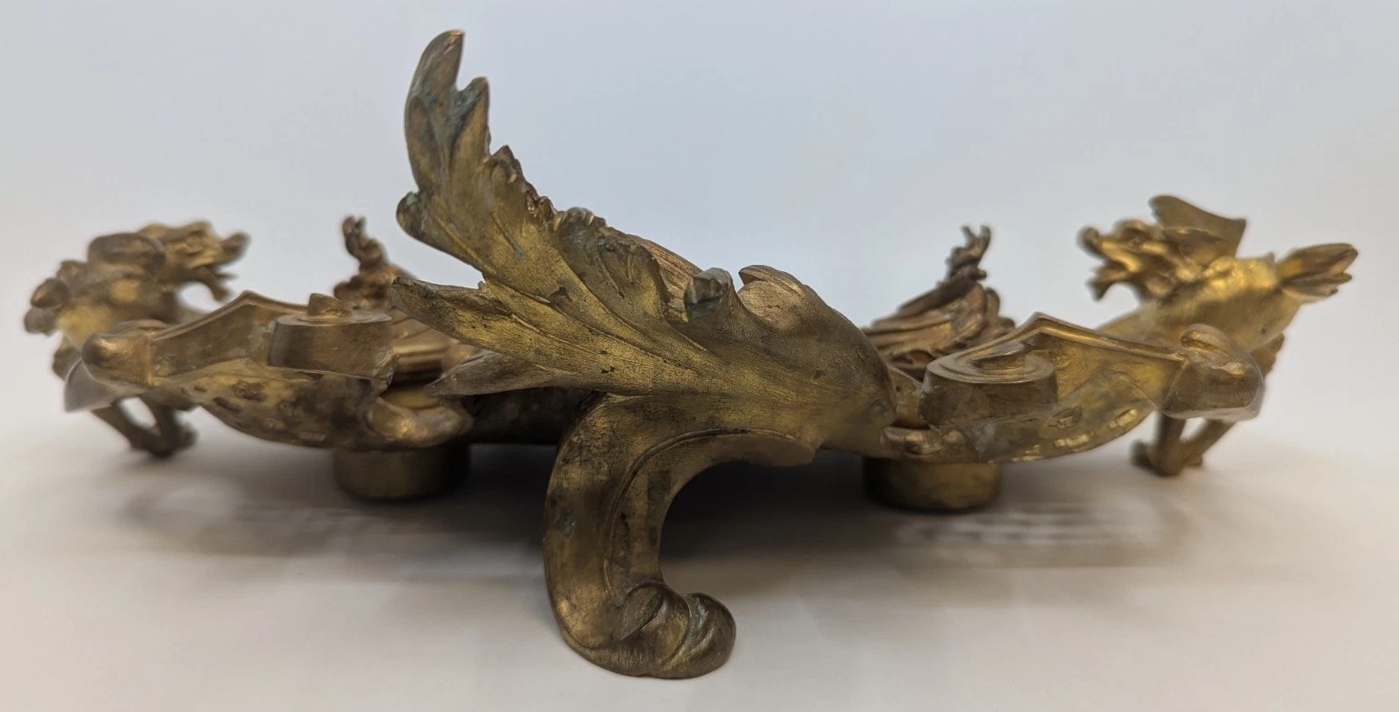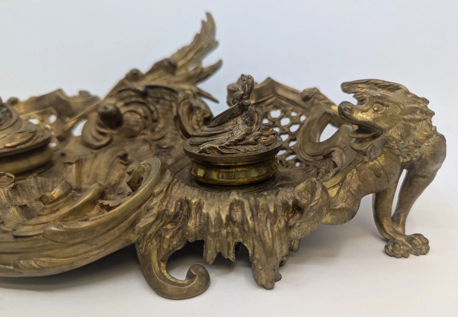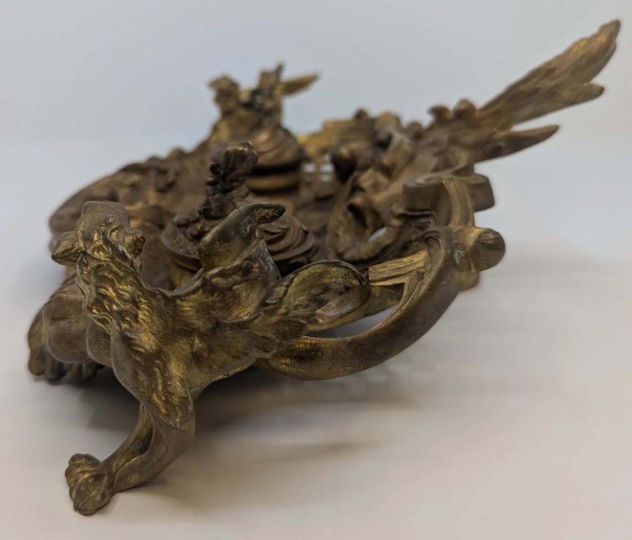 - Material & Style: Cast in bronze, the inkstand features elaborate scrollwork, floral motifs, and high-relief carvings.