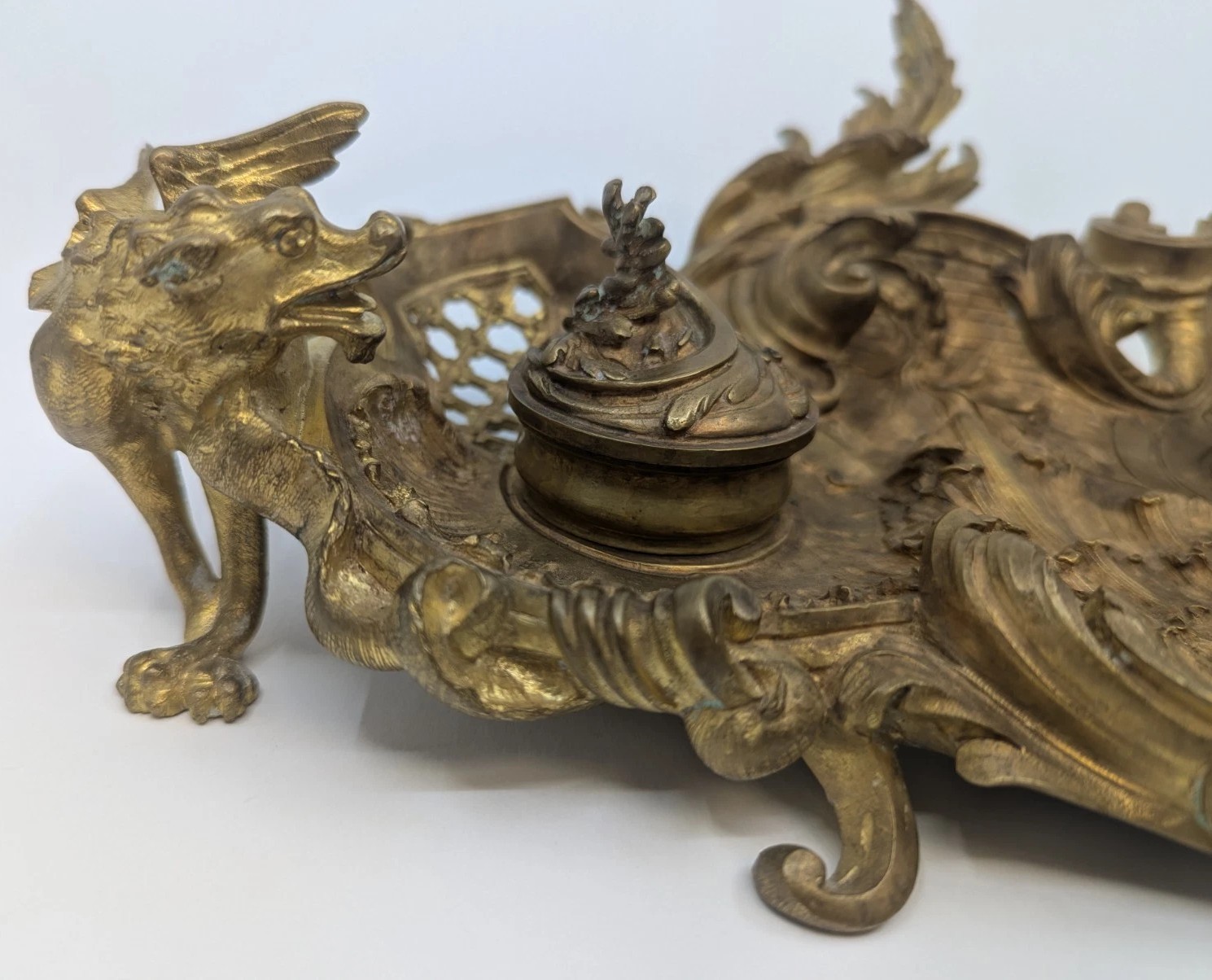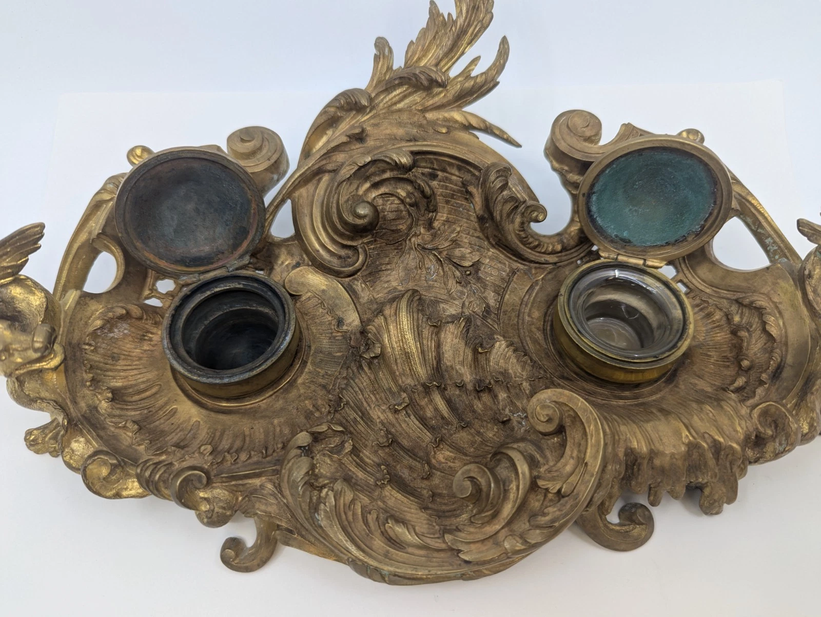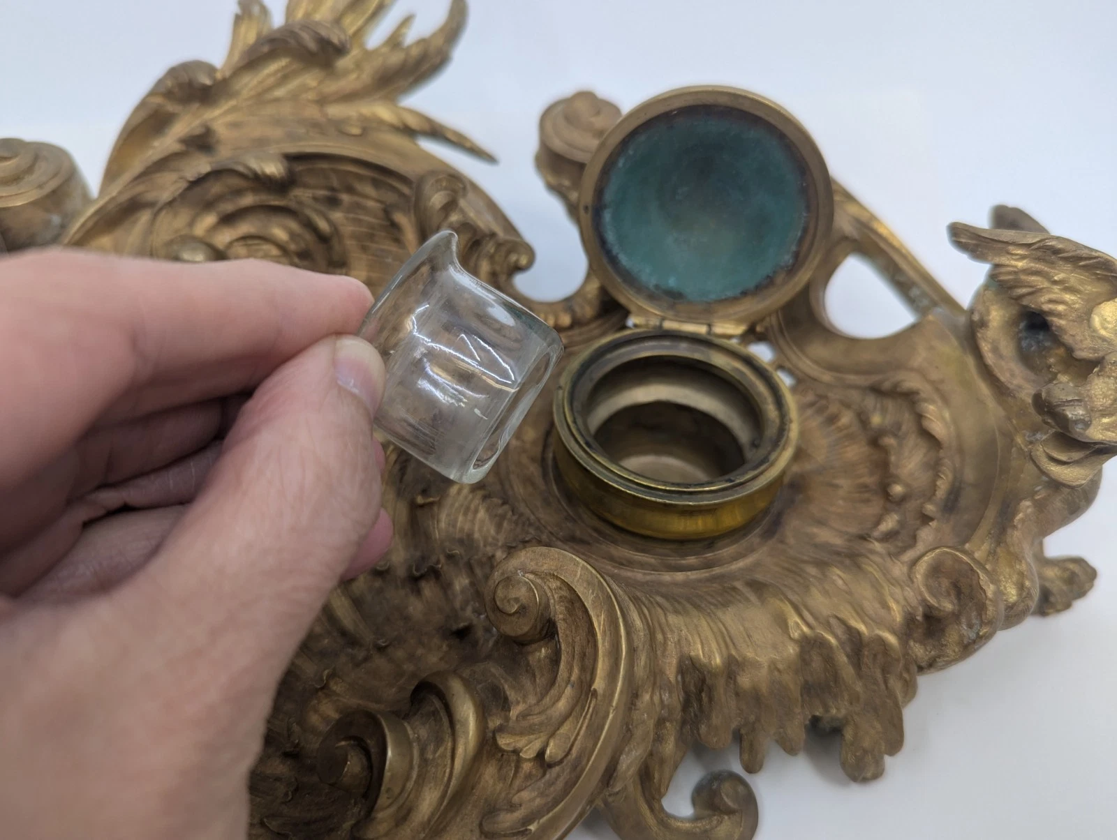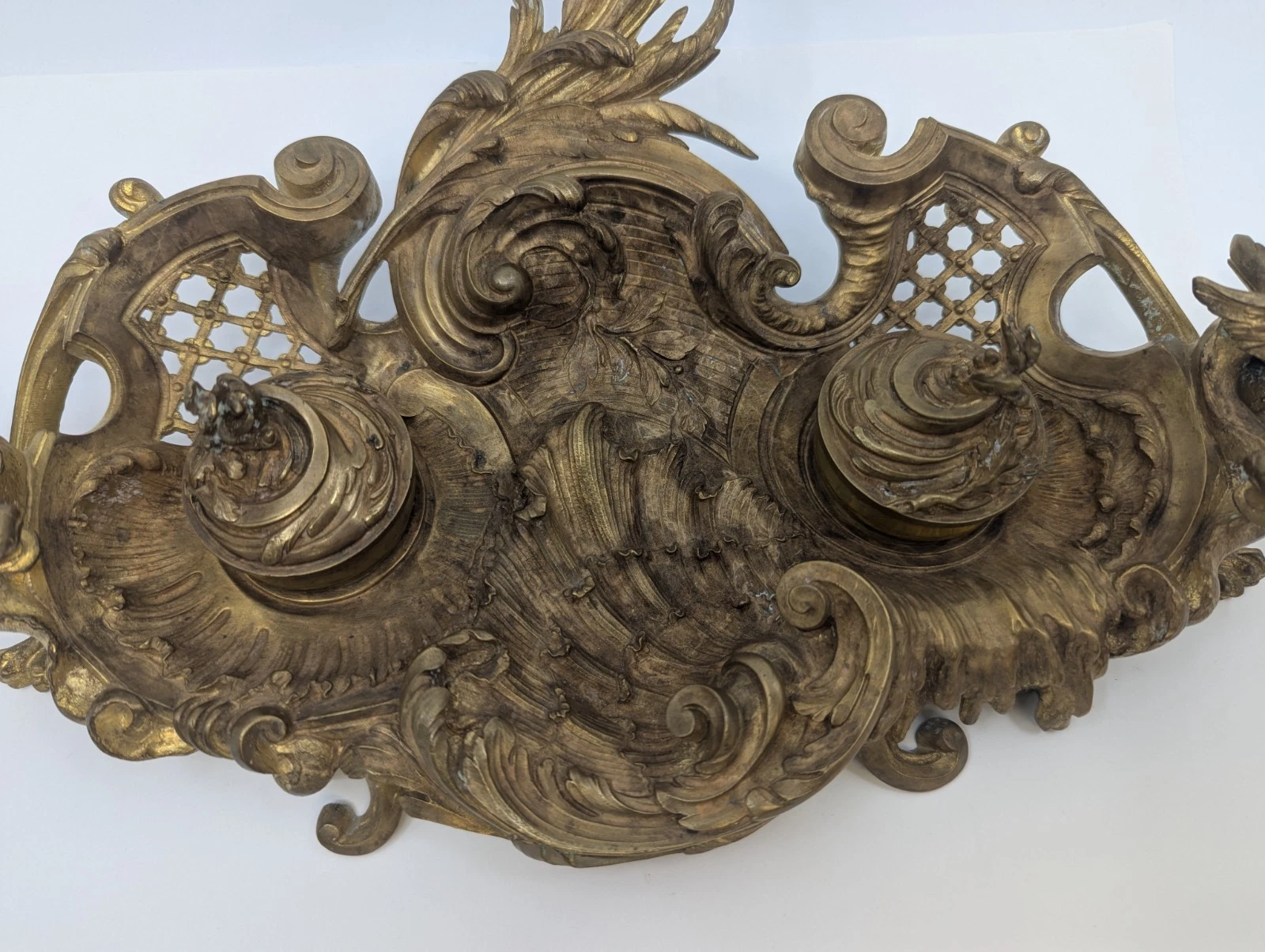 - Material & Style: Cast in bronze, the inkstand features elaborate scrollwork, floral motifs, and high-relief carvings.