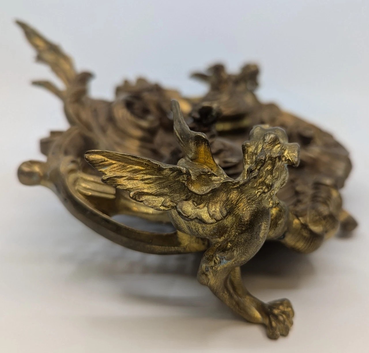 - Mythical Figures: At each end are winged creatures—likely griffins, given their leonine bodies and eagle-like wings. Griffins were popular in Victorian and Art Nouveau design, symbolizing guardianship, strength, and wisdom.
