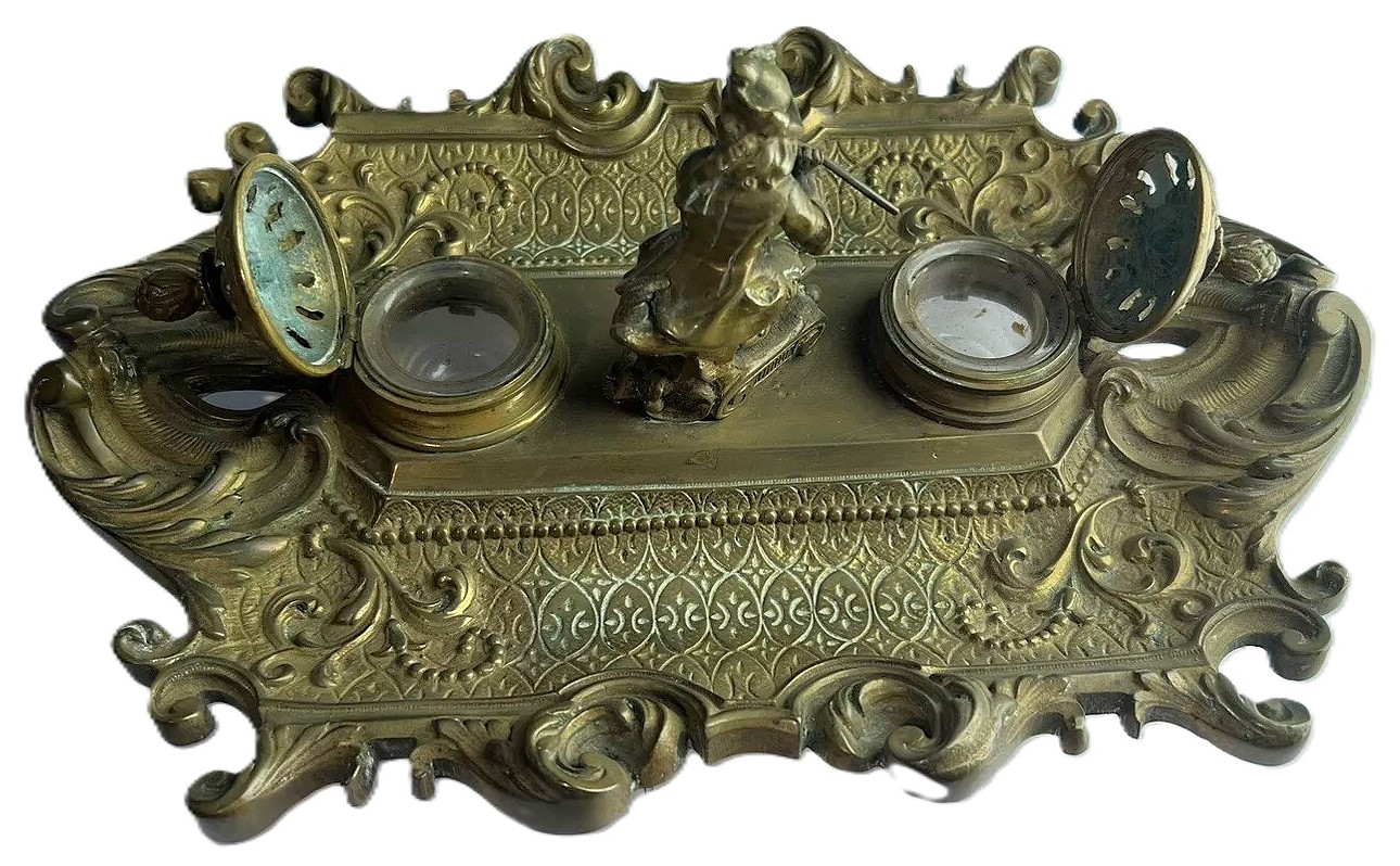 This bronze inkstand features elaborate scrollwork and floral motifs. There are two inkwells with hinged lids on either side of the central figure. This central figure is a detailed sculpture of a person dressed in historical attire, possibly from the 18th or 19th century. The figure is holding a long object that resembles a pipe or a musical instrument, such as a flute or recorder. The person’s posture suggests they are either playing the instrument or examining it closely.