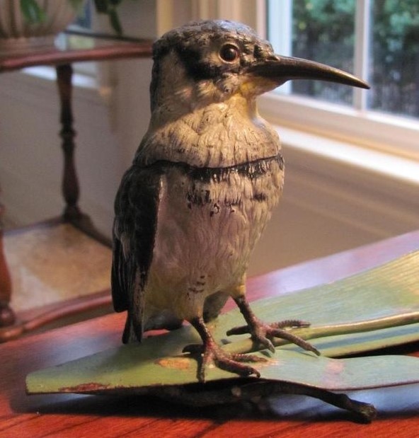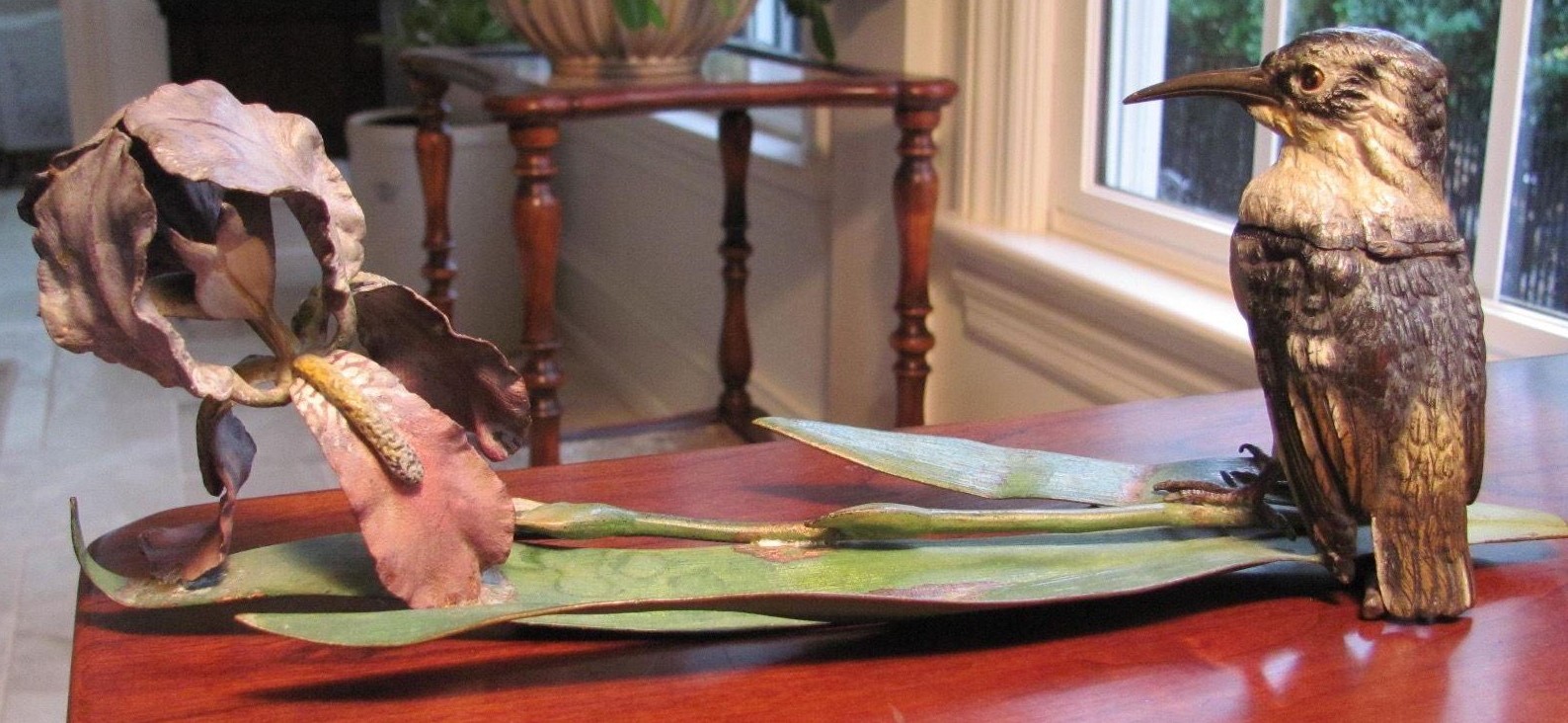 A cold painted bronze kingfisher (its hinged head opens to the inkwell) rests on a stem of iris. There is one full iris bloom (amazing detail) and two buds. The piece is marked “GESCHUTZ” on the base of the branch. Under the tail of the kingfisher are impressed “895”, “GESCHUTZT”, and “DEPOSE”.