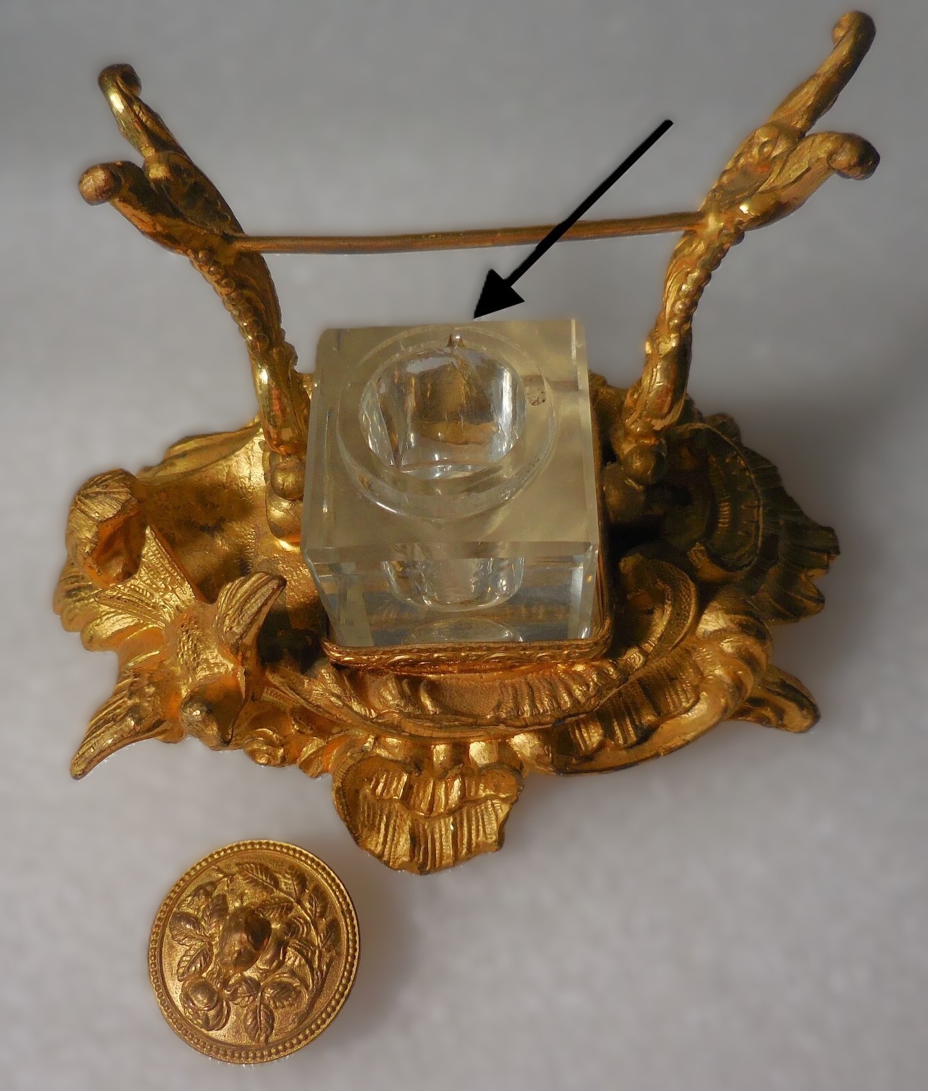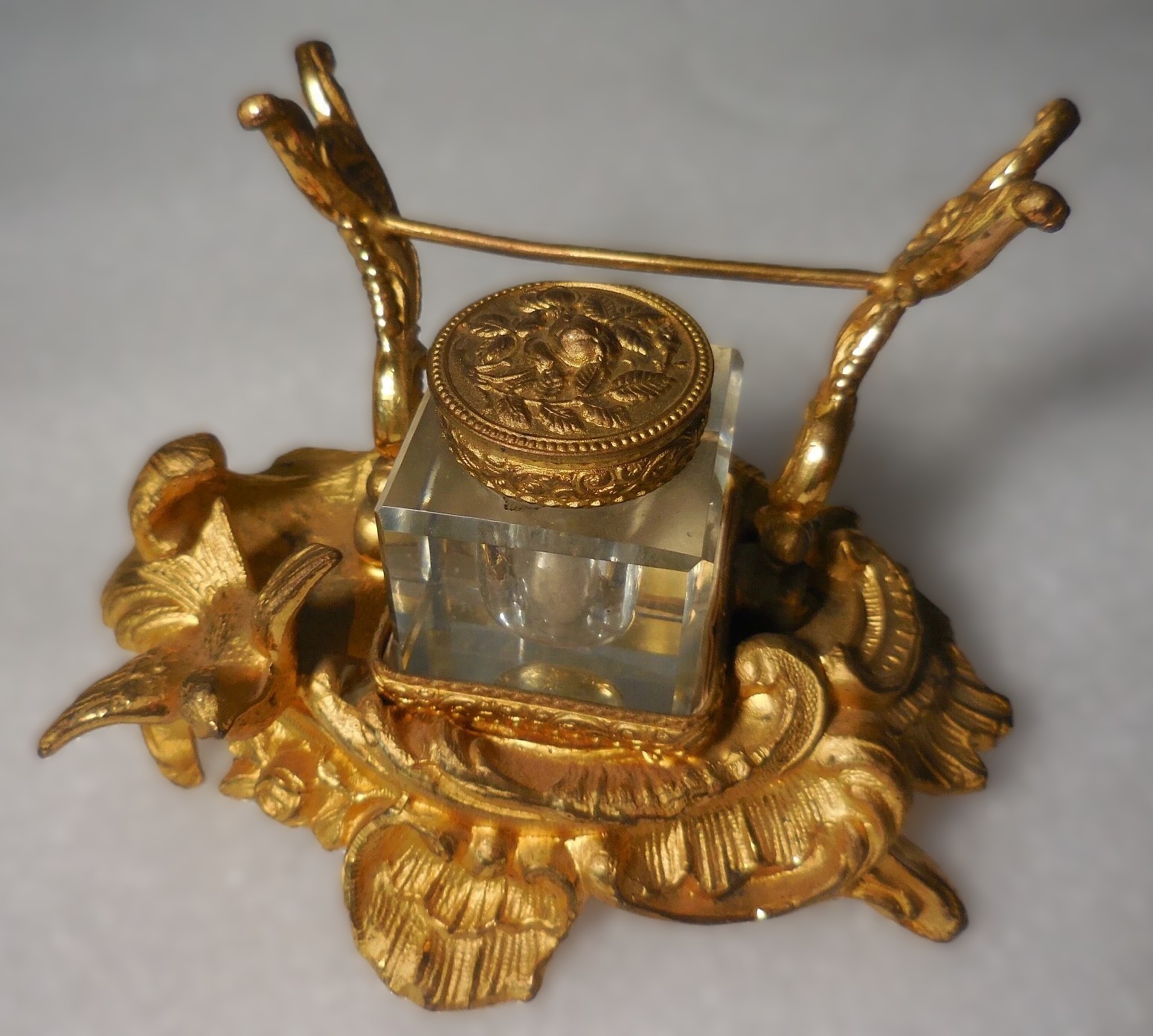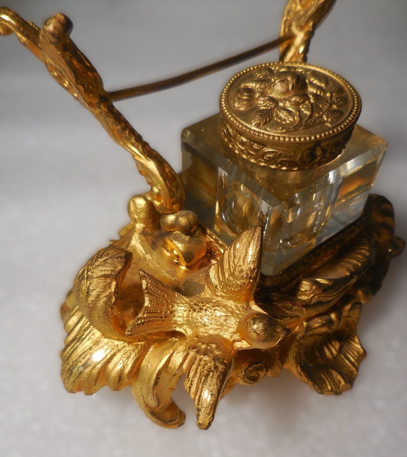 The inkstand is made of gilded bronze (ormolu). The base is an ornate, pierced bronze casting with flowing curves, scrolls, and rococo-style decoration. A glass inkwell is fitted into a recess on the base. It has an unattached circular lid decorated with a repoussé design of a rose and leaves. Repoussé is a metalworking technique where a malleable metal is hammered into a relief from the reverse side. A tall, graceful arm rising from the base acts as a pen holder , curving over the inkwell. A small bird is perched on a branch to the side of the inkwell, as if it has just alighted.