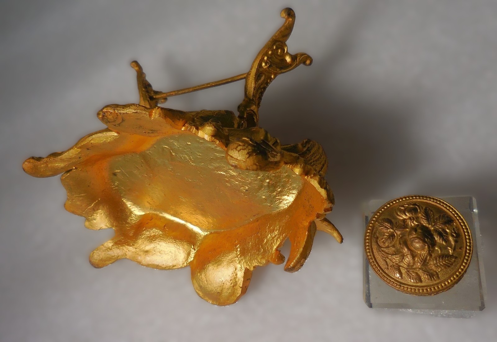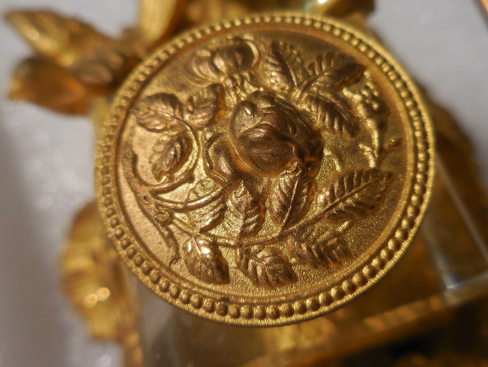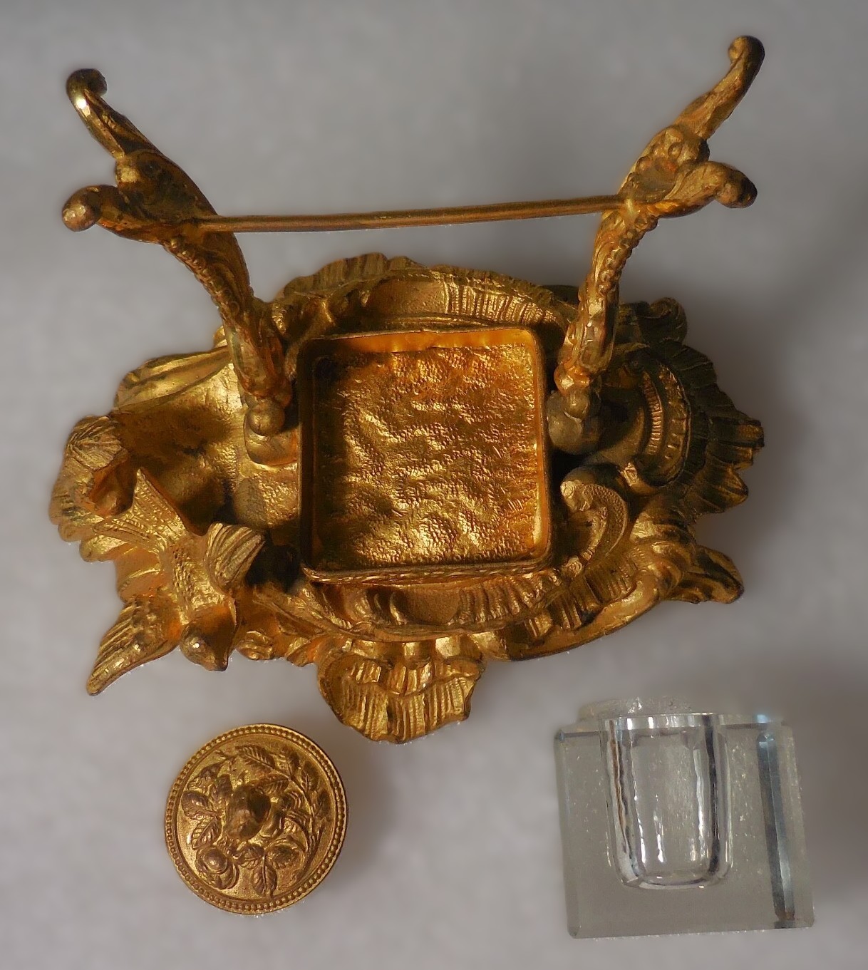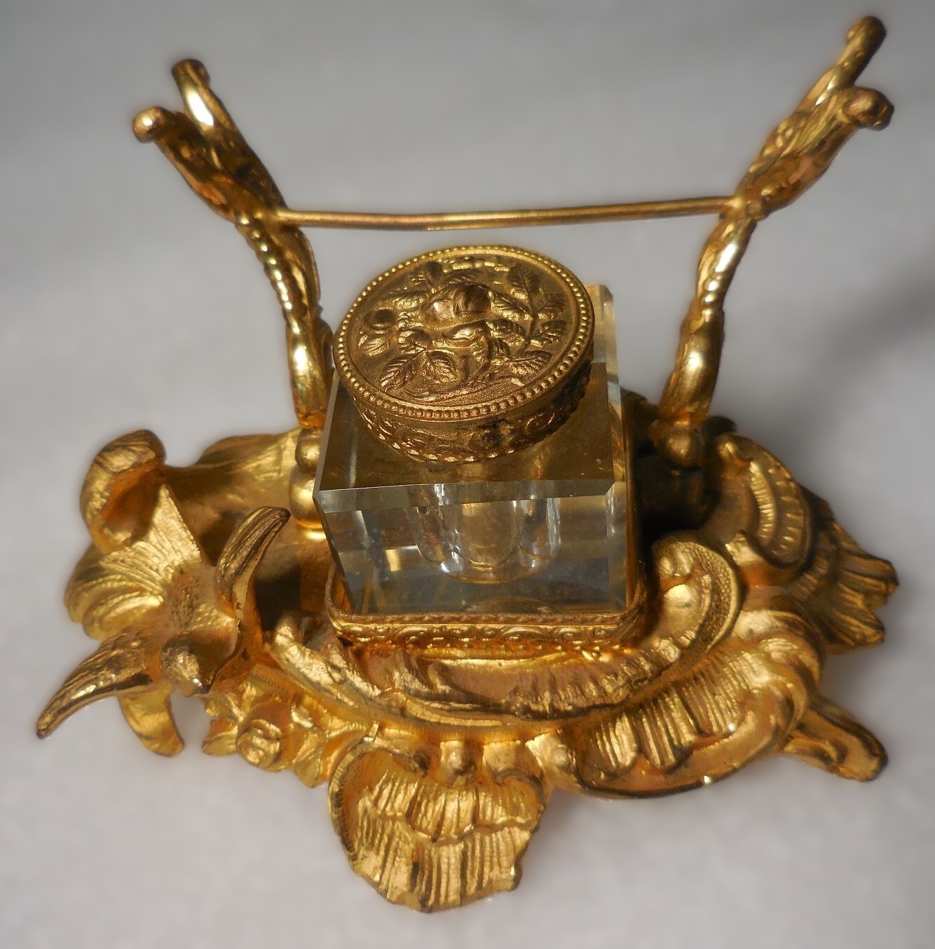 The inkstand is made of gilded bronze (ormolu). The base is an ornate, pierced bronze casting with flowing curves, scrolls, and rococo-style decoration. A glass inkwell is fitted into a recess on the base. It has an unattached circular lid decorated with a repoussé design of a rose and leaves. Repoussé is a metalworking technique where a malleable metal is hammered into a relief from the reverse side. A tall, graceful arm rising from the base acts as a pen holder , curving over the inkwell. A small bird is perched on a branch to the side of the inkwell, as if it has just alighted.