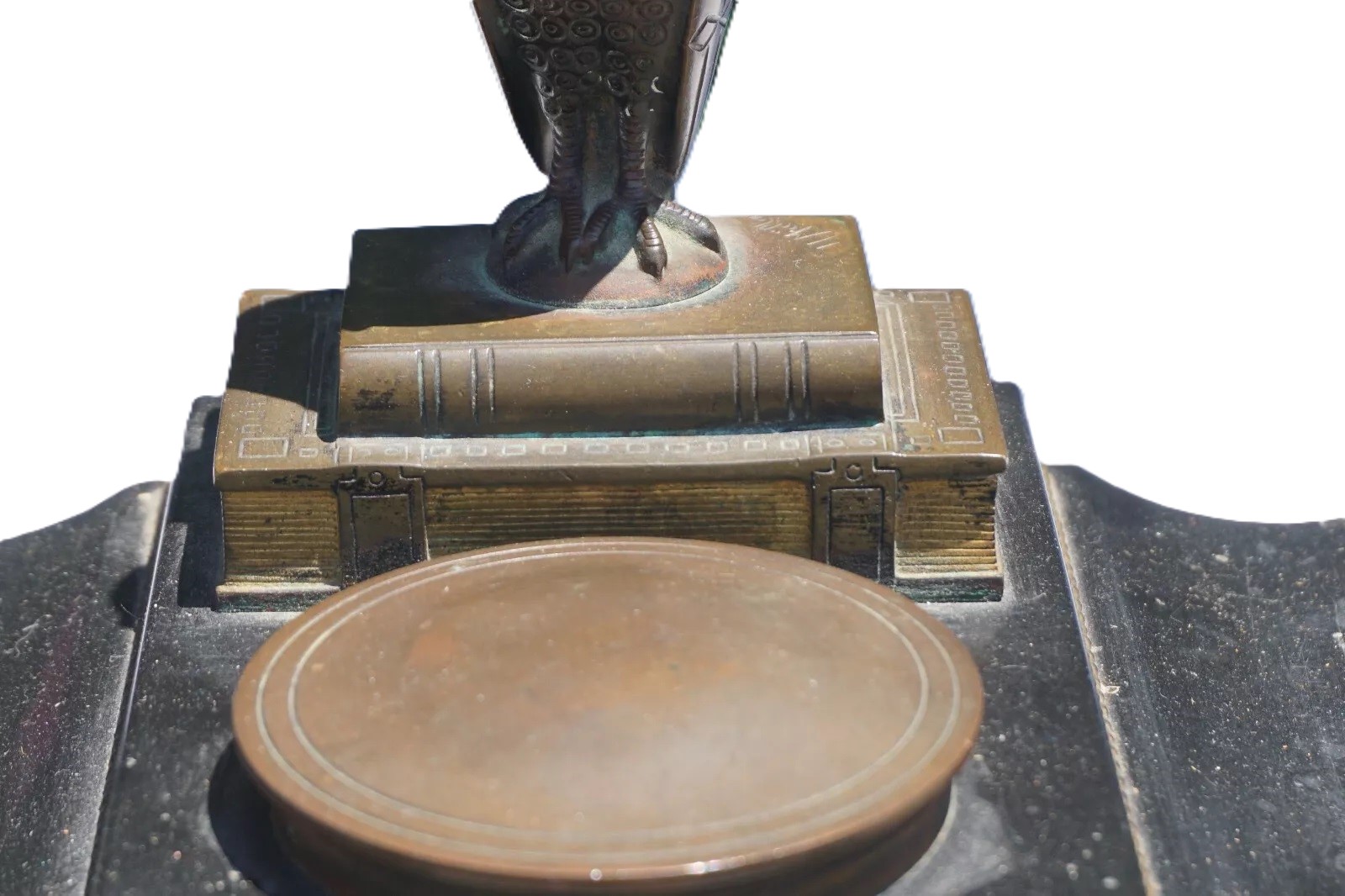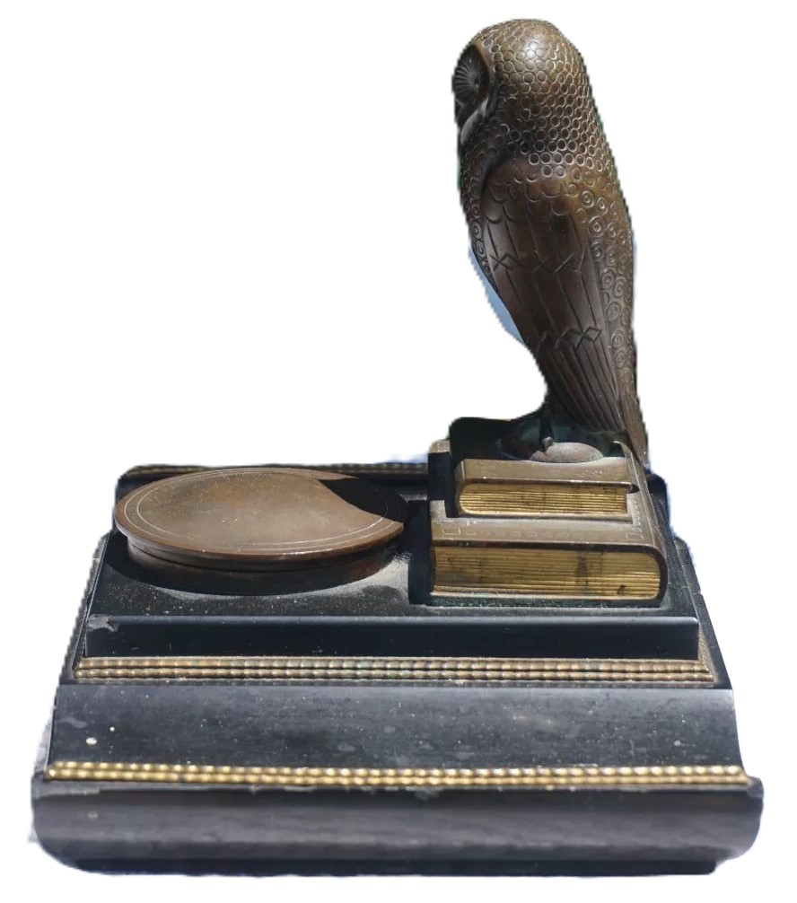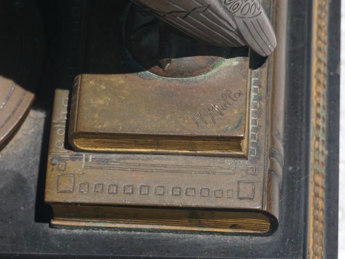 This inkstand features a vigilant owl perched atop a stack of books. The owl and books are made of bronze. In front of the owl, there’s an inkwell with a hinged lid. The base of the inkstand is made of polished black stone and includes curved indentations on either side, serving as pen trays. The piece is signed “H. Müller”.