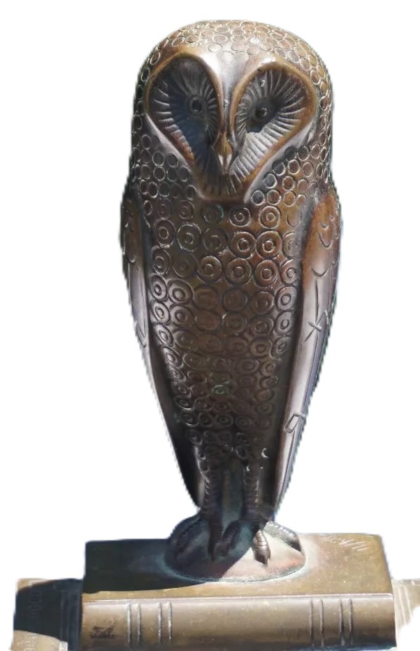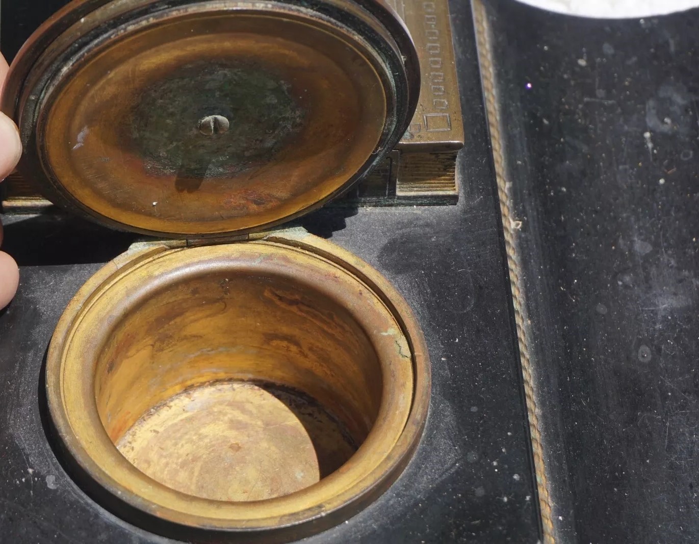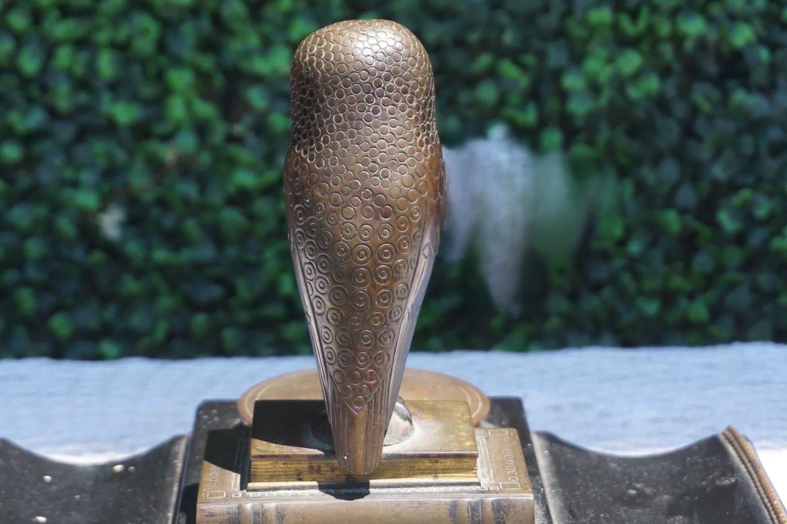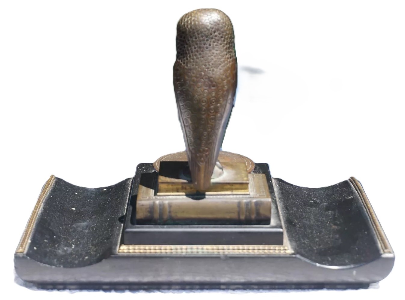 This inkstand features a vigilant owl perched atop a stack of books. The owl and books are made of bronze. In front of the owl, there’s an inkwell with a hinged lid. The base of the inkstand is made of polished black stone and includes curved indentations on either side, serving as pen trays. The piece is signed “H. Müller”.