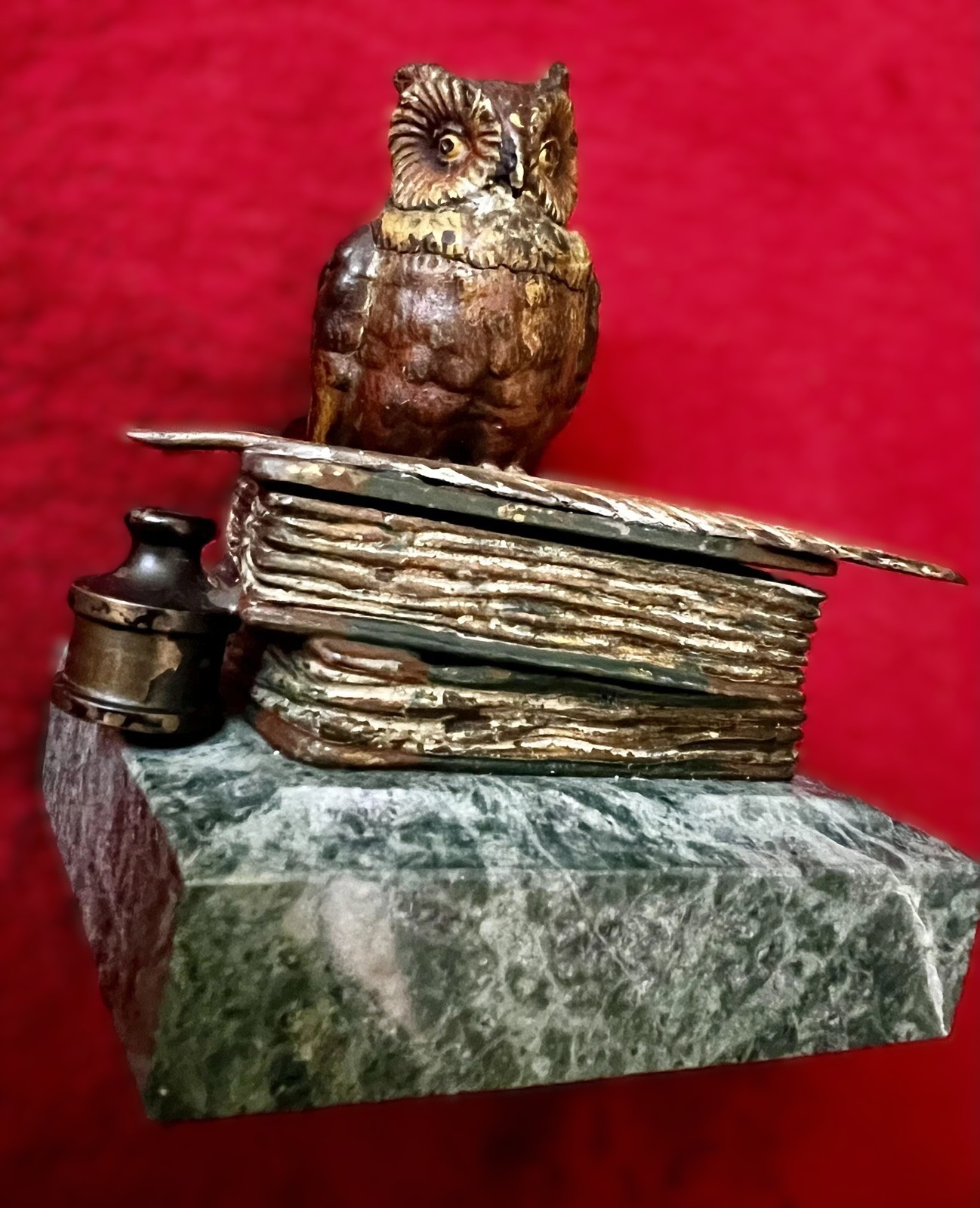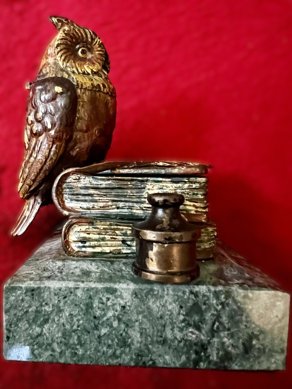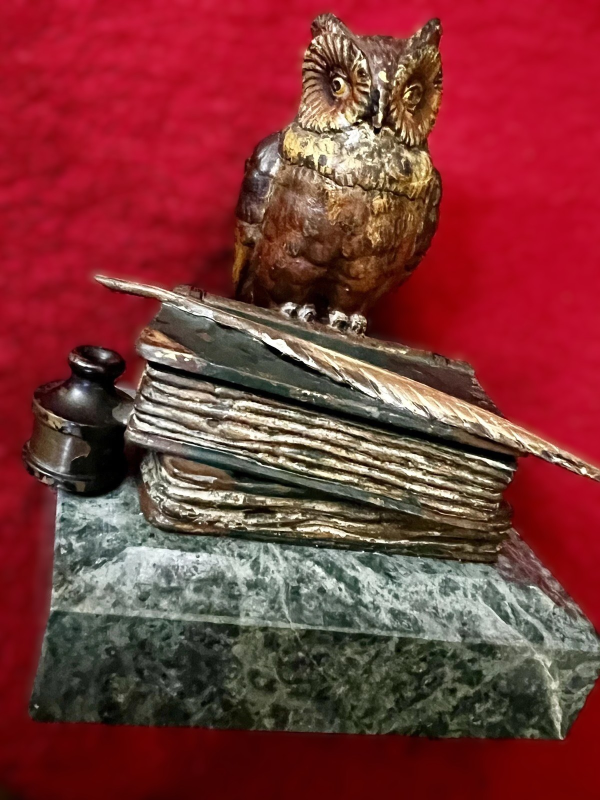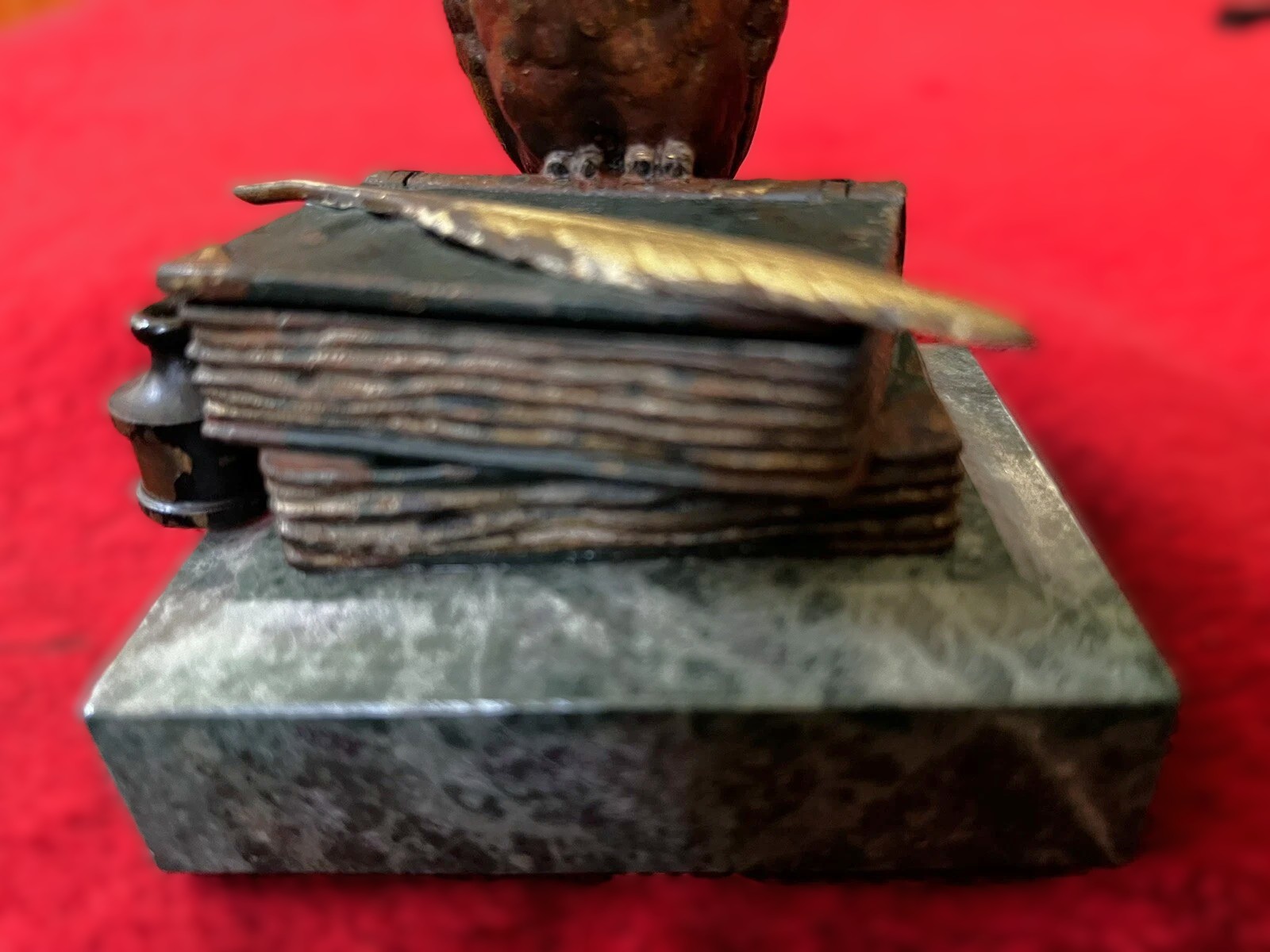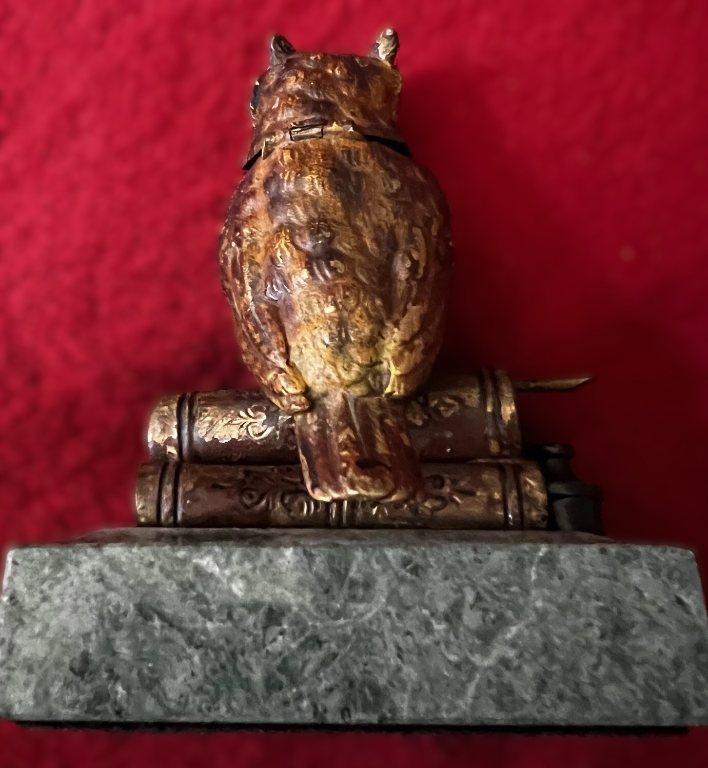 This Austrian cold-painted bronze inkstand features a figural owl perched atop a stack of antique books, mounted on a solid dark green marble or serpentine base.