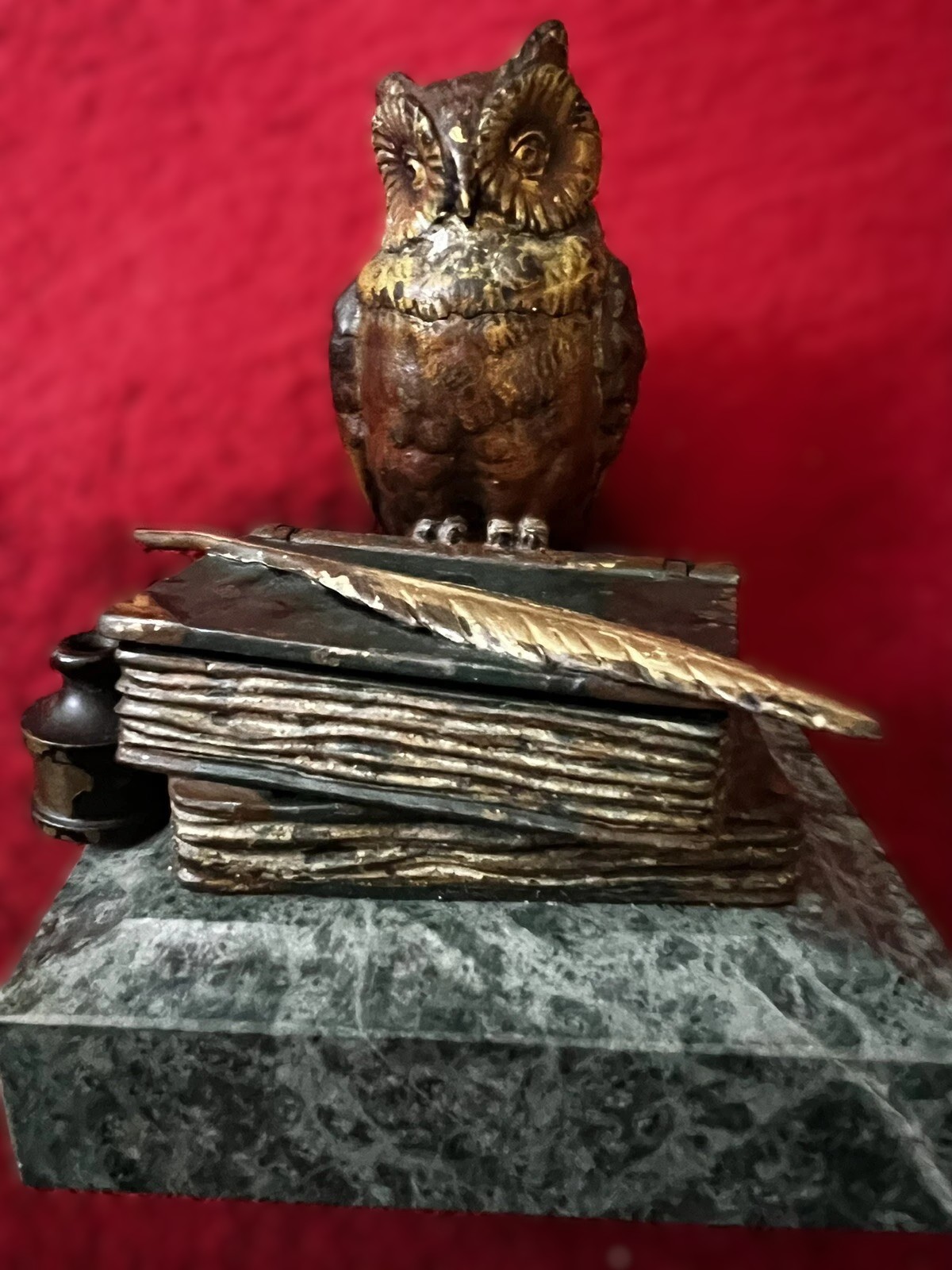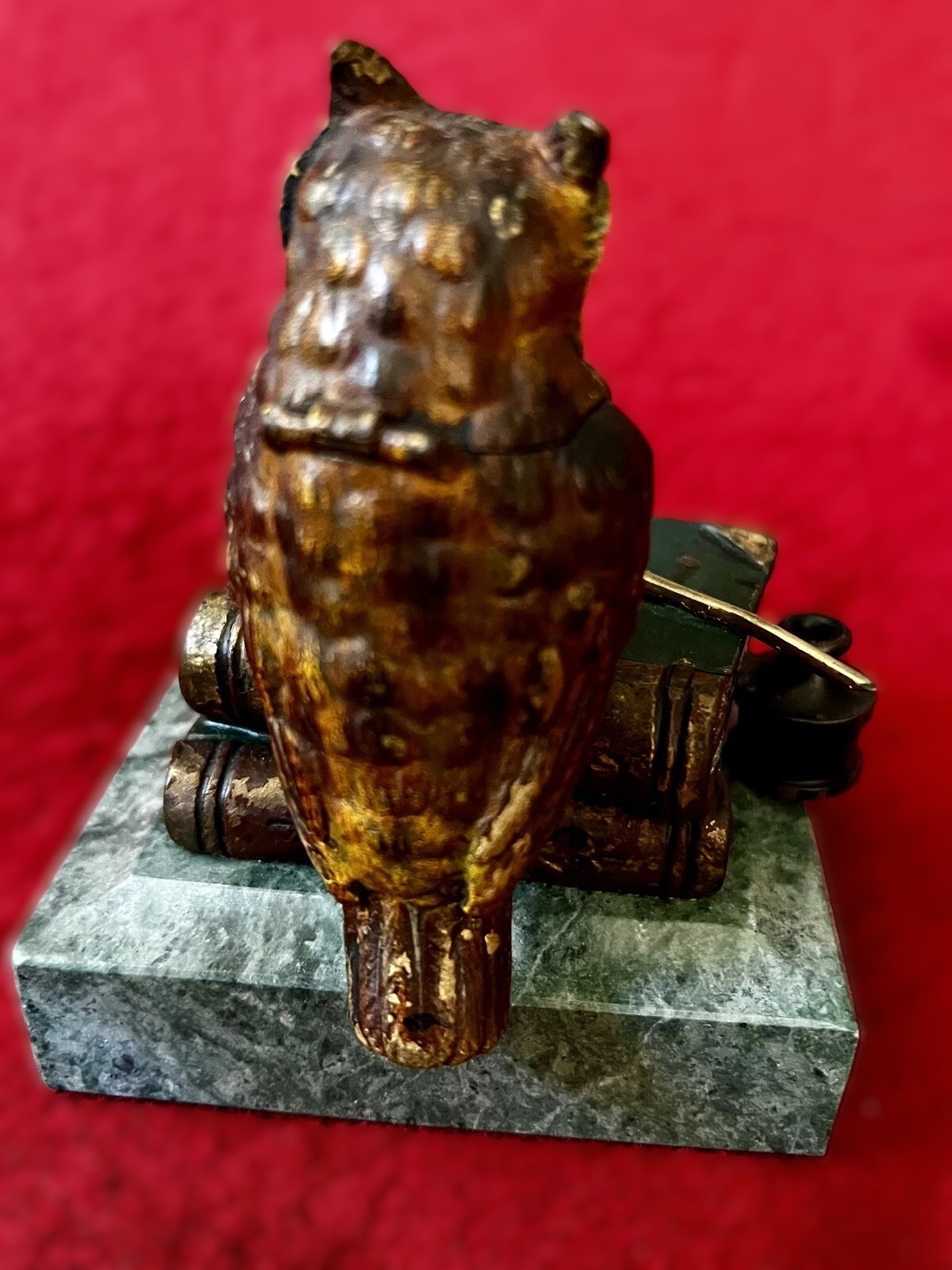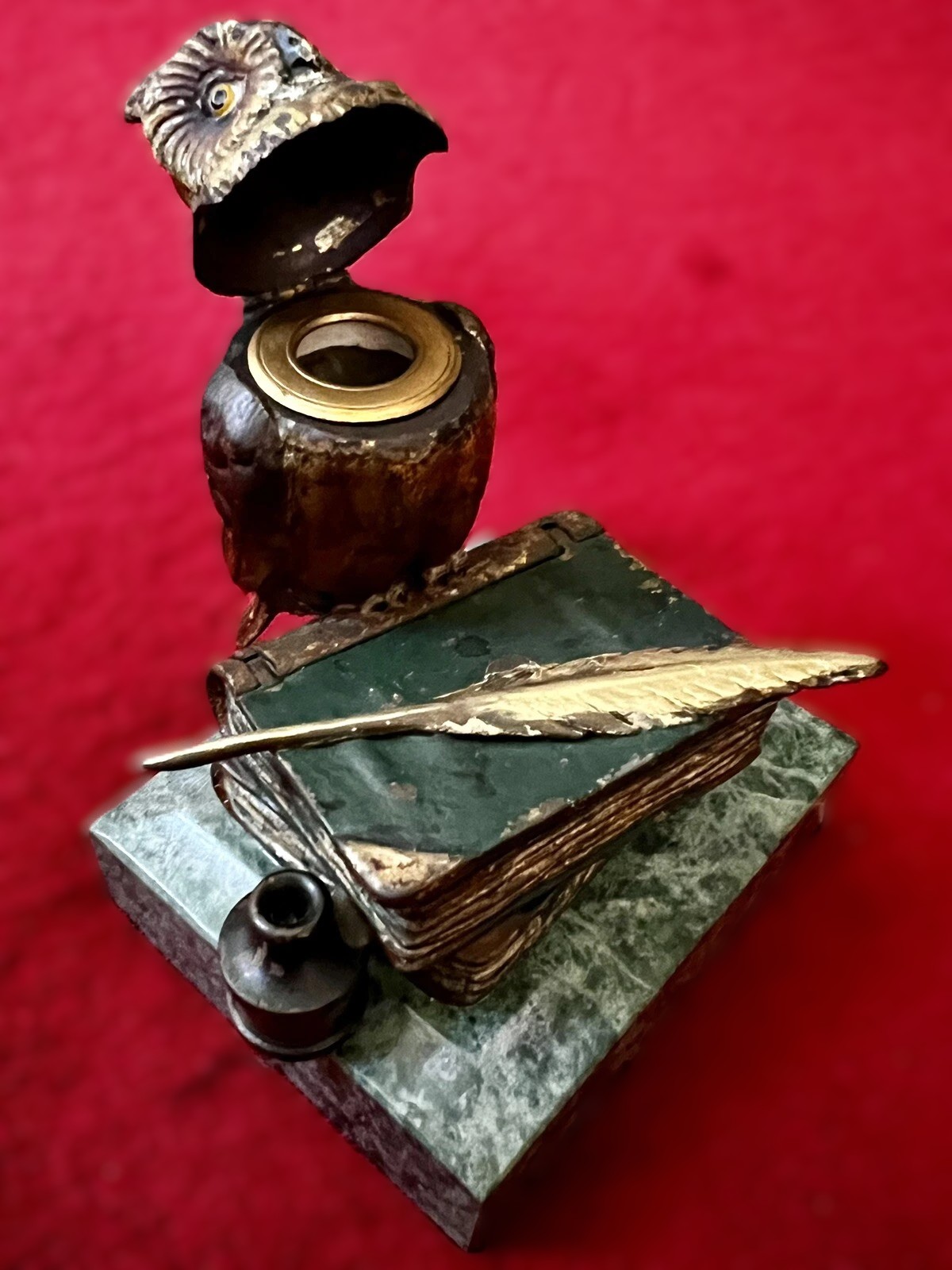 - The Owl: The owl is a finely cast “animalier” figure with detailed feathering and large, expressive eyes. The head is hinged and tilts back to reveal a glass inkwell insert.