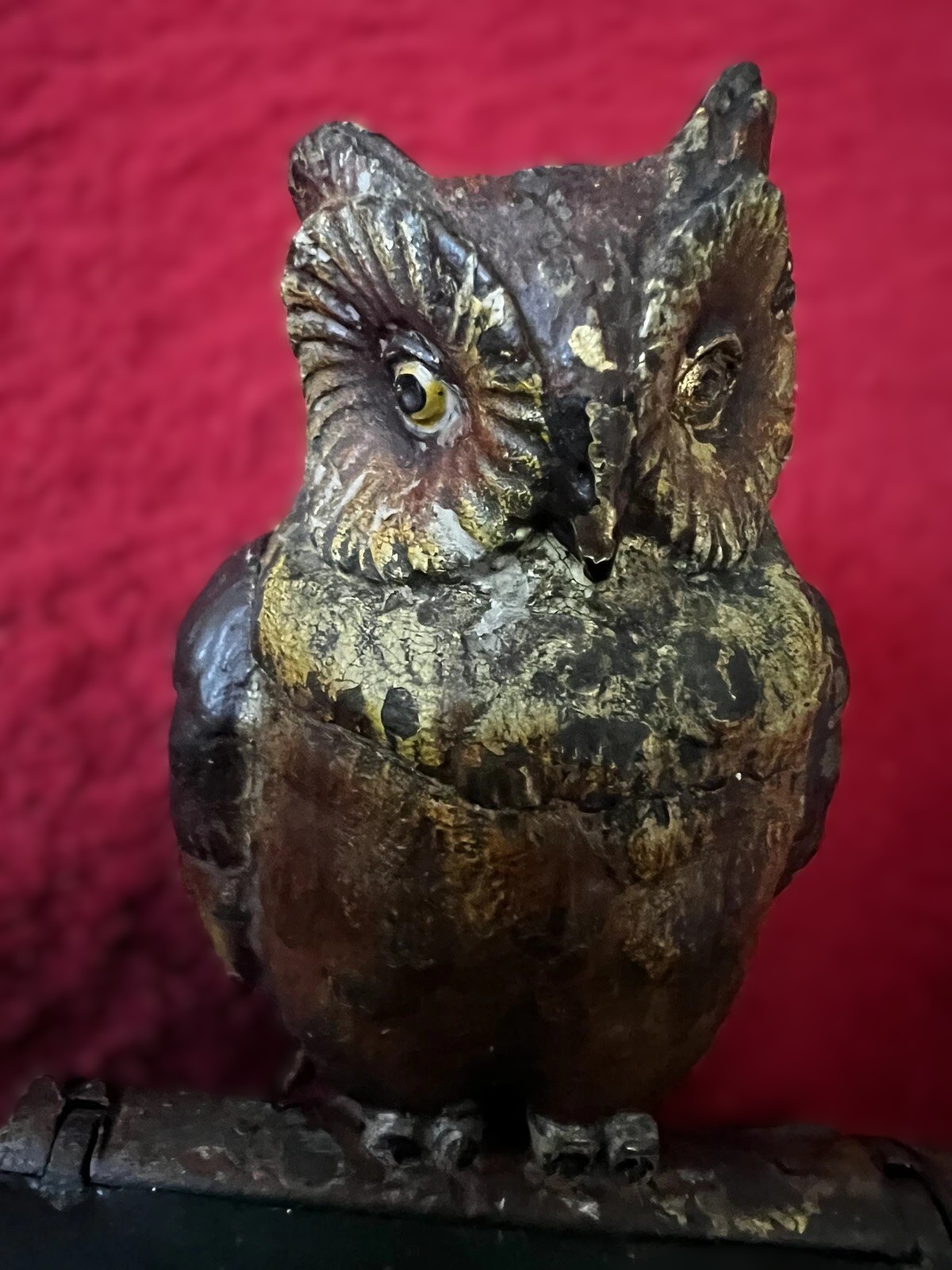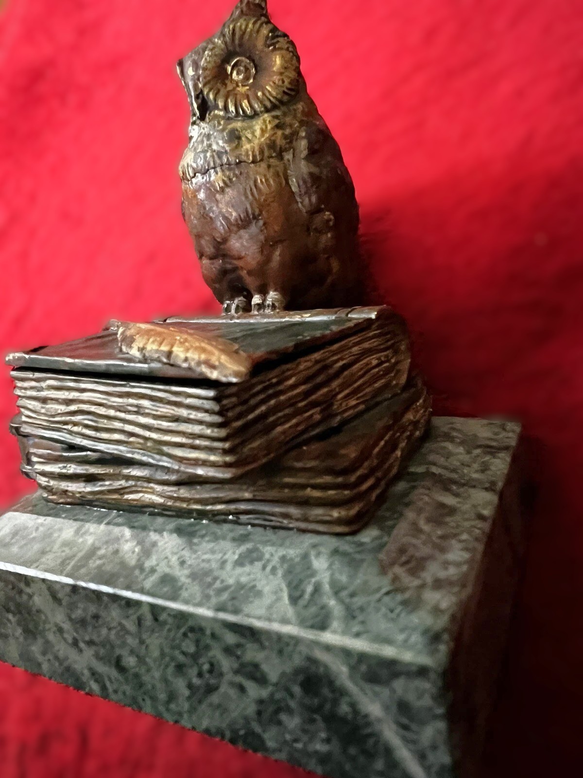 - Cold-Painted Technique: The bronze has a multi-tonal patina—often called “cold-painting”—where layers of oil-based pigments were applied to the cast metal without firing, resulting in the lifelike colors seen on the owl and the “aged” look of the books.