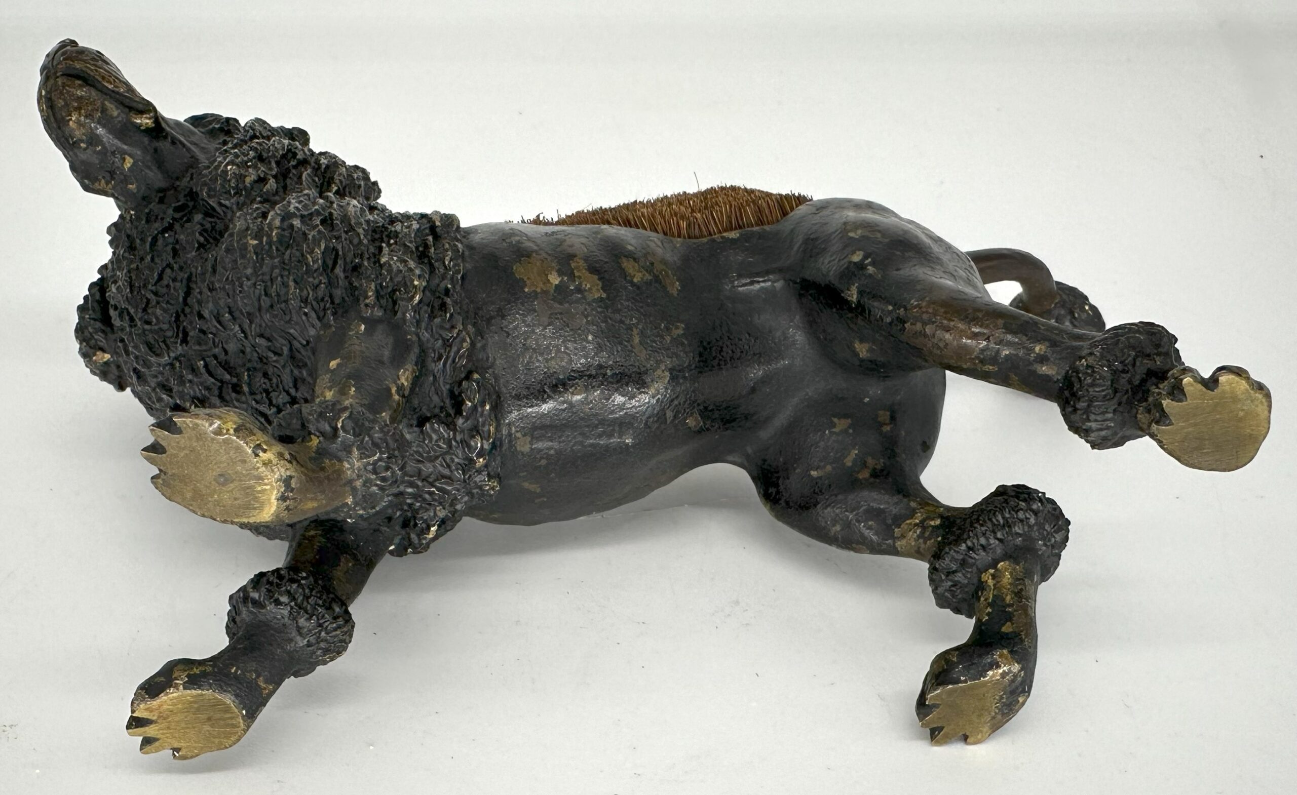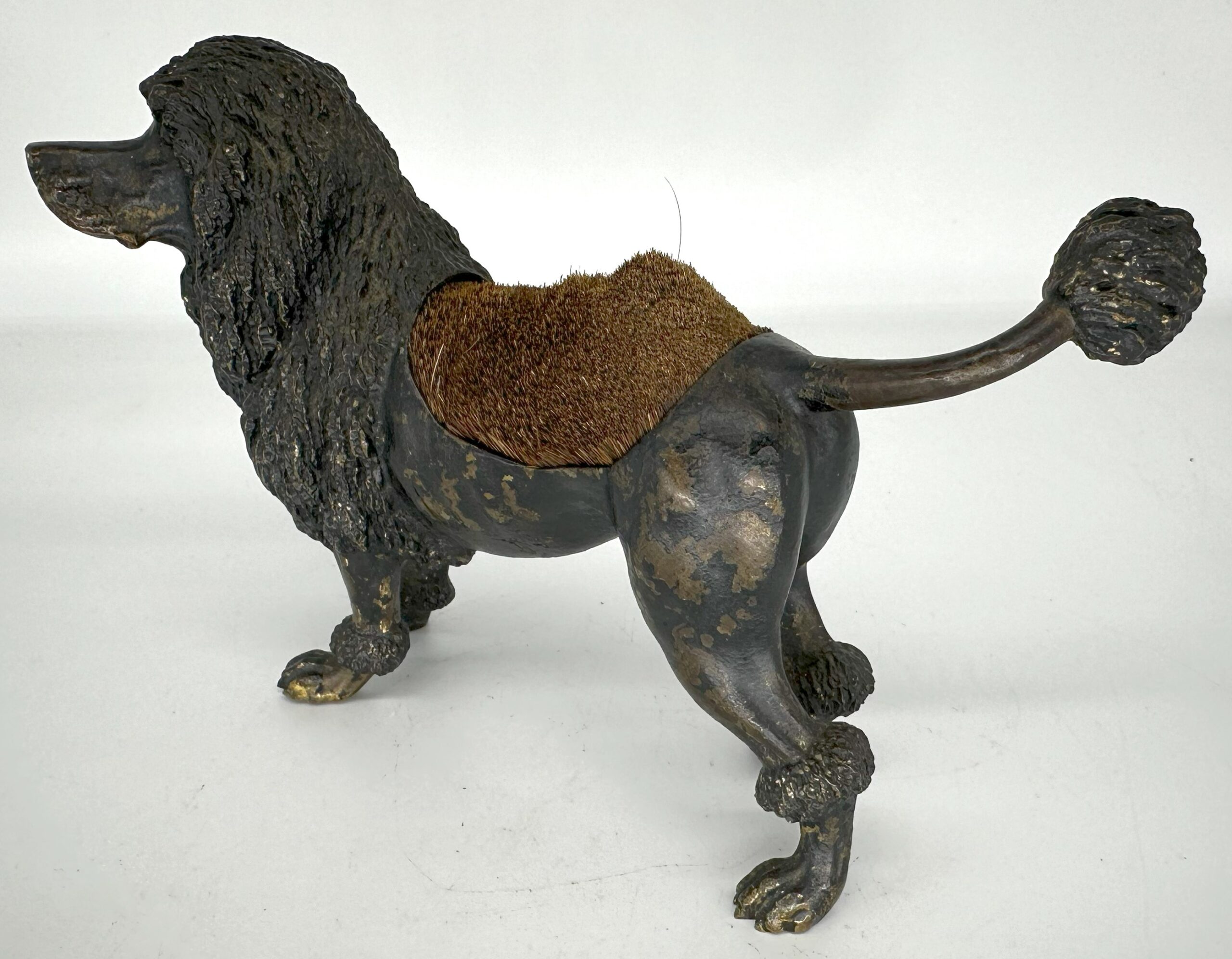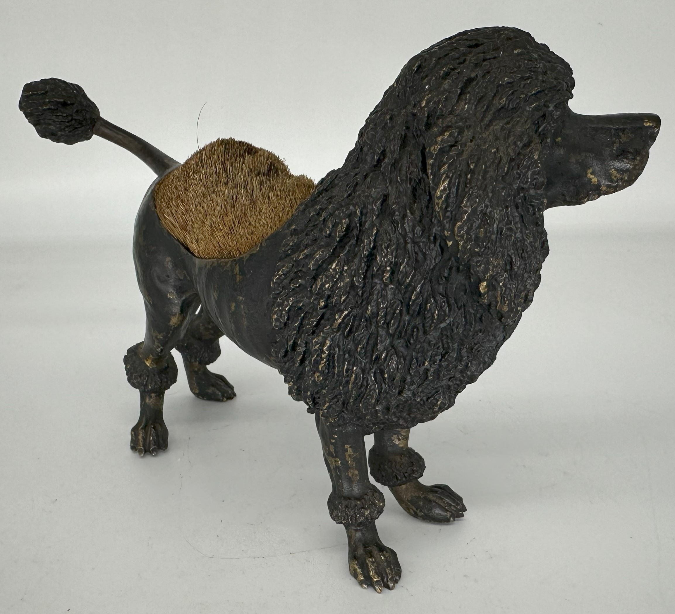 This bronze poodle pen wipe is intricately detailed, capturing the texture of its fur and its poised stance. The material on the back is boar’s bristle. Boar’s bristle was commonly used in pen wipes for its stiff and durable texture, making it effective for cleaning ink from pens.