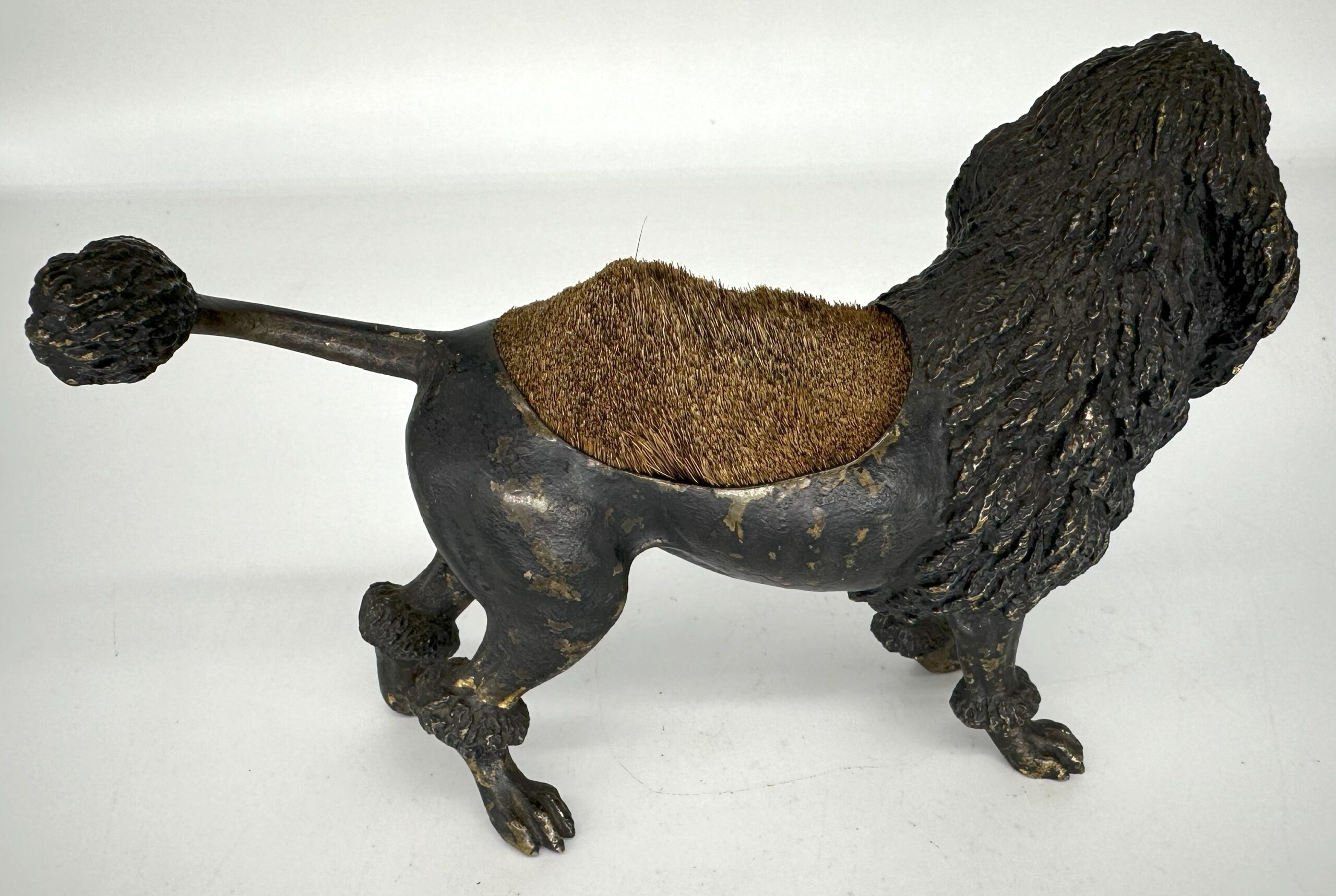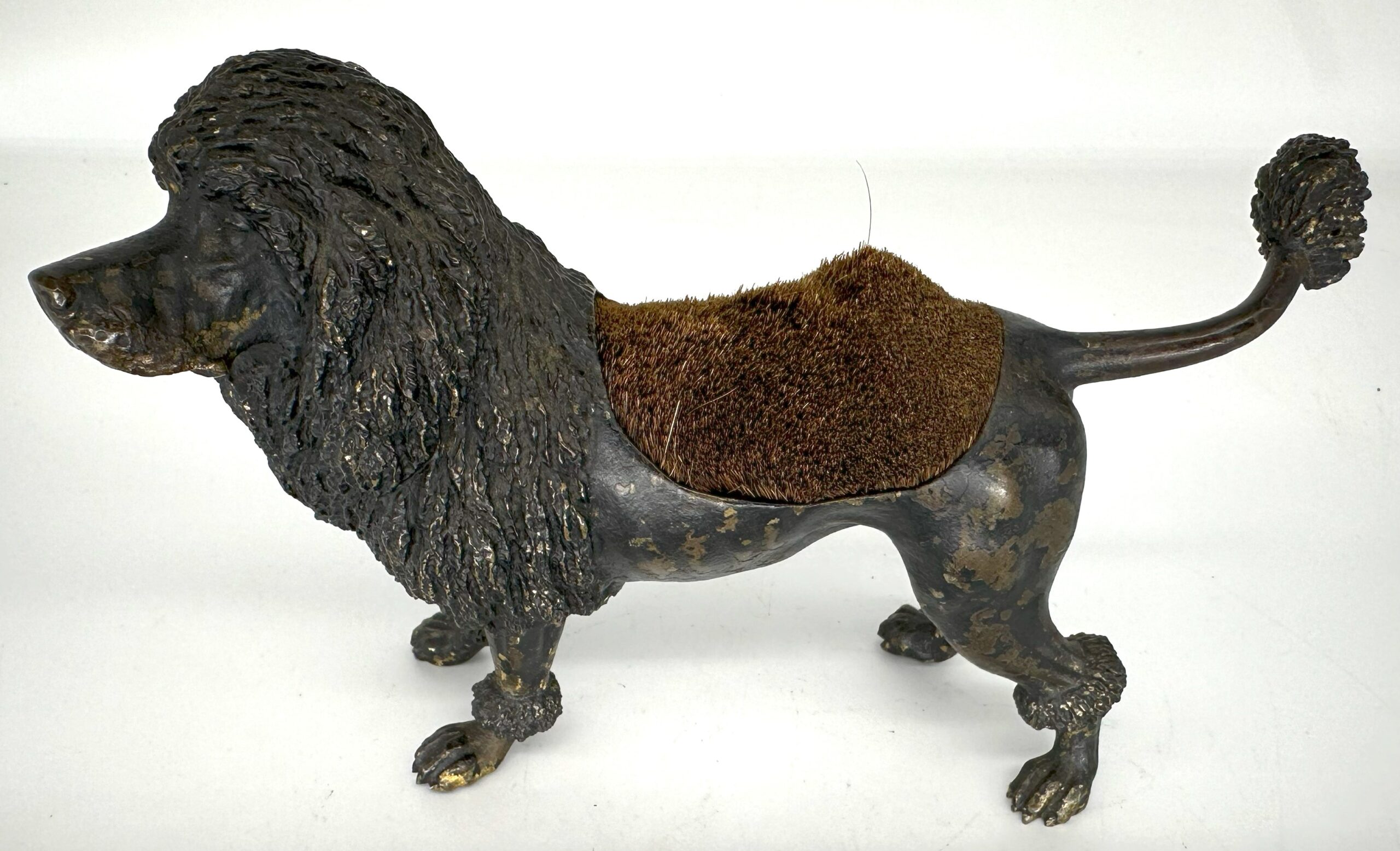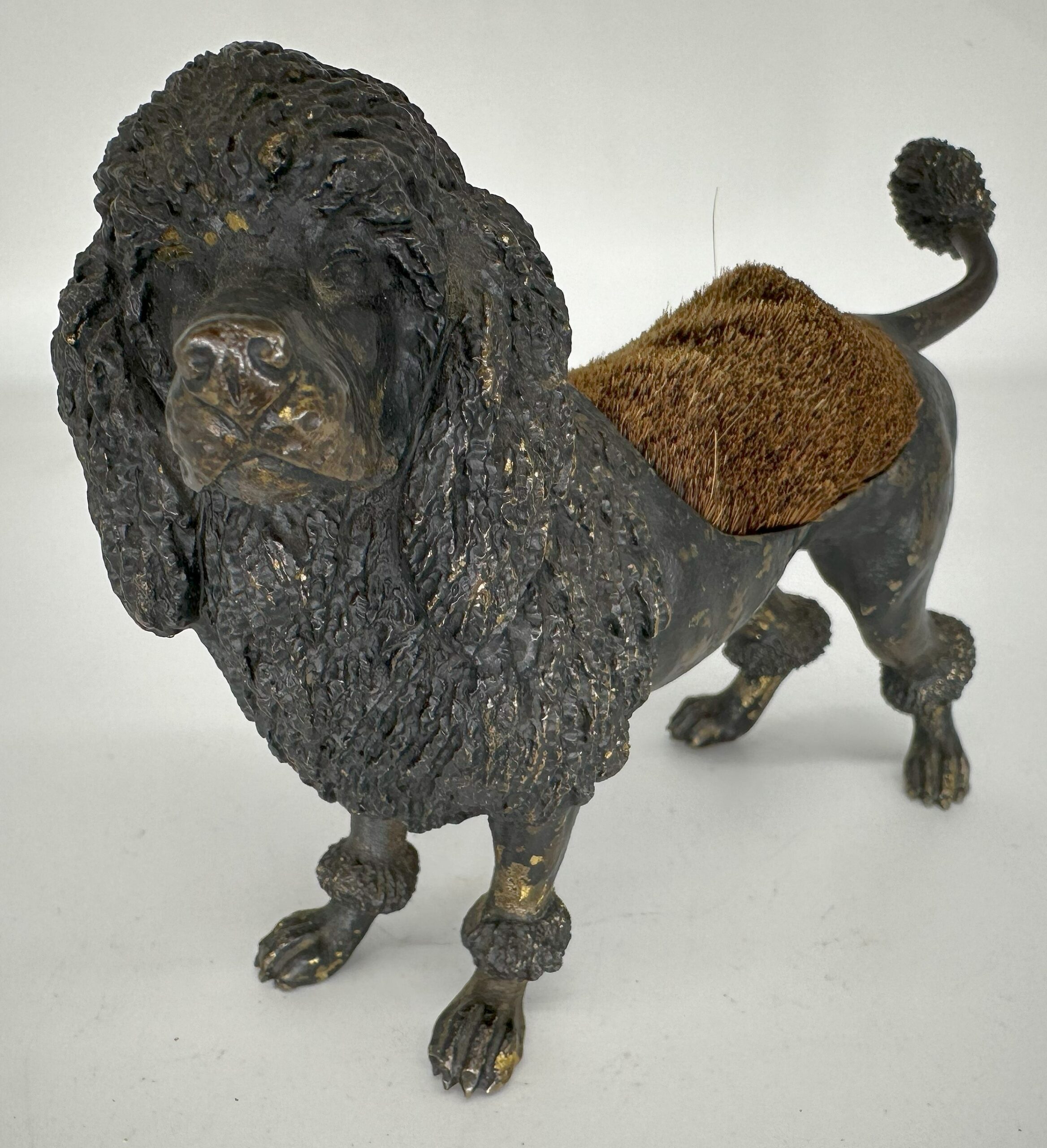 This bronze poodle pen wipe is intricately detailed, capturing the texture of its fur and its poised stance. The material on the back is boar’s bristle. Boar’s bristle was commonly used in pen wipes for its stiff and durable texture, making it effective for cleaning ink from pens.