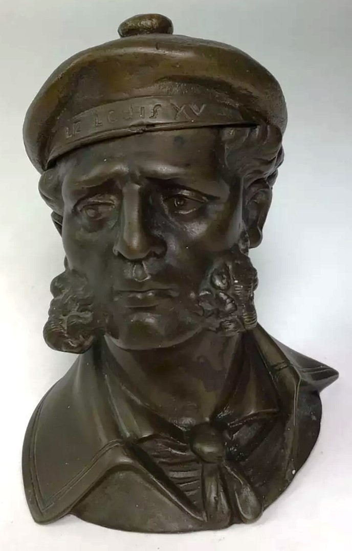 An inkwell in the form of a bronze bust of a man in sailor’s attire wearing a beret. The headband of the beret is inscribed “Le Louis XV”. The man’s face is detailed with prominent facial hair, including mutton chops, which were a popular style during the 18th century. The hat is hinged and can be lifted to reveal a glass inkwell inside, which is secured with cork.