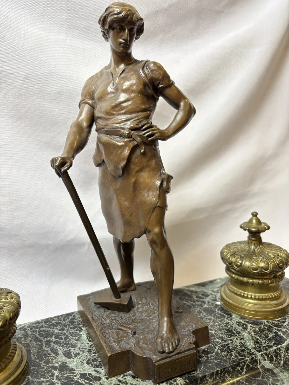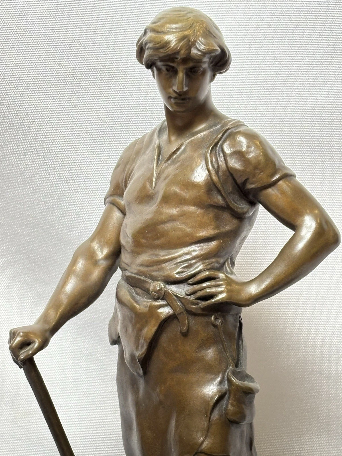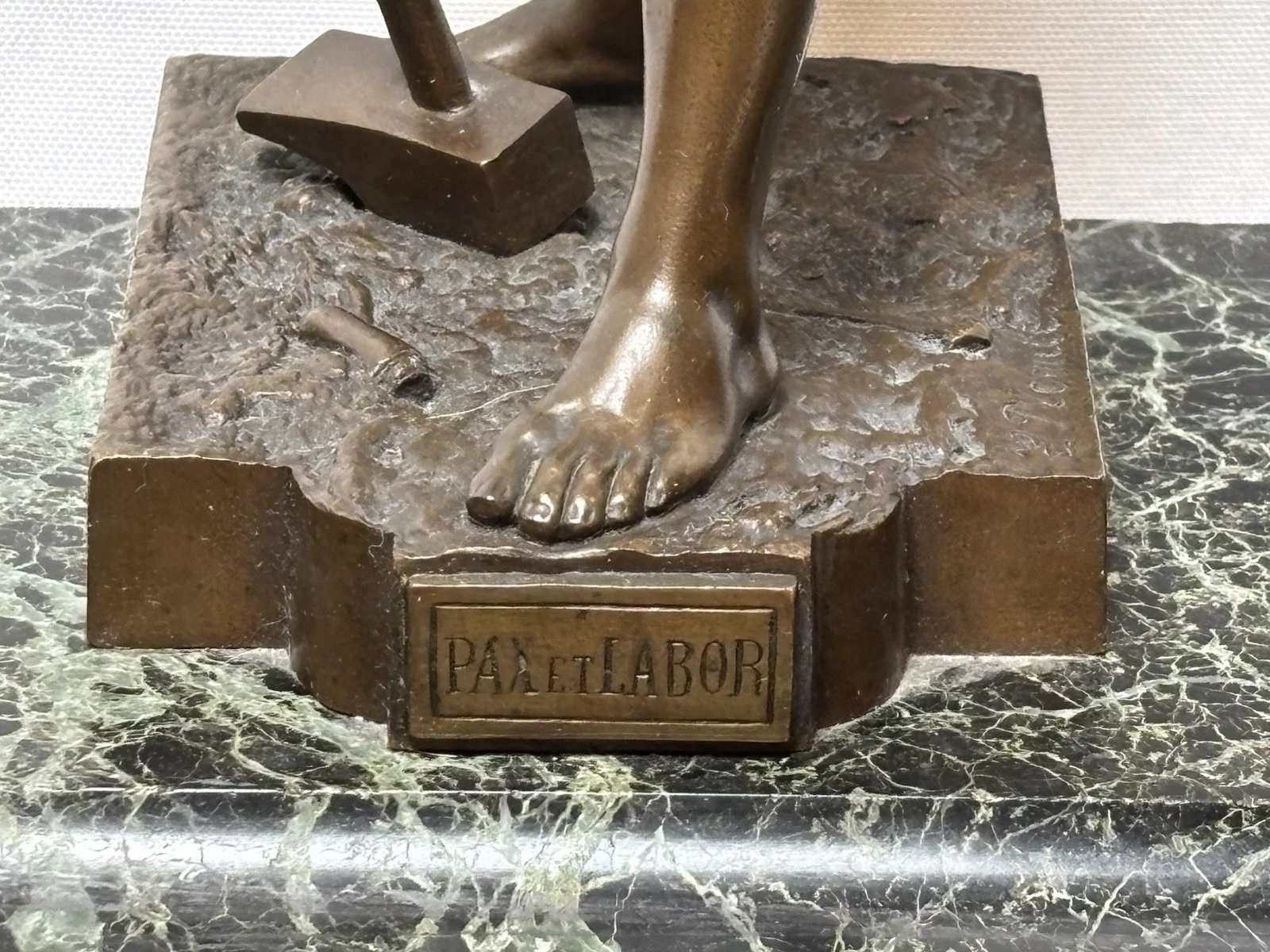 - The Sculpture: The central bronze sculpture depicts a man, likely a laborer or a blacksmith, standing in a dynamic, powerful pose. He is shown with a muscular physique, suggesting strength and physical work. He is partially draped in a leather apron, and in his right hand, he holds a large sledgehammer, the head of which rests on the base beside his foot. The sculpture is signed “E. Picault” and has a title plaque that reads “Pax et Labor.”