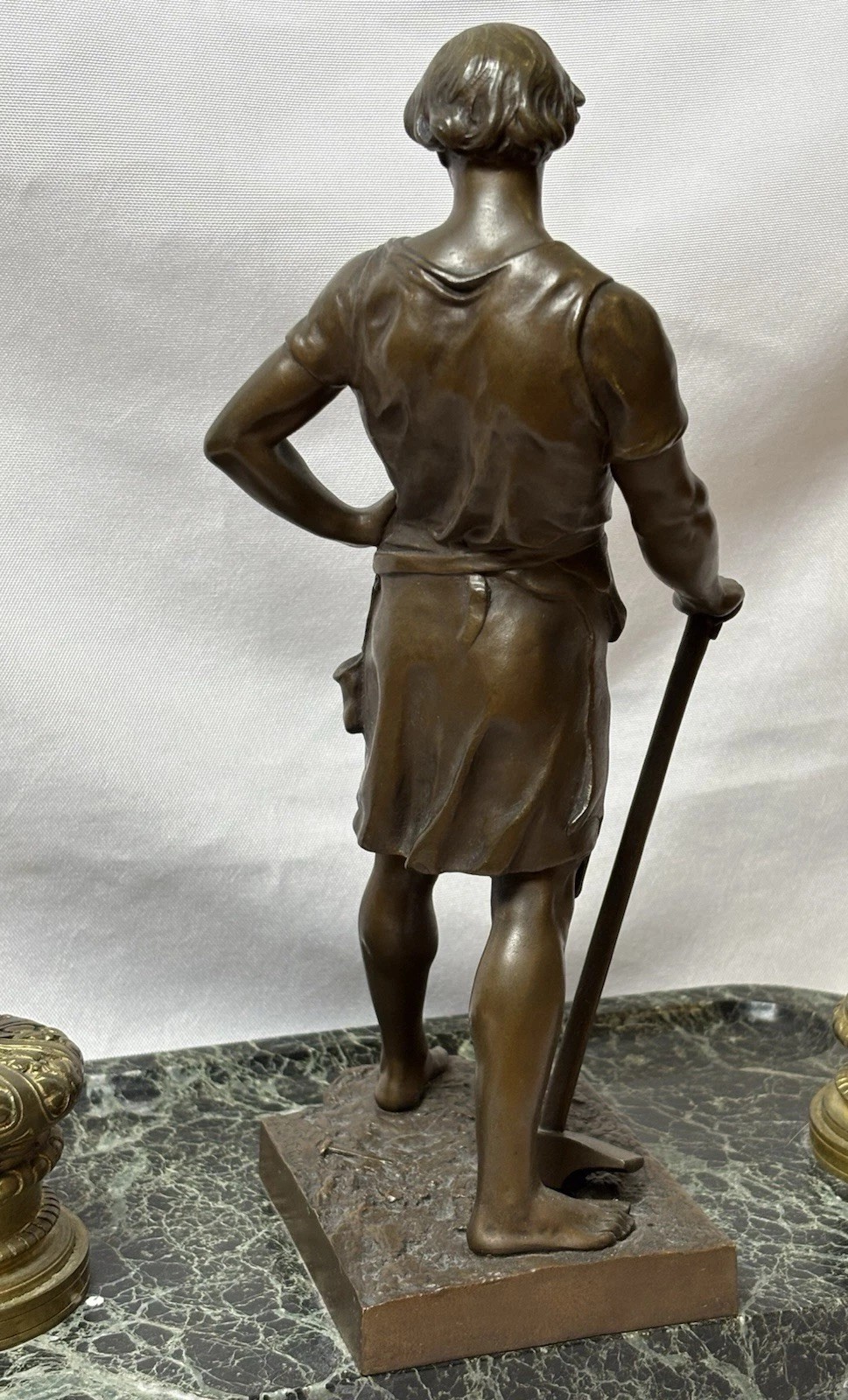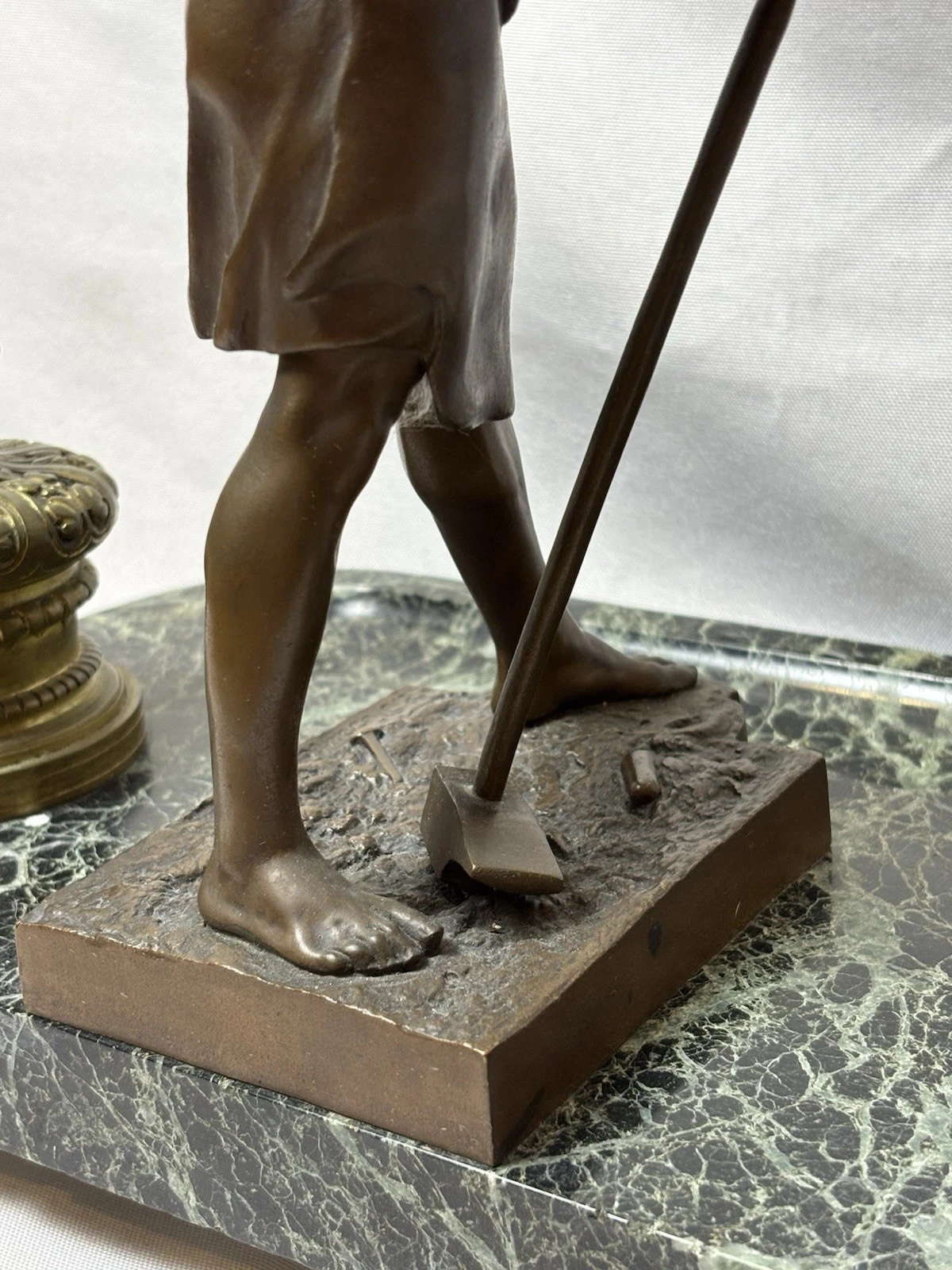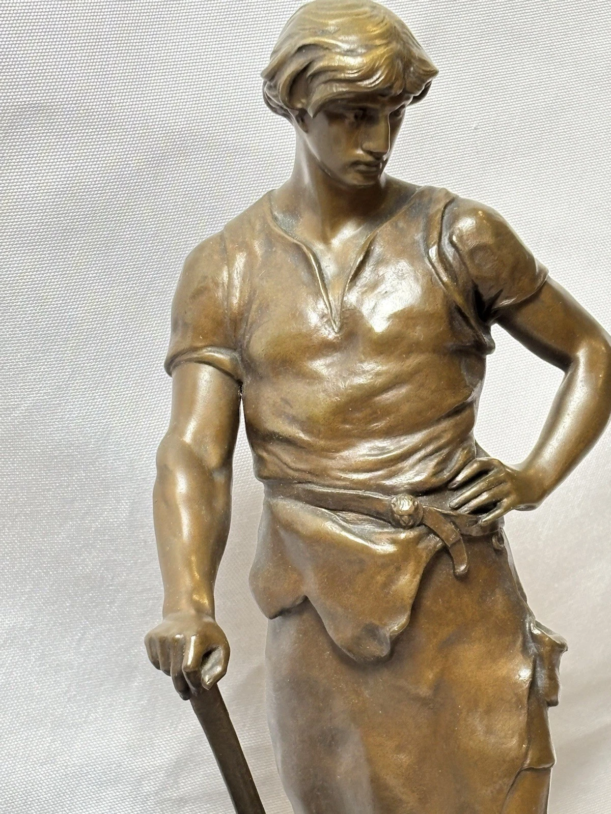 - The Sculpture: The central bronze sculpture depicts a man, likely a laborer or a blacksmith, standing in a dynamic, powerful pose. He is shown with a muscular physique, suggesting strength and physical work. He is partially draped in a leather apron, and in his right hand, he holds a large sledgehammer, the head of which rests on the base beside his foot. The sculpture is signed “E. Picault” and has a title plaque that reads “Pax et Labor.”