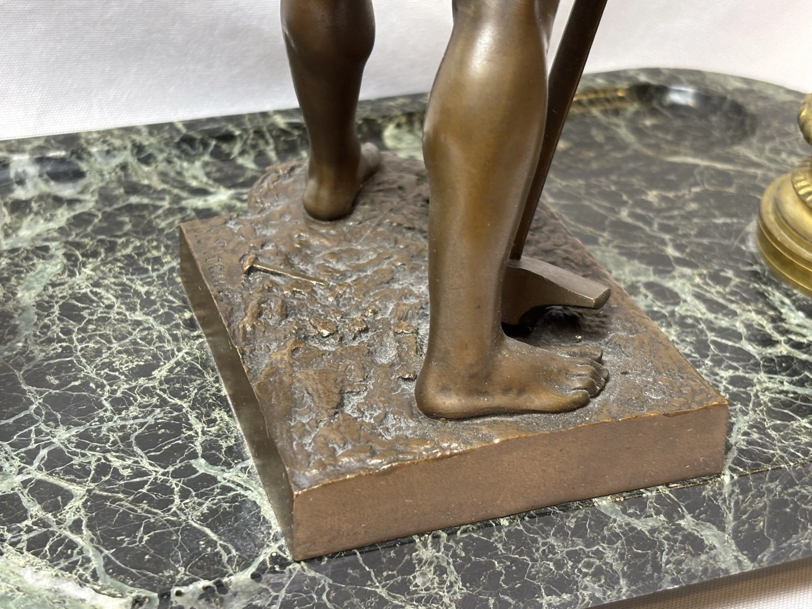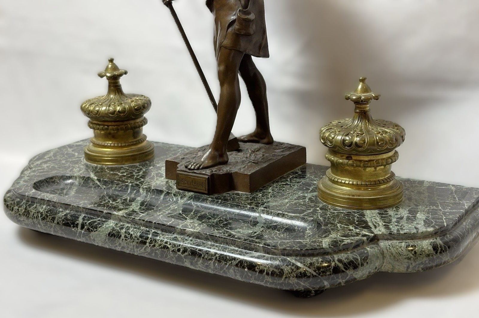 - The Inkstand: The base is a rectangular slab of green marble (sometimes referred to as “verde antico”), a popular material for decorative items in the late 19th century. Two brass inkwells flank the sculpture, each with a hinged, spherical lid. A shallow, recessed area in the front is designed to hold pens or other small writing tools.