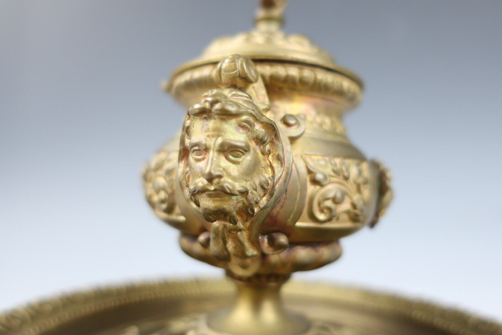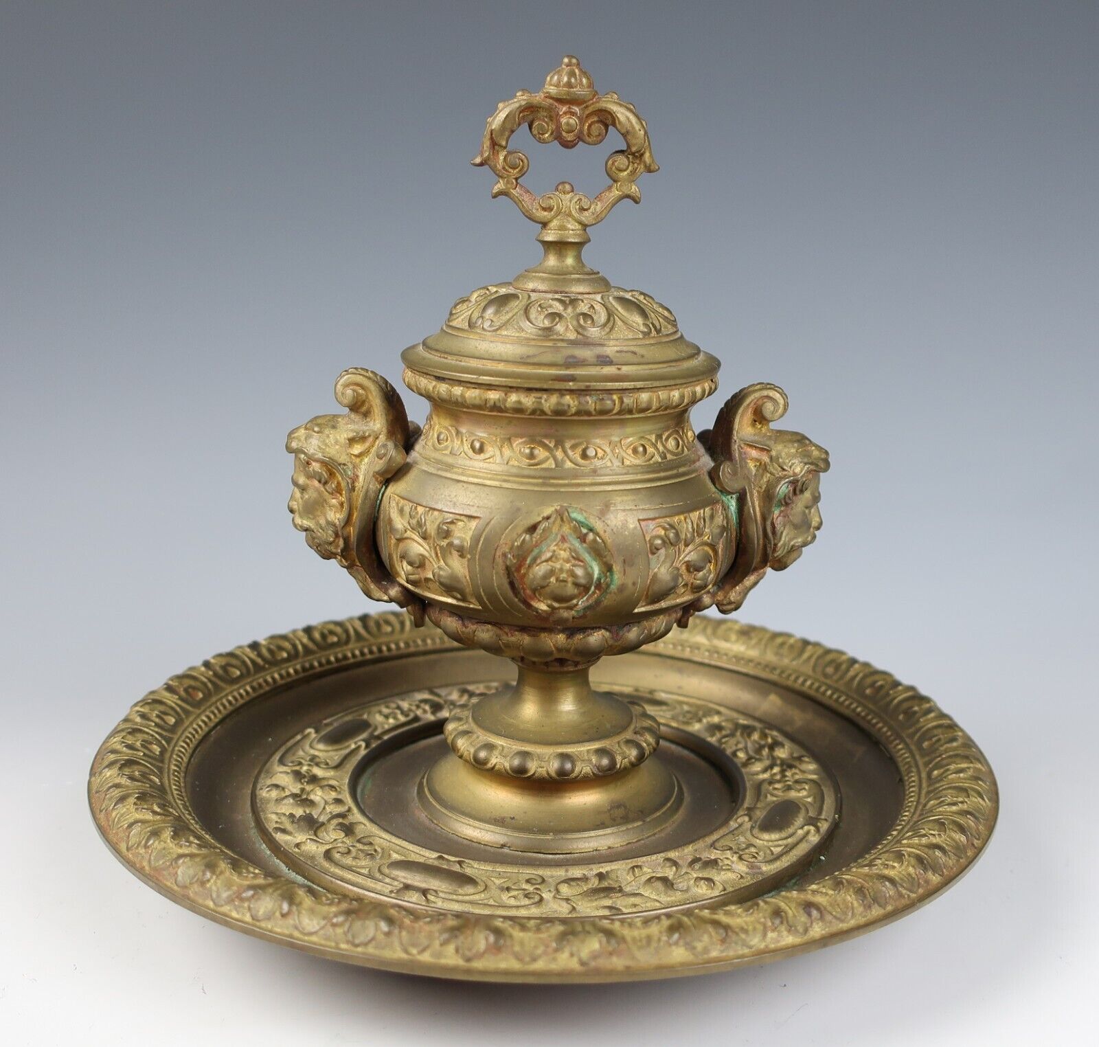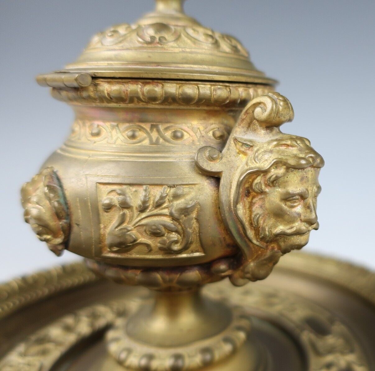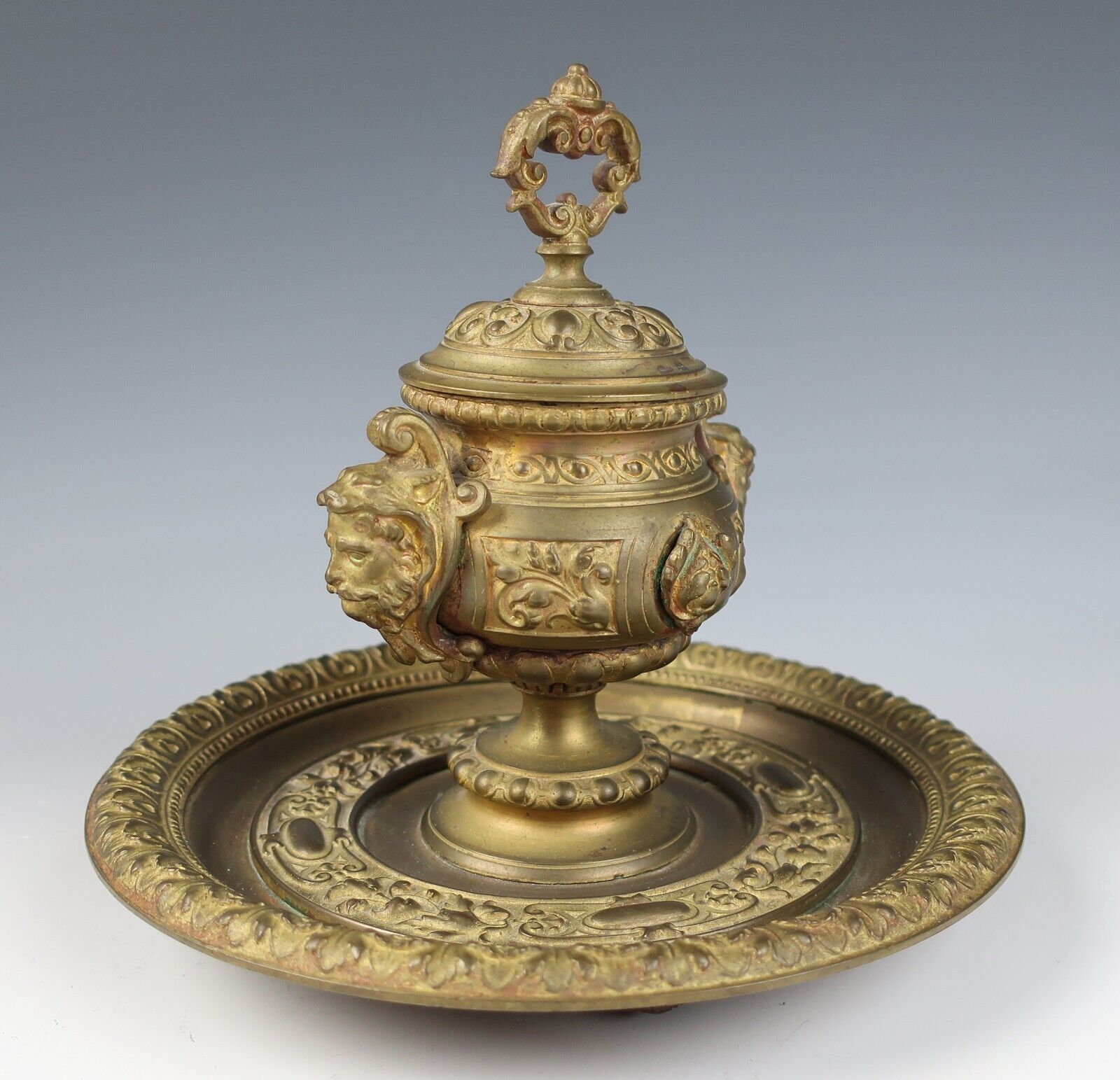 Resting on a circular base, this detailed bronze urn-shaped inkstand features two male faces, warriors with animal skin headdress. The top includes a large finial to open the hinged lid to access the inkwell.
