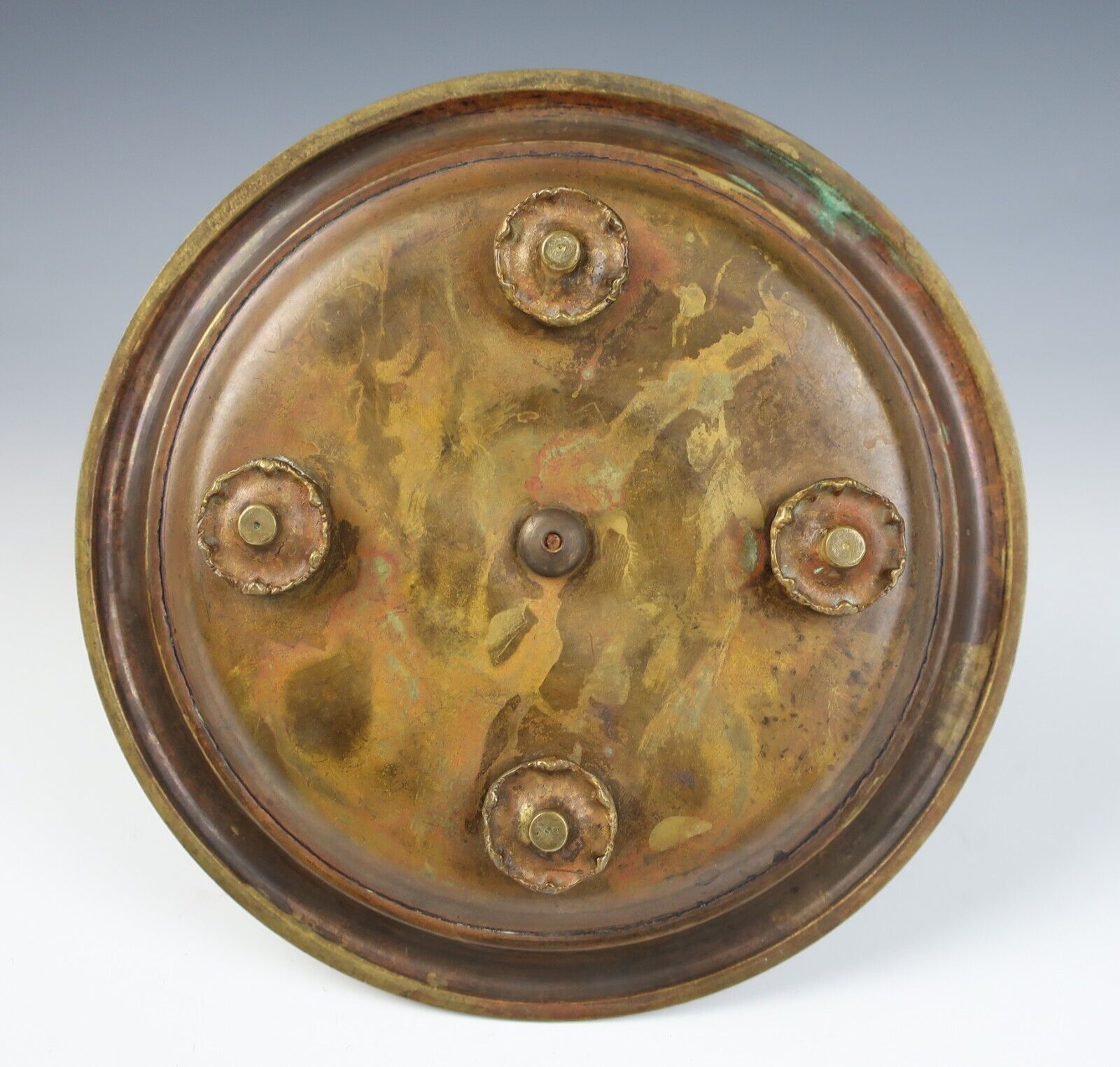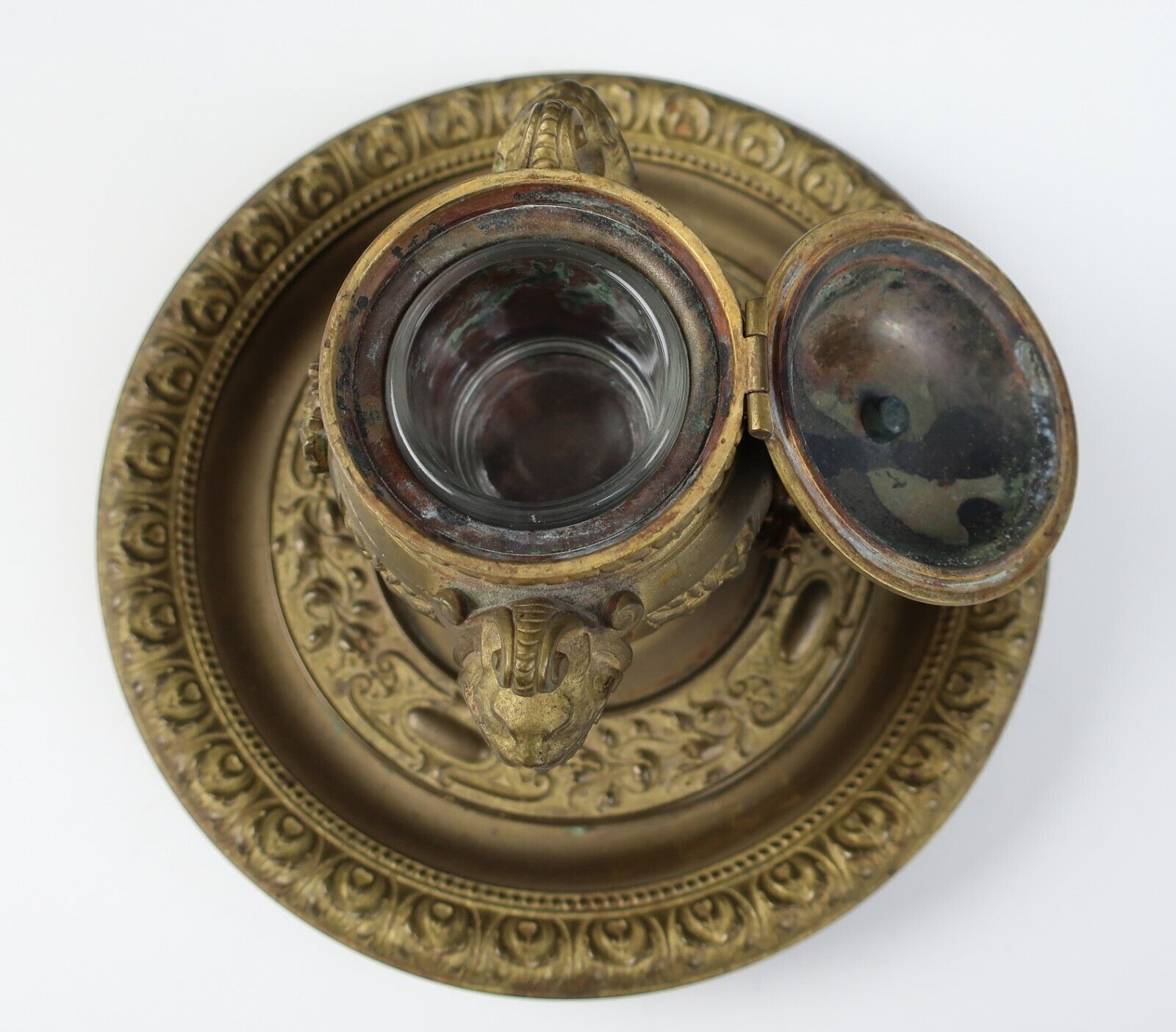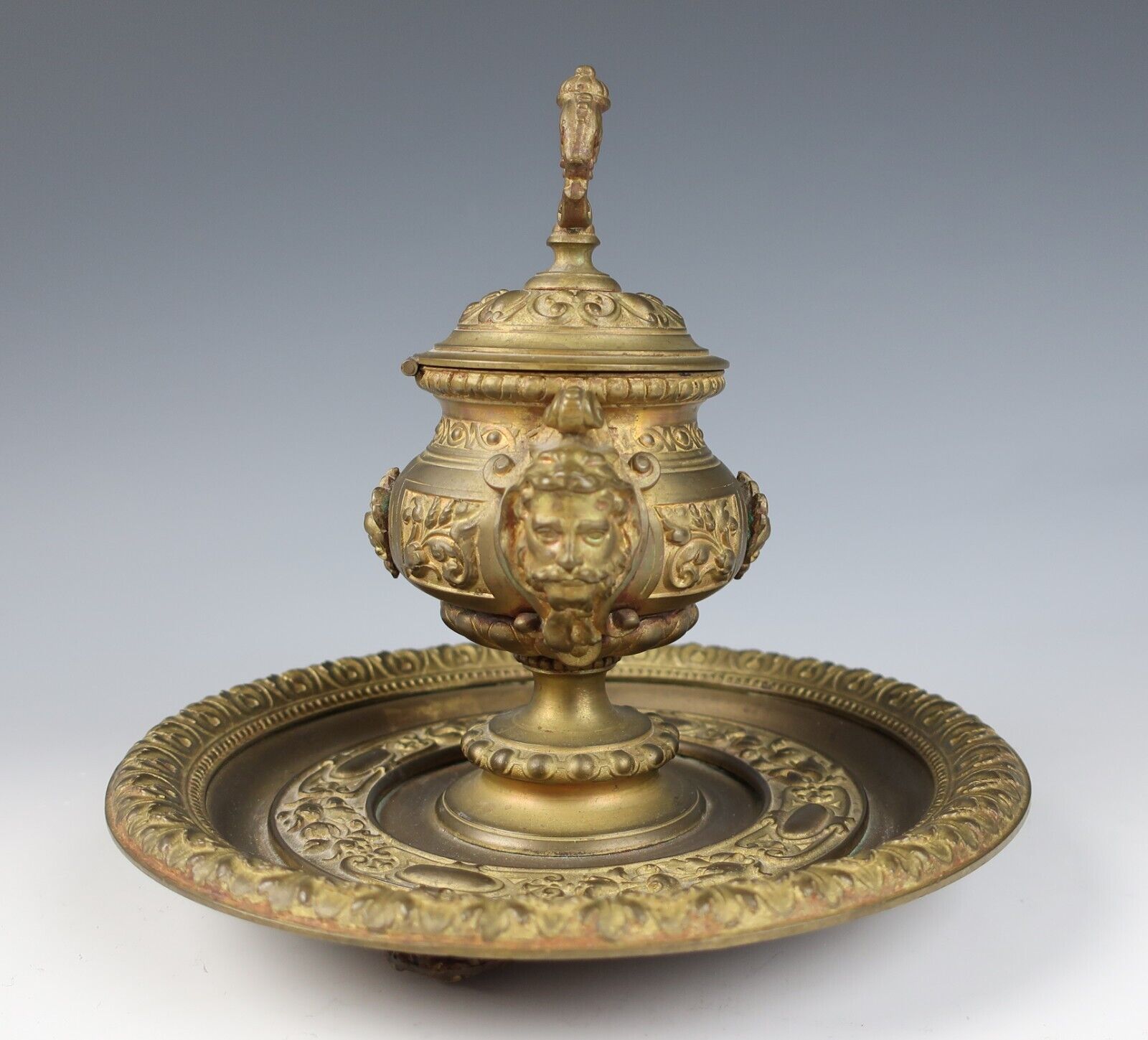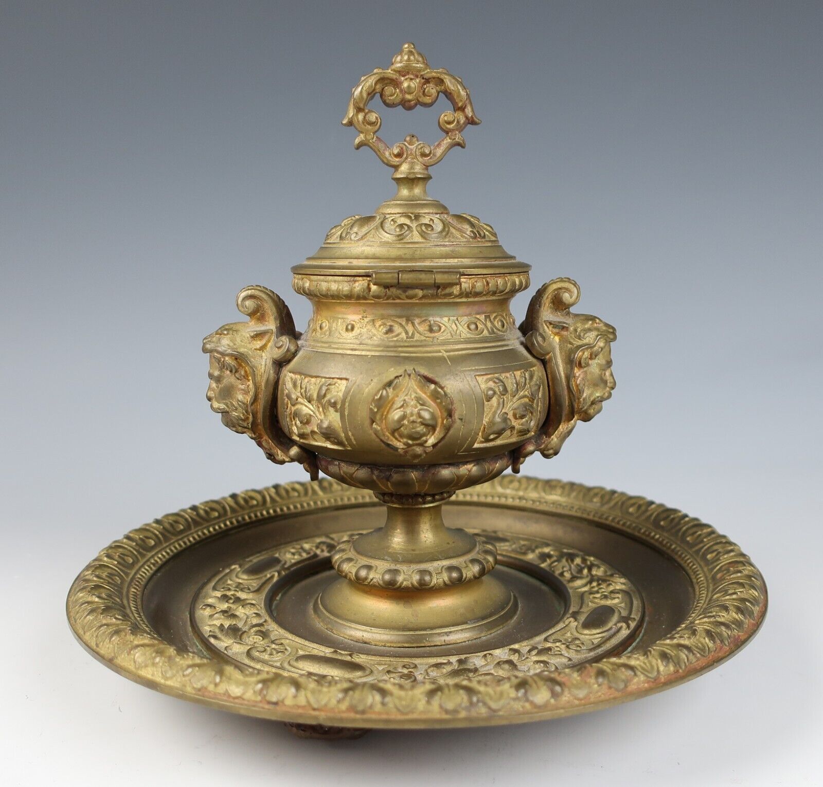 Resting on a circular base, this detailed bronze urn-shaped inkstand features two male faces, warriors with animal skin headdress. The top includes a large finial to open the hinged lid to access the inkwell.