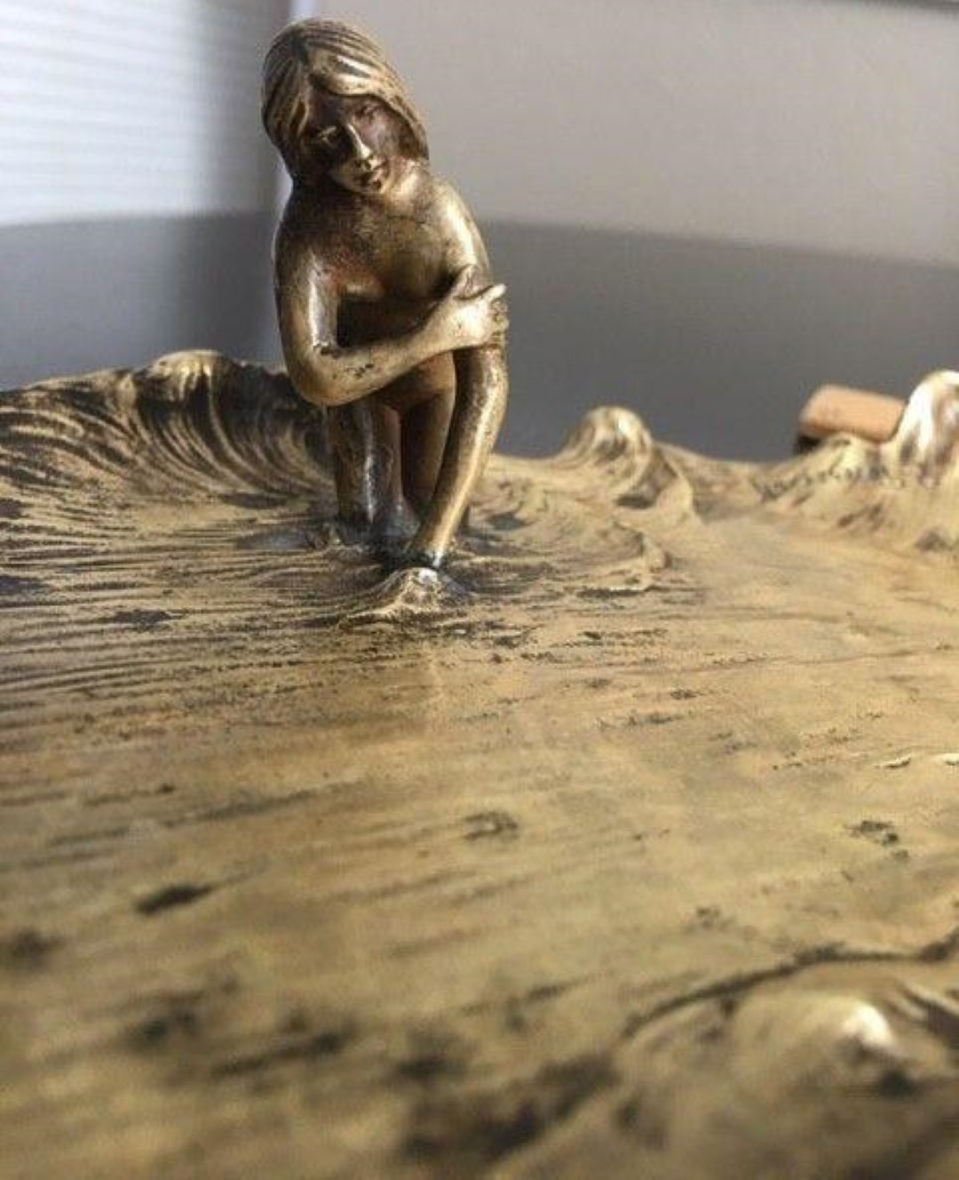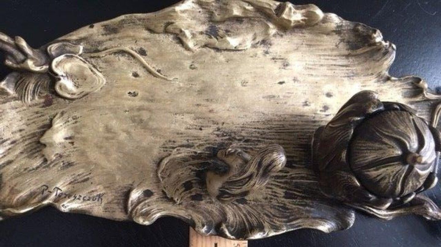 Bronze inkstand by Peter Tereszczuk features a nymph bathing in a pond in the Art Nouveau style. The water flower opens to the inkwell inside. The artist’s signature is on the piece.