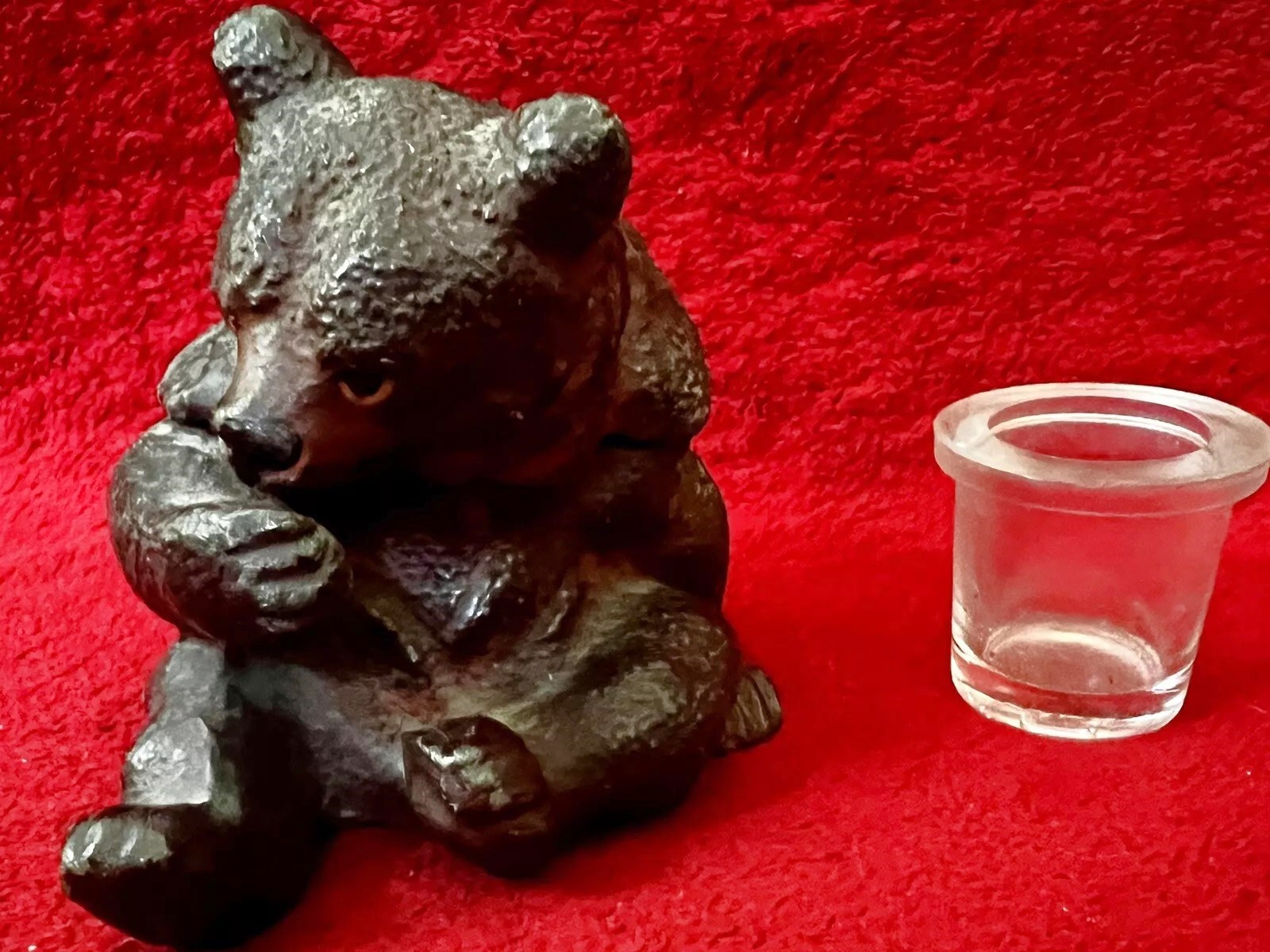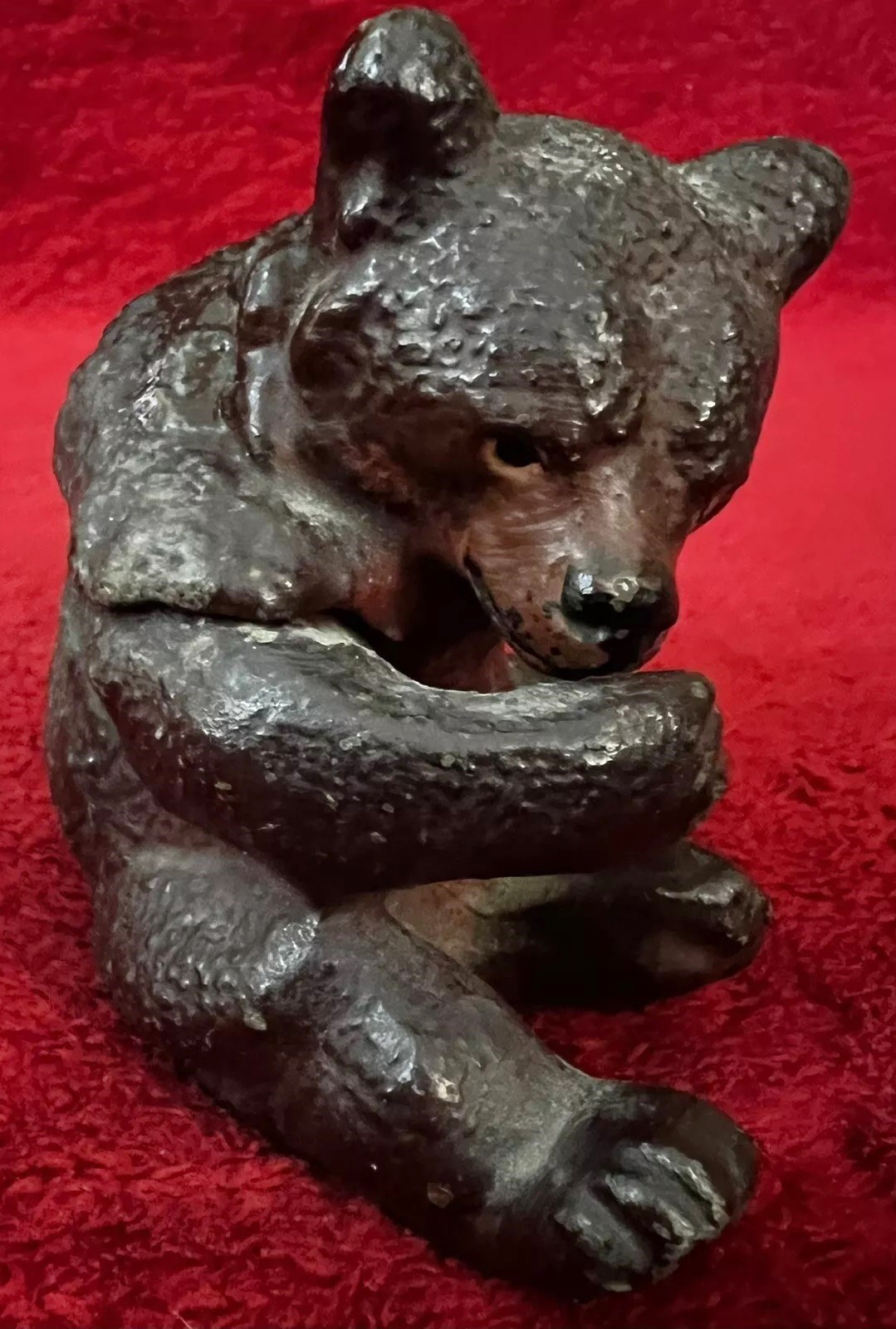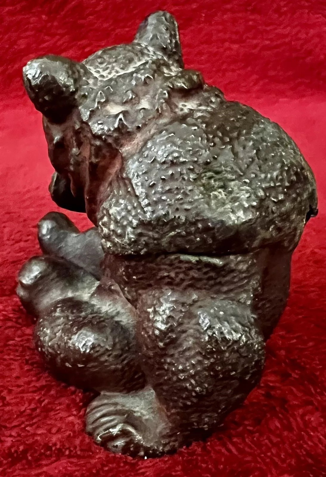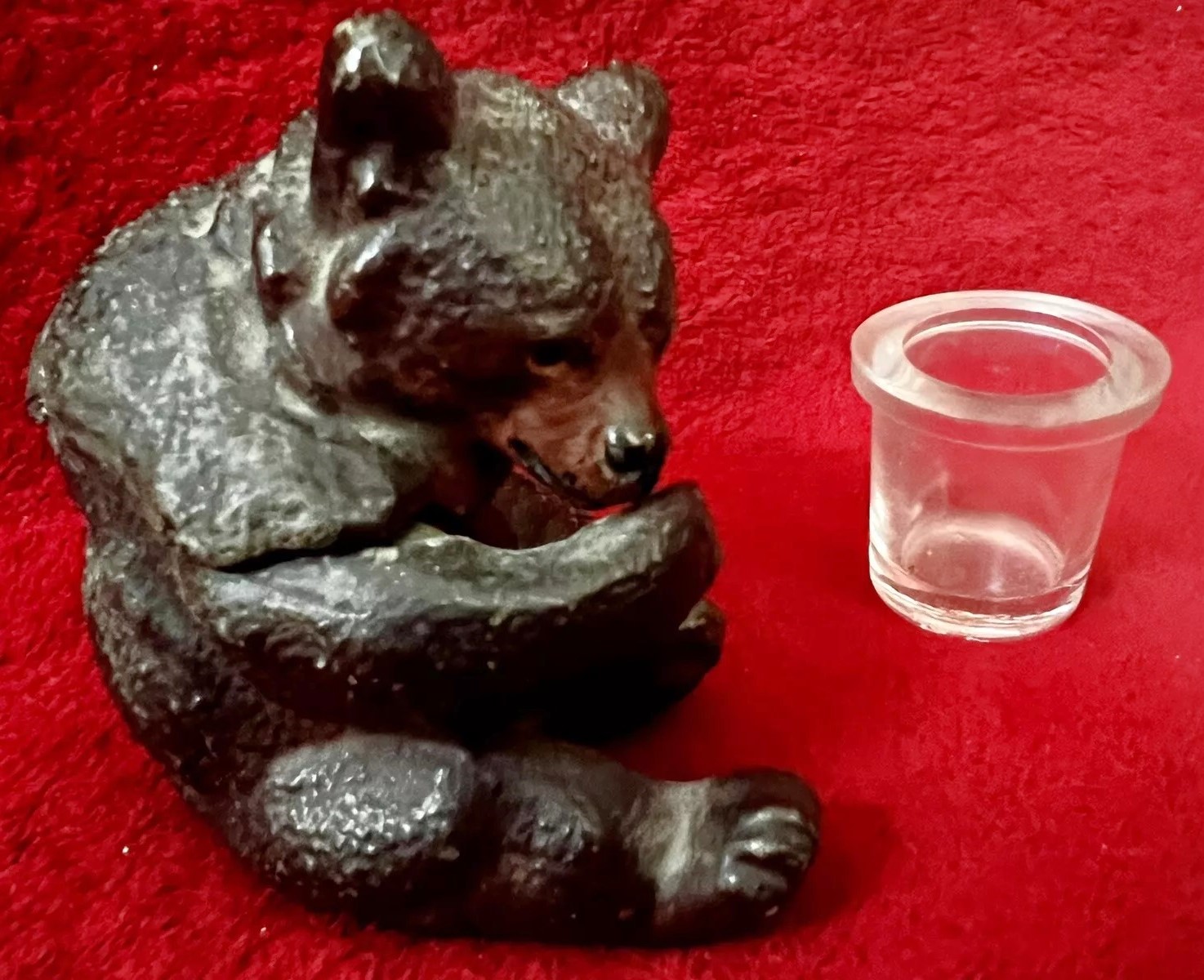 Painted cast metal bear licking his paw. His head is hinged to expose the glass insert. A number is stamped on the bottom – either “68” or “89” depending on the direction of viewing. He is painted brown with expressive highlights around his face and eyes.