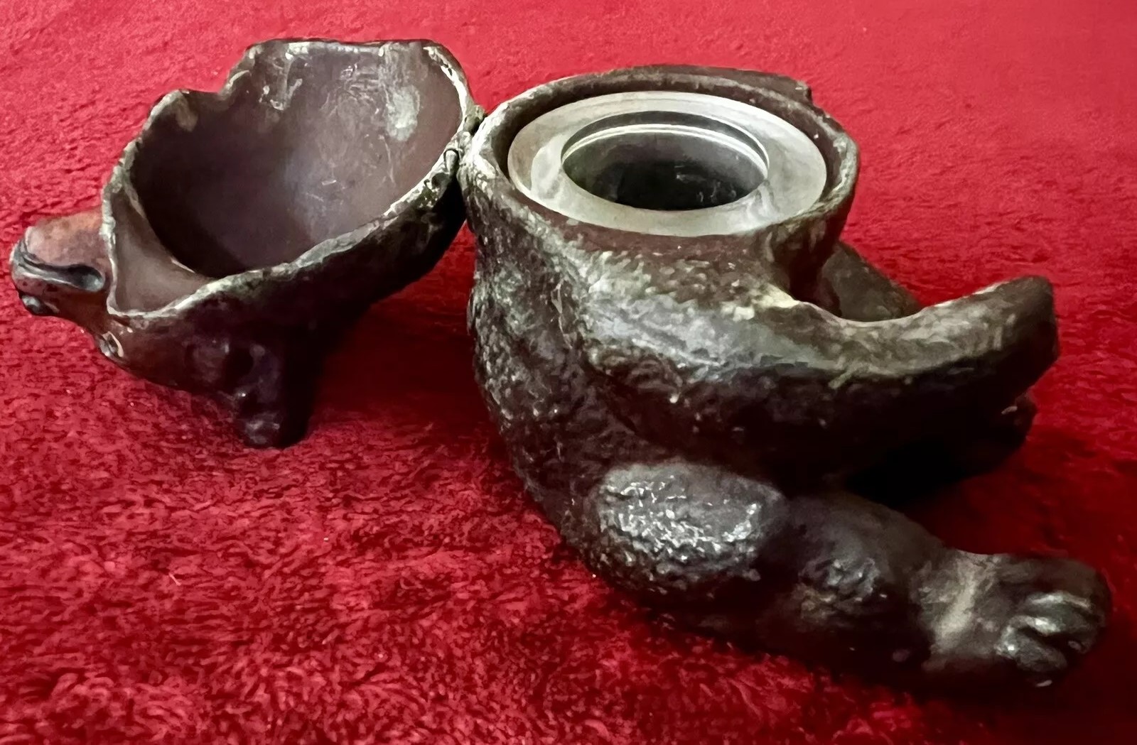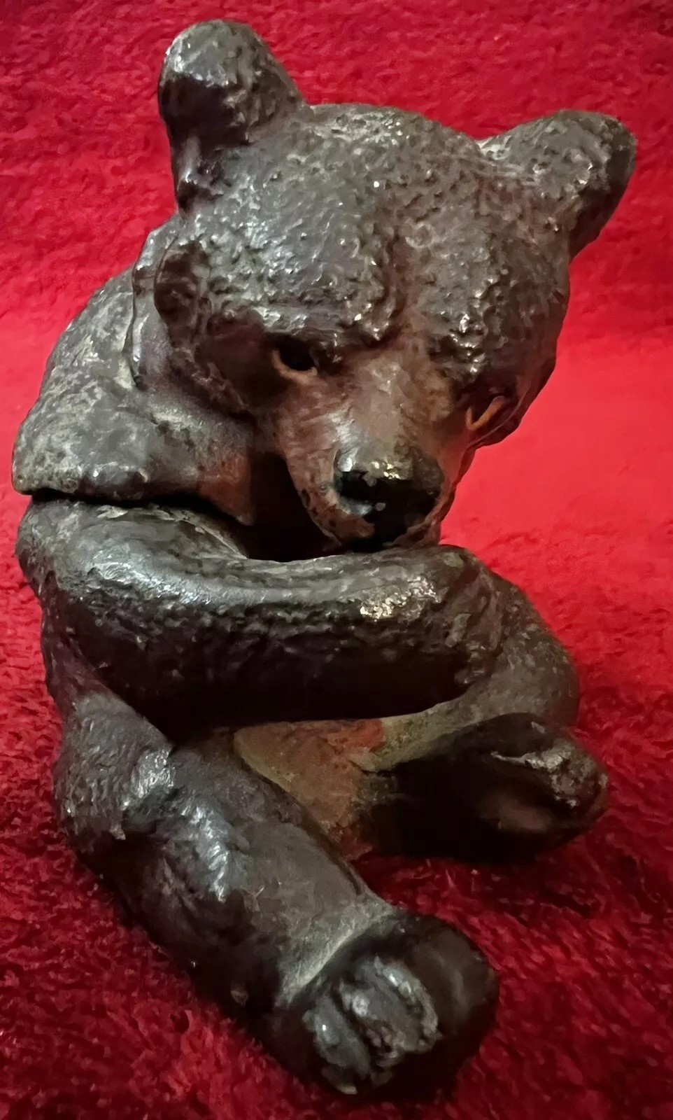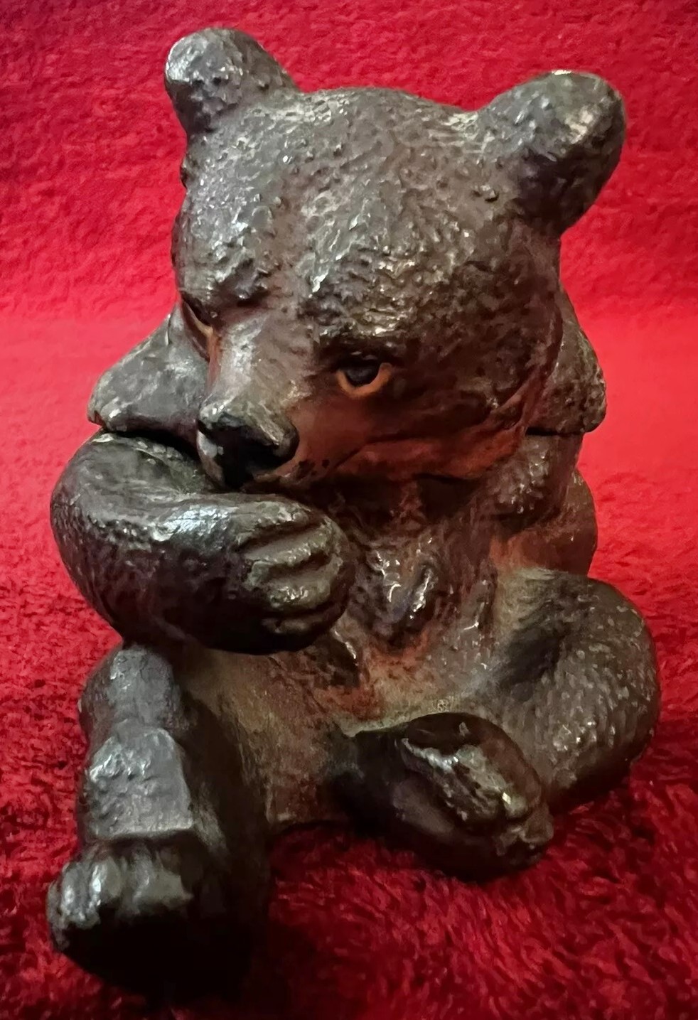 Painted cast metal bear licking his paw. His head is hinged to expose the glass insert. A number is stamped on the bottom – either “68” or “89” depending on the direction of viewing. He is painted brown with expressive highlights around his face and eyes.