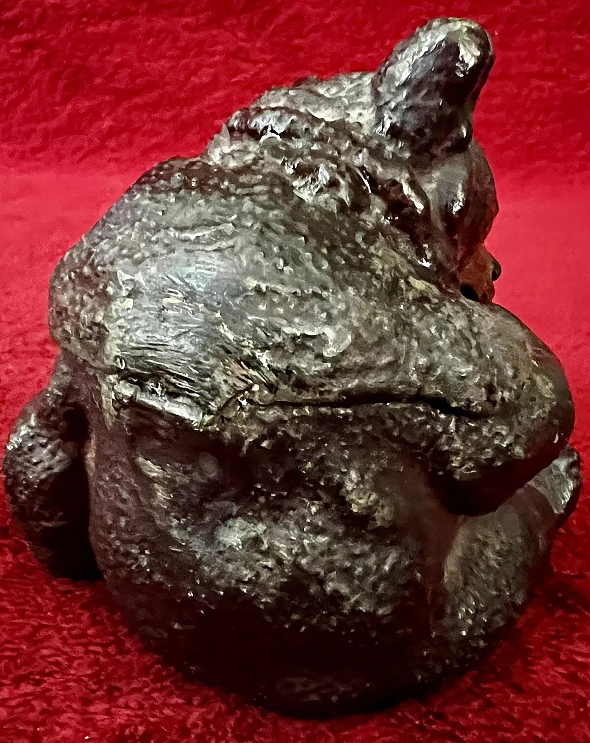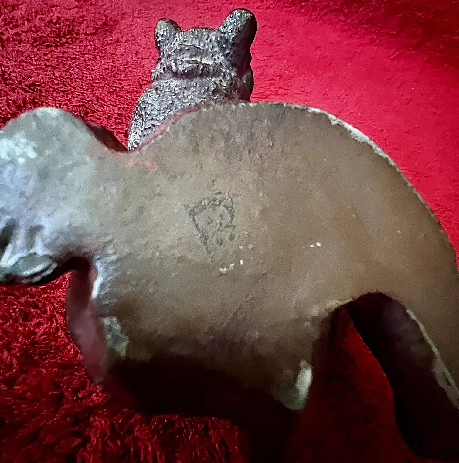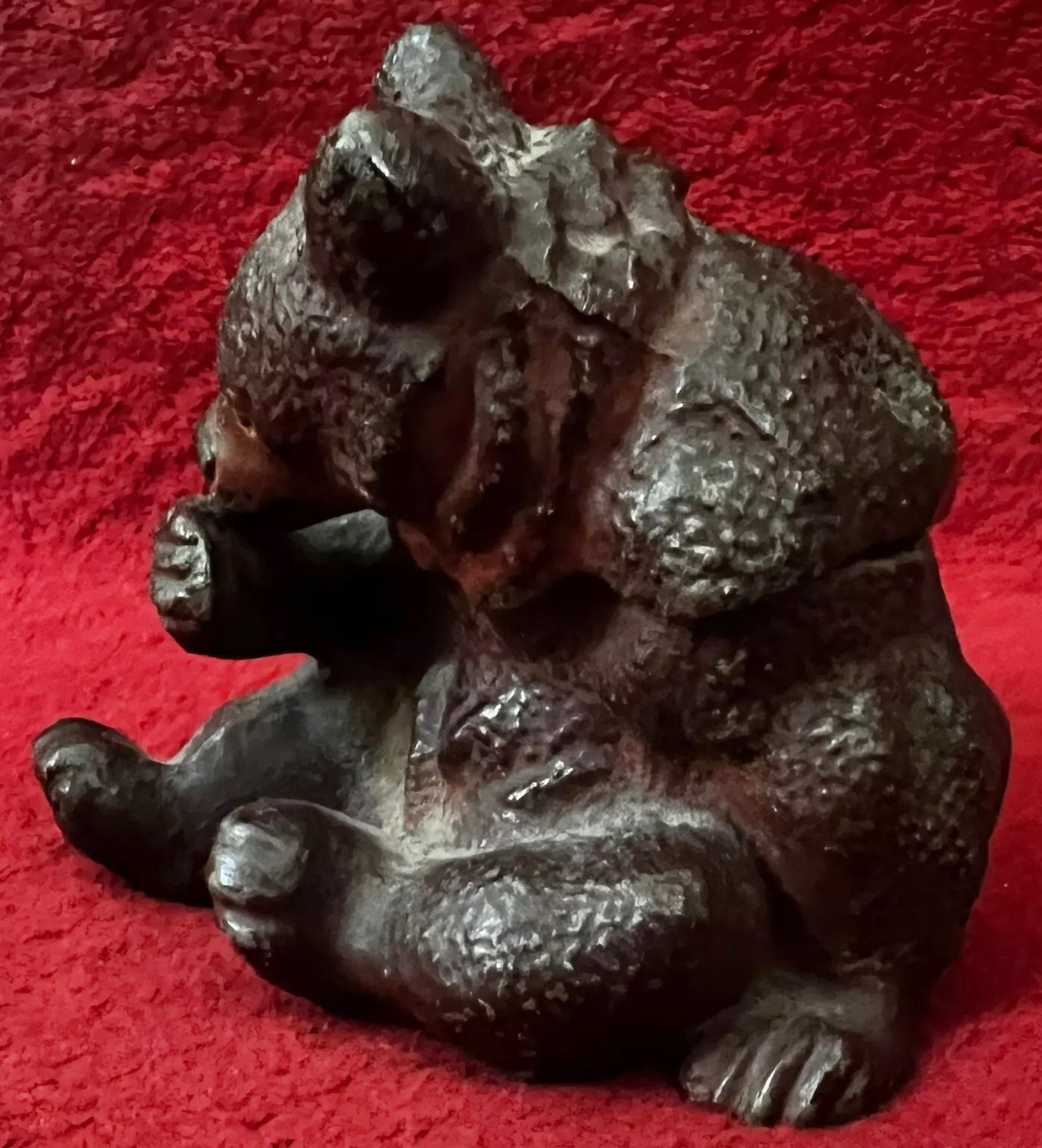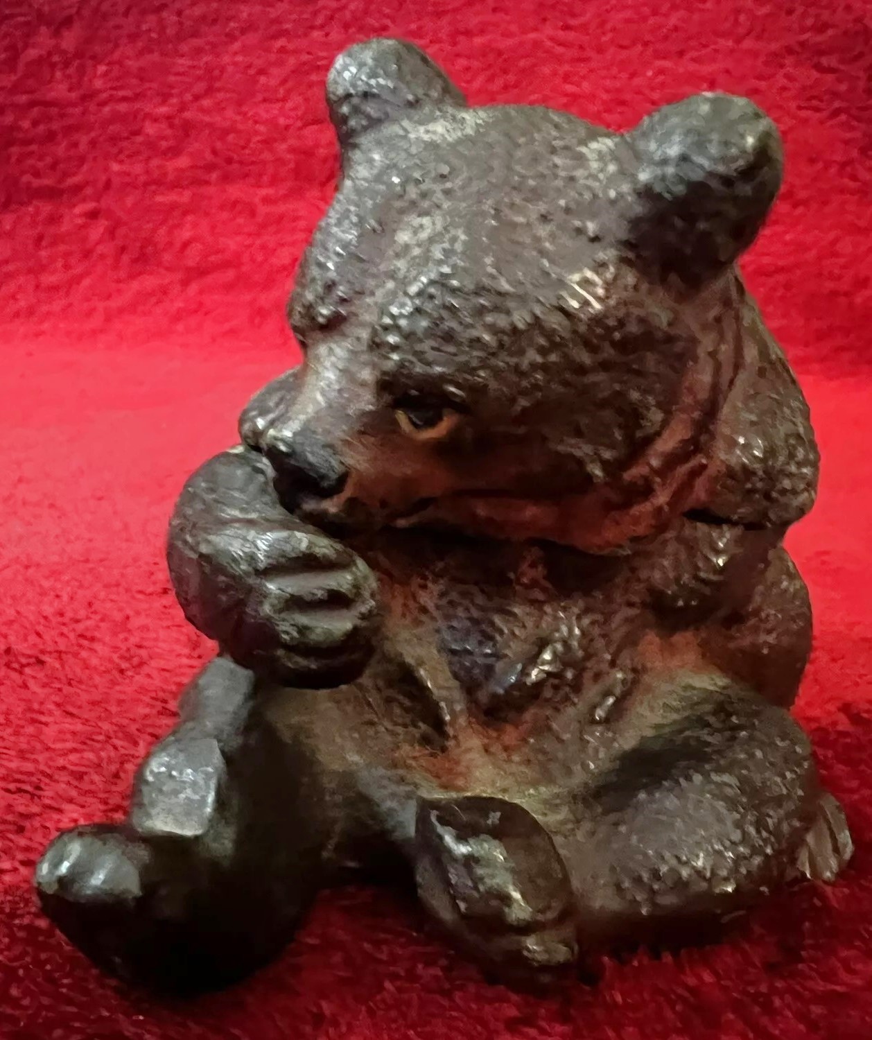 Painted cast metal bear licking his paw. His head is hinged to expose the glass insert. A number is stamped on the bottom – either “68” or “89” depending on the direction of viewing. He is painted brown with expressive highlights around his face and eyes.