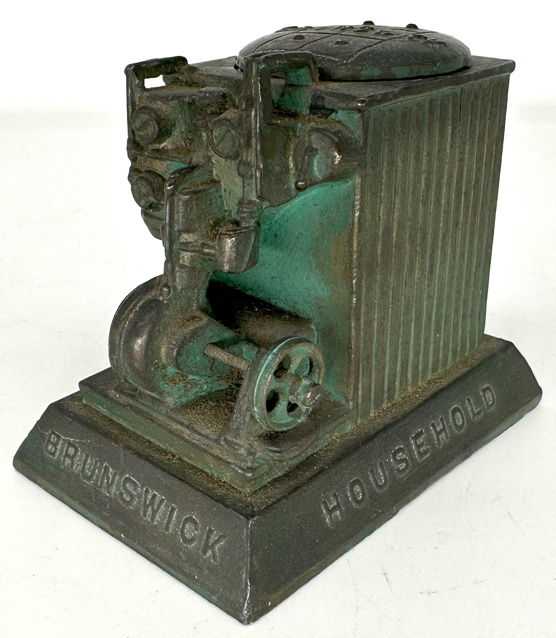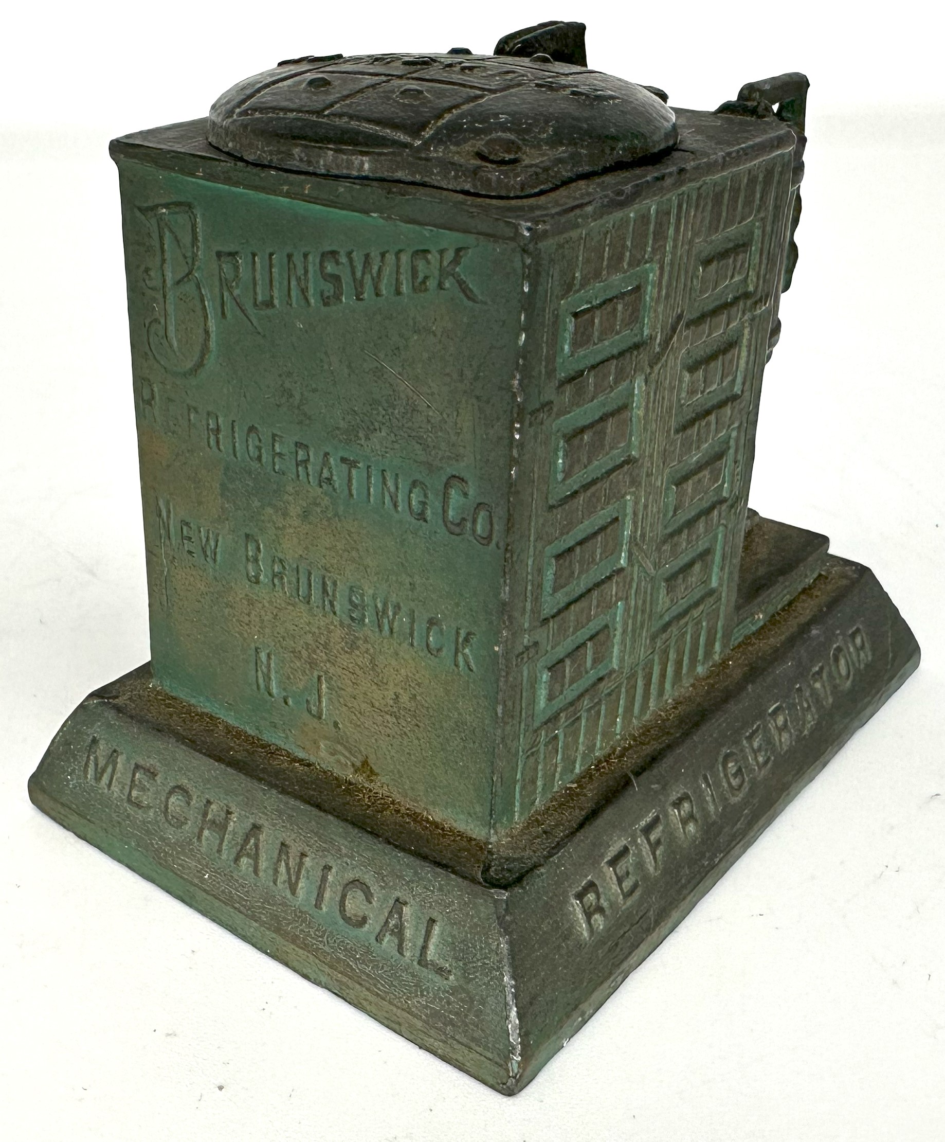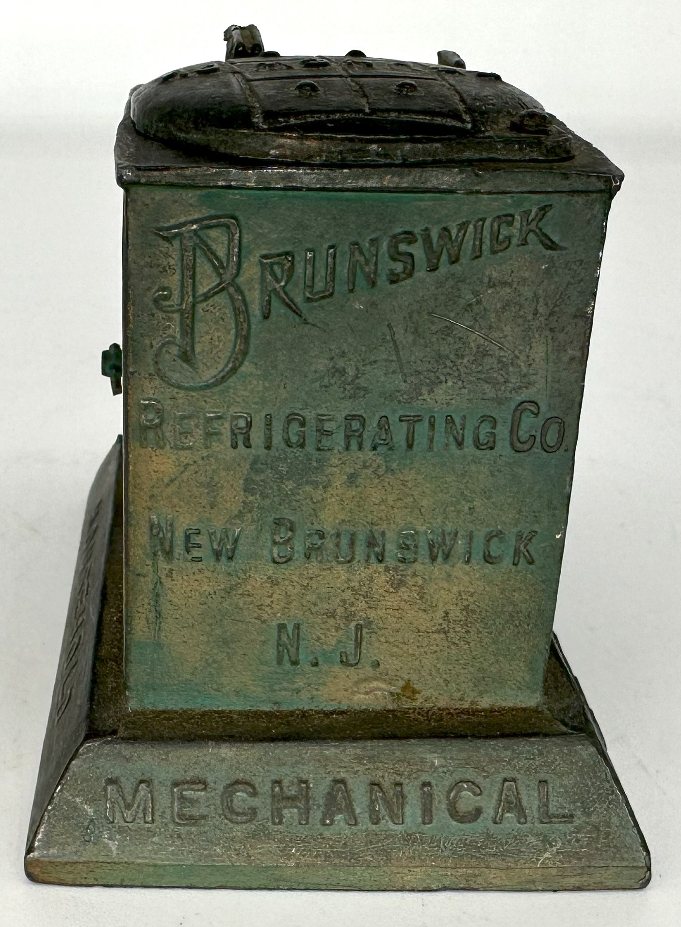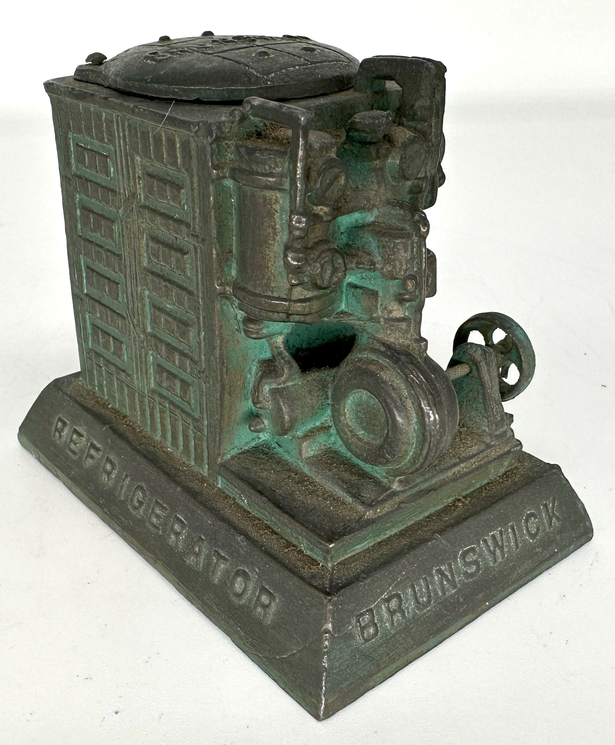 An intricately cast metal Brunswick refrigerator unit in the form of an inkwell. The front is marked “Brunswick Refrigerating Co., New Brunswick, N.J. The base is marked “Household”, “Mechanical”, Refrigerator”. The is a swivel lid covering the glass inkwell. The intricate casting shows the details of the unit. The wheel on the side turns.