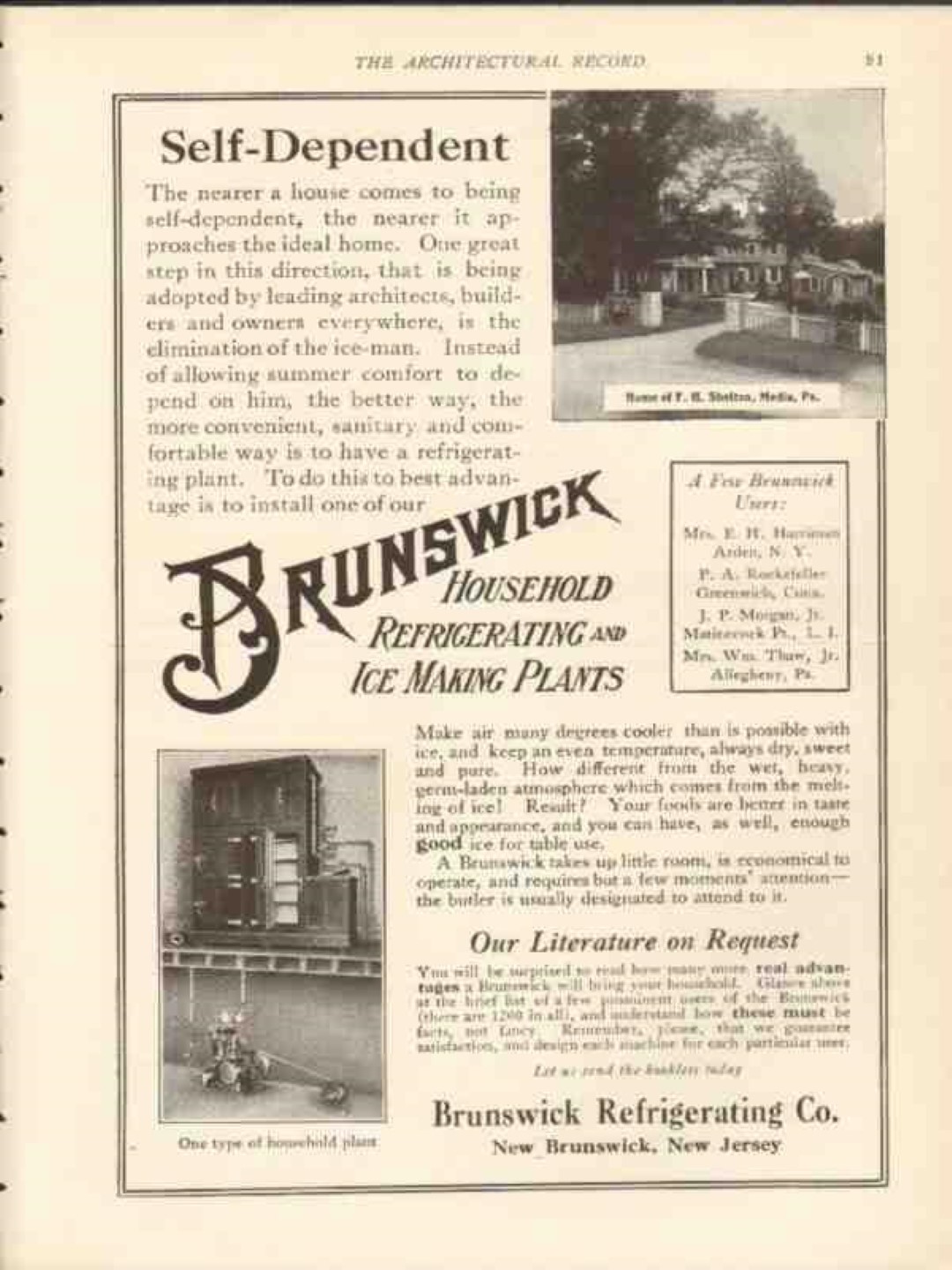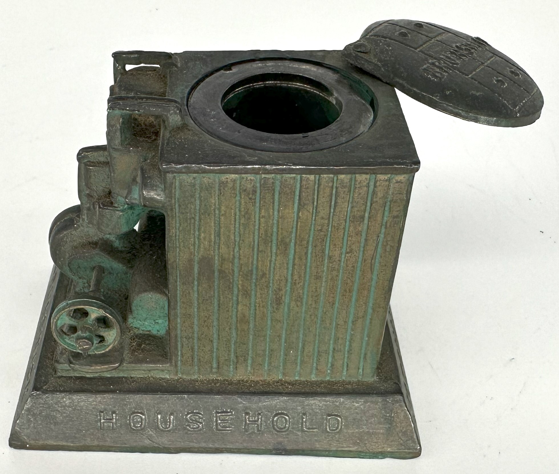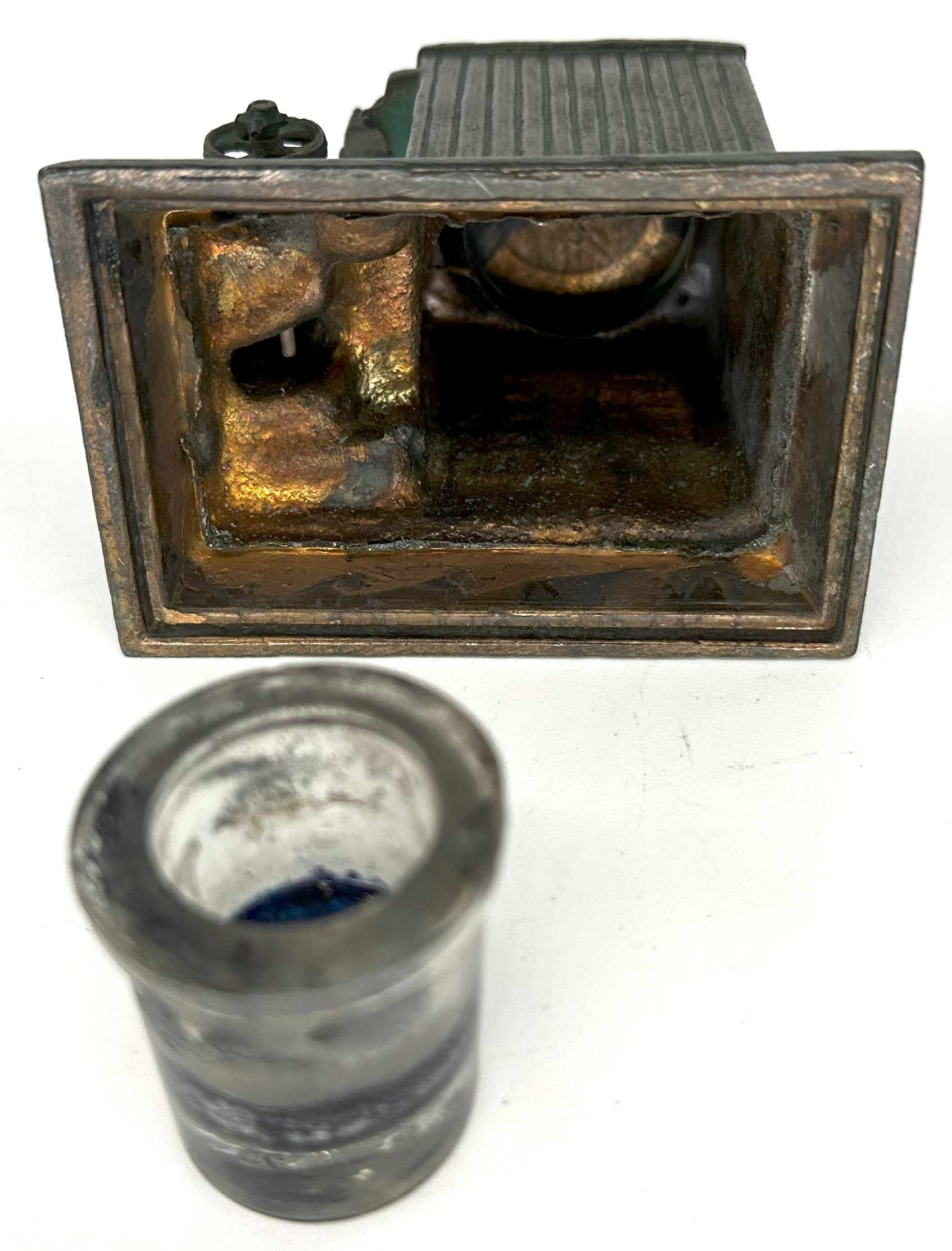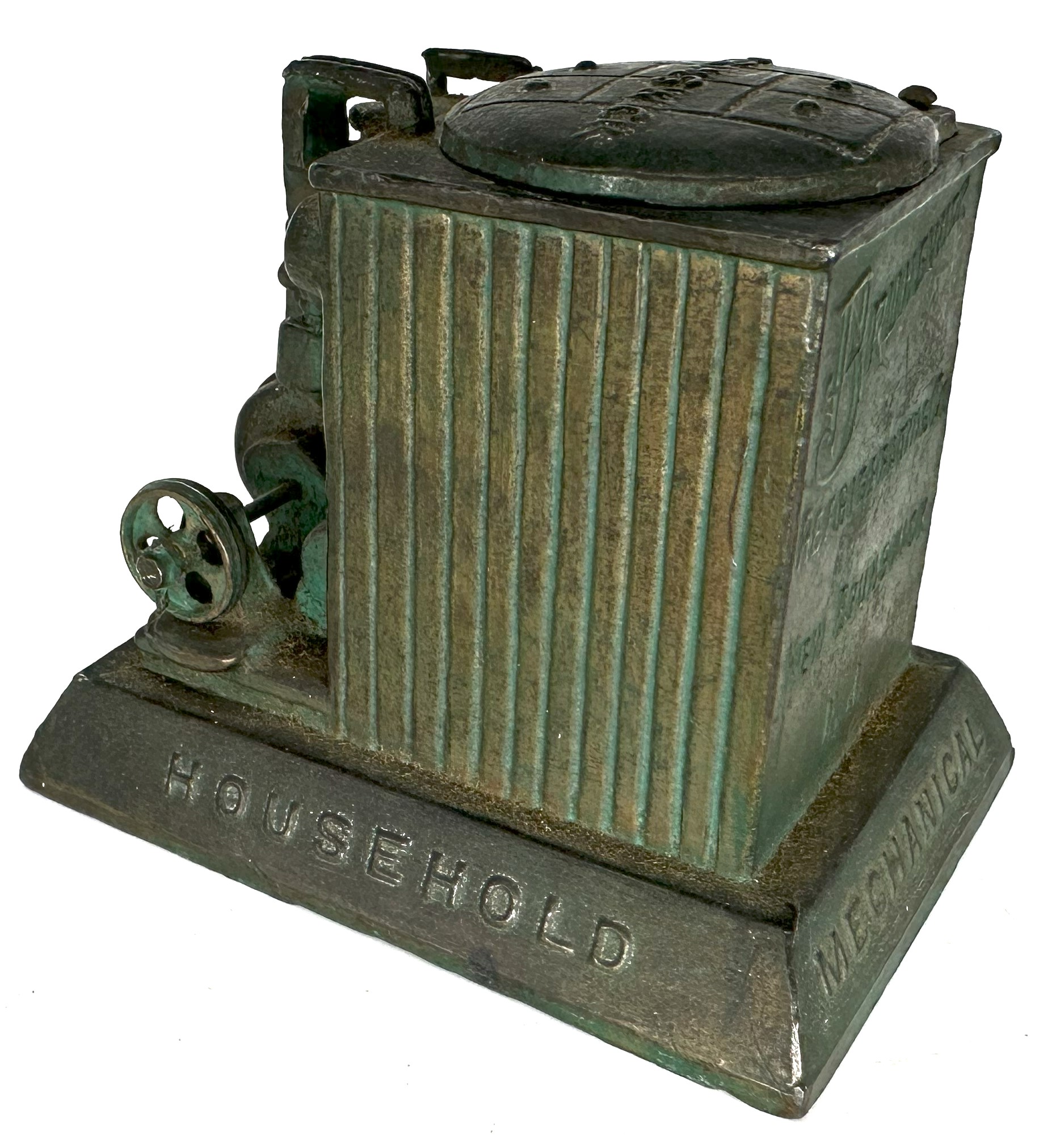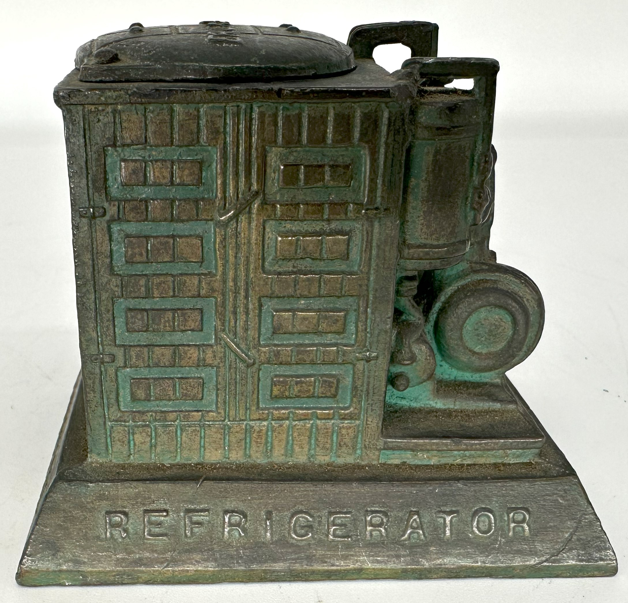 An intricately cast metal Brunswick refrigerator unit in the form of an inkwell. The front is marked “Brunswick Refrigerating Co., New Brunswick, N.J. The base is marked “Household”, “Mechanical”, Refrigerator”. The is a swivel lid covering the glass inkwell. The intricate casting shows the details of the unit. The wheel on the side turns.
