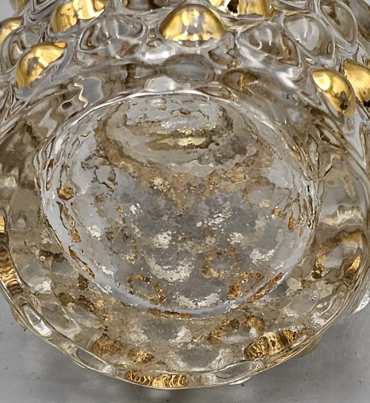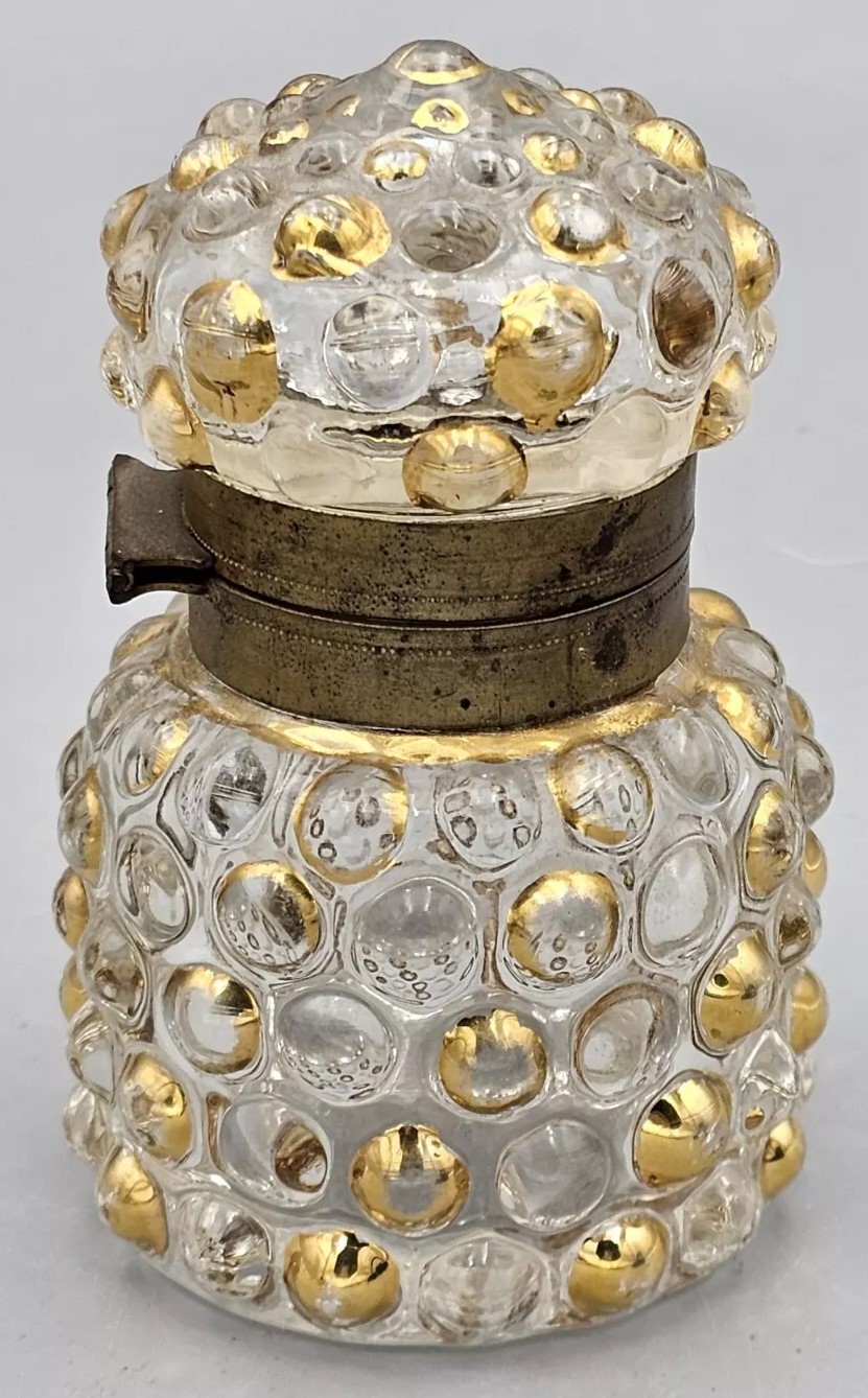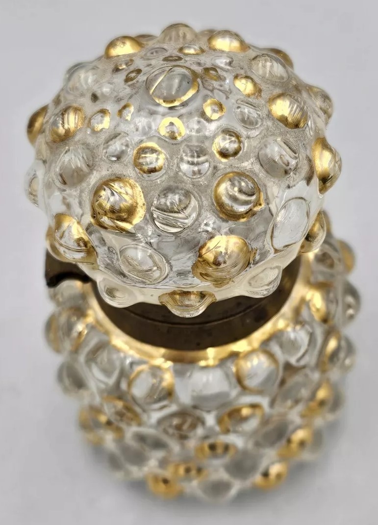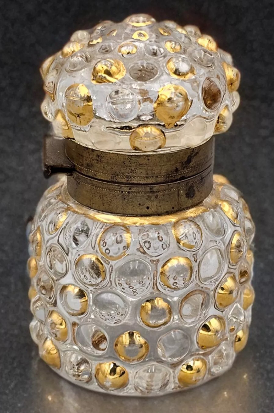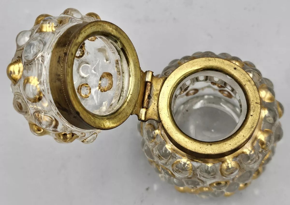 This glass inkwell has a textured surface adorned with raised, rounded bubbles, some with gold accents. Both the hinged lid and the bottom are made of glass. The fittings for the hinge are made of brass.