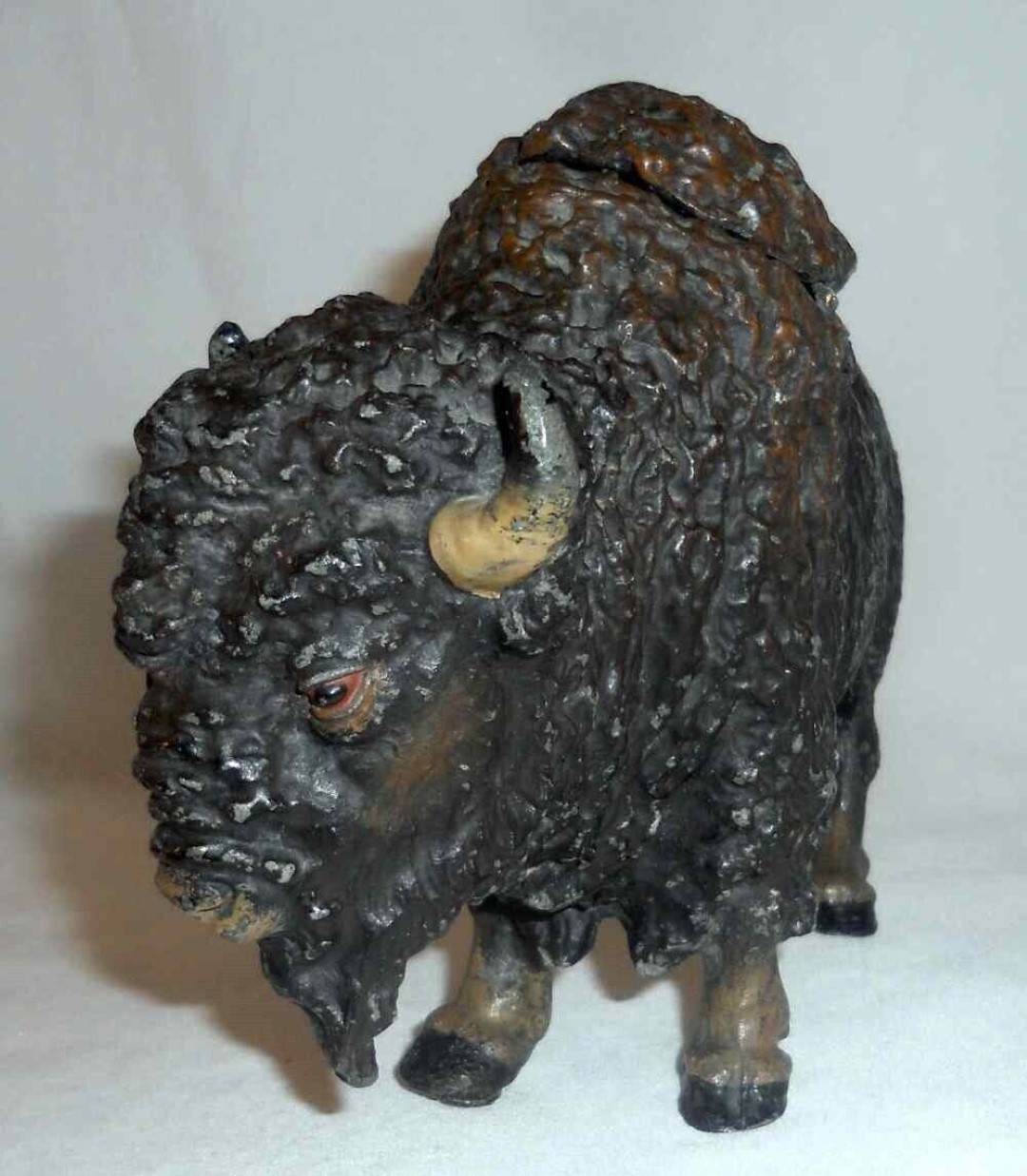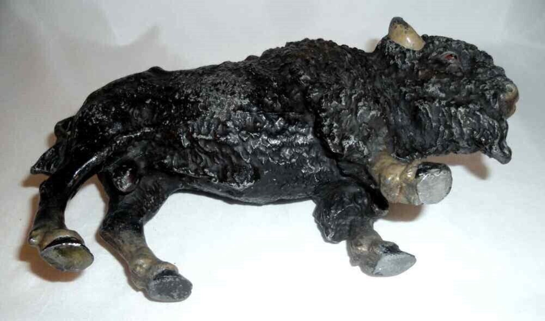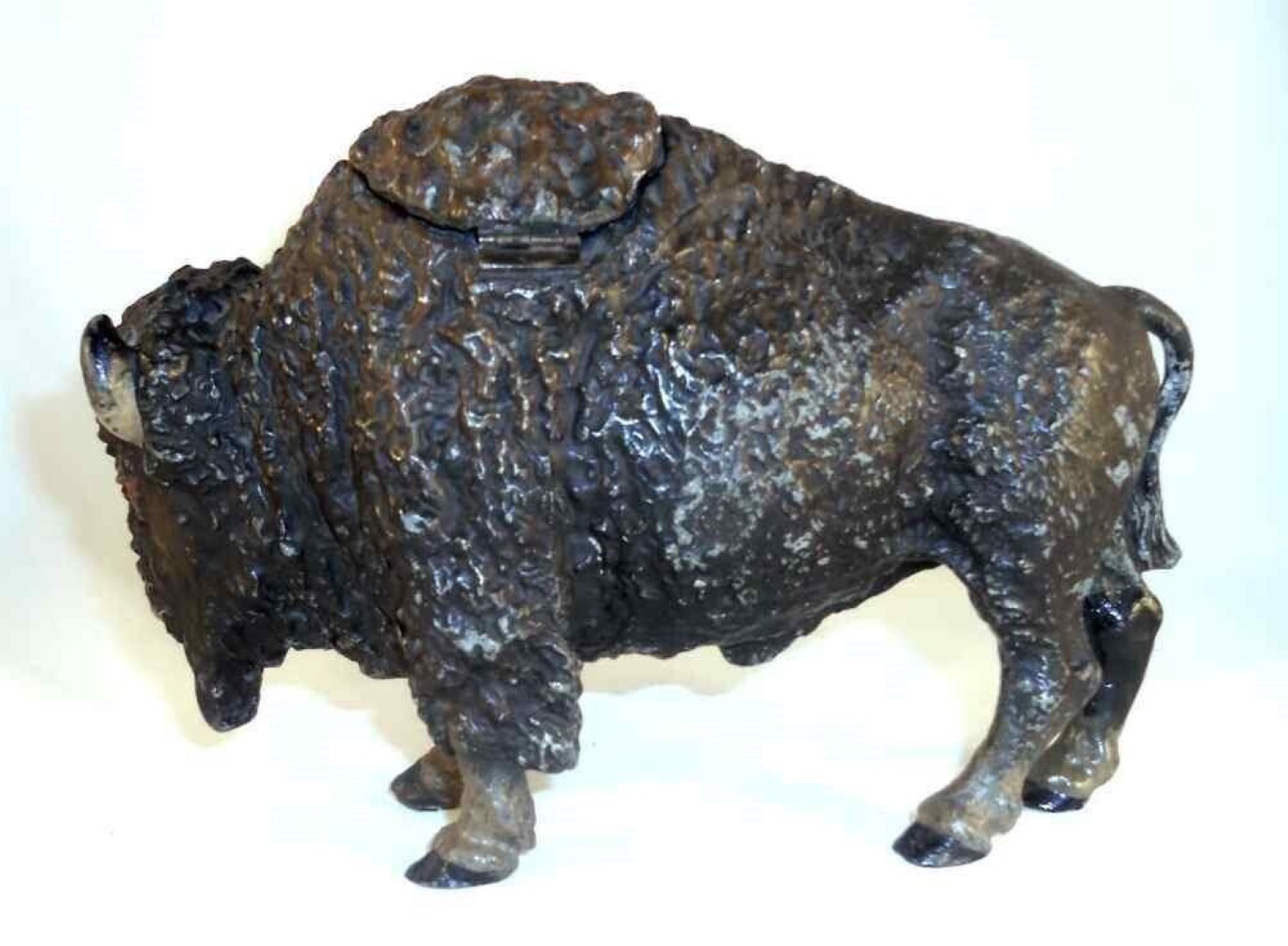 Standing with its head down, cocked to the side, this cold-painted metal Buffalo looks majestic. There’s nice detail to his hide, the horns, the eyes and mouth. The bison’s hump is hinged and opens to access the inkwell.