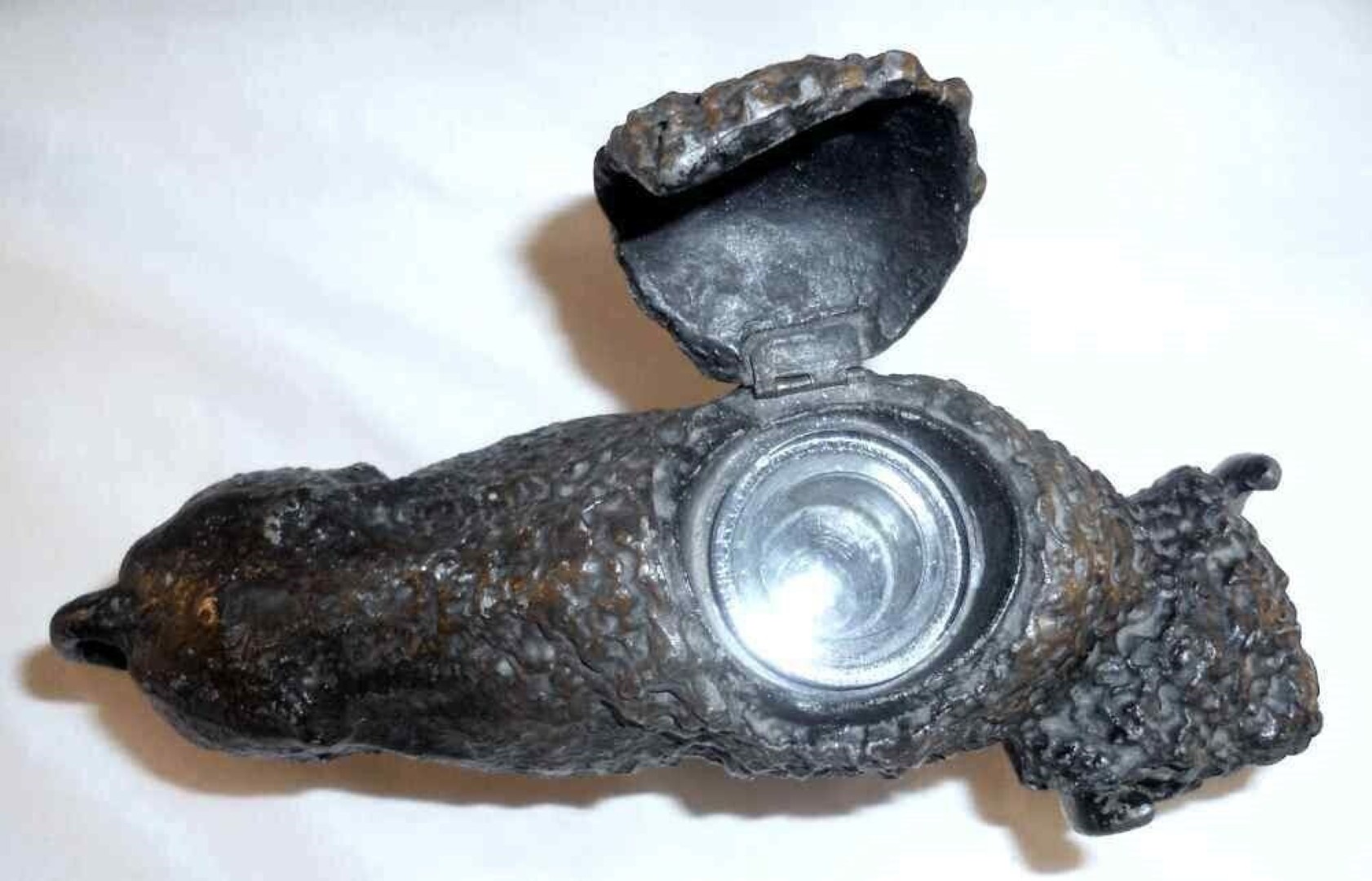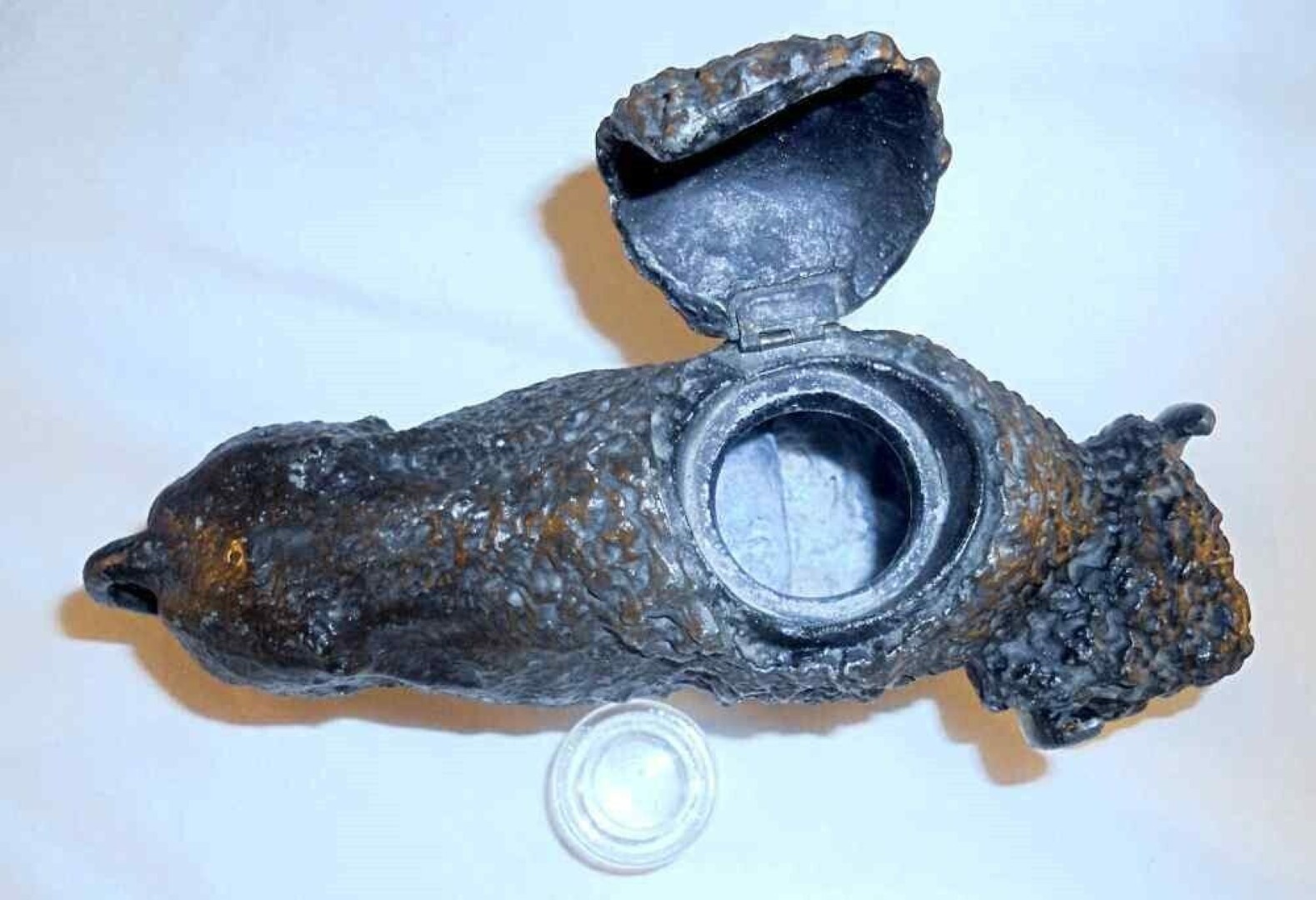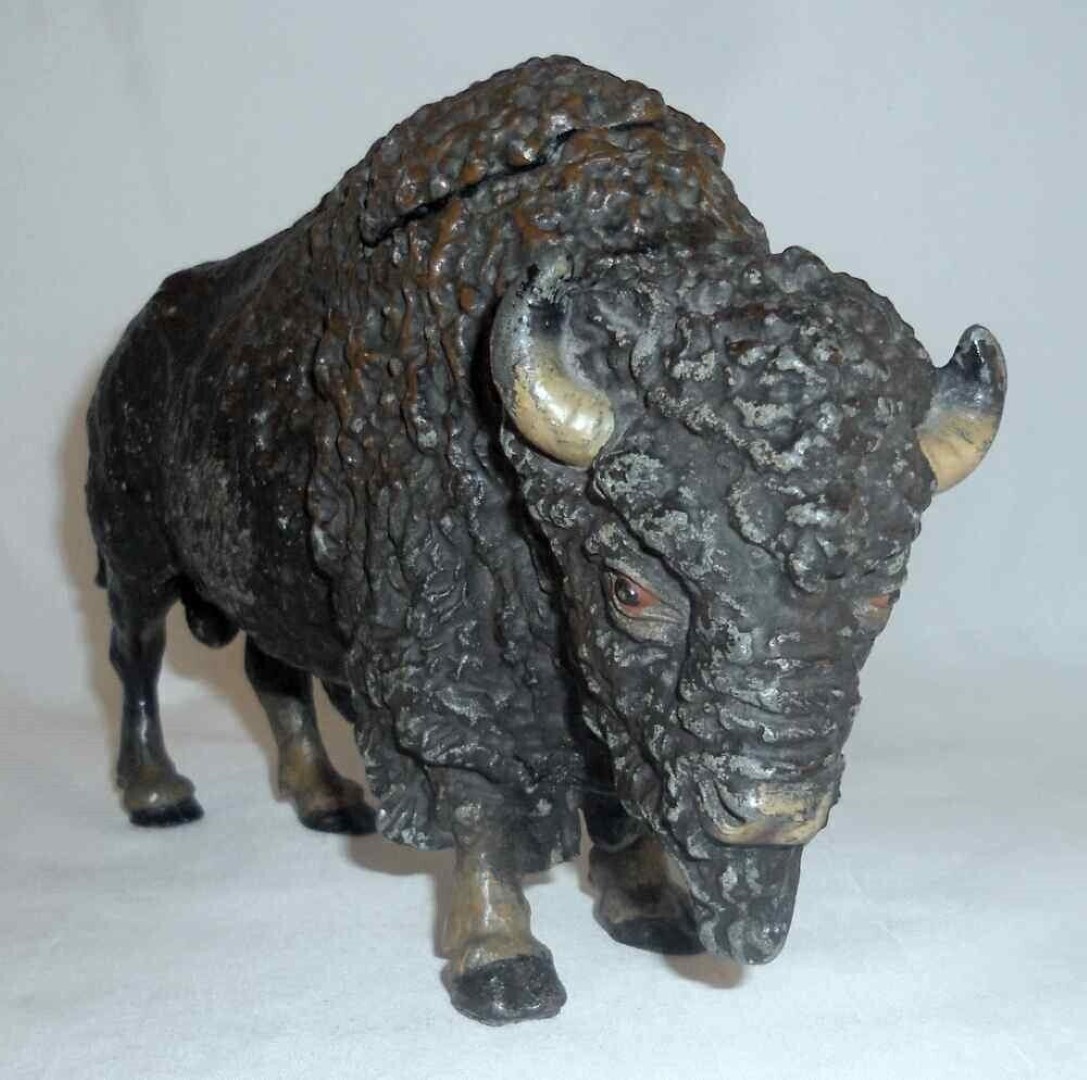 Standing with its head down, cocked to the side, this cold-painted metal Buffalo looks majestic. There’s nice detail to his hide, the horns, the eyes and mouth. The bison’s hump is hinged and opens to access the inkwell.