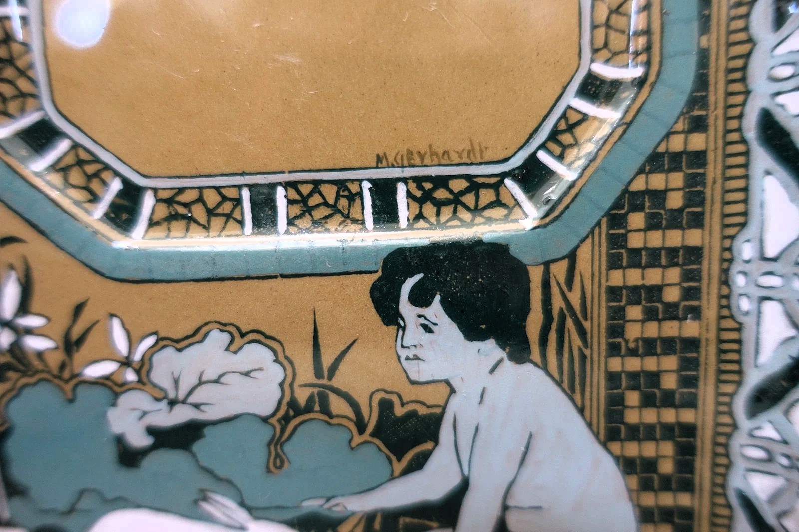 - Artist’s Signature: The scene is signed “M. Gerhardt” on the front of the tray, identifying the skilled decorator who finished the piece by hand.