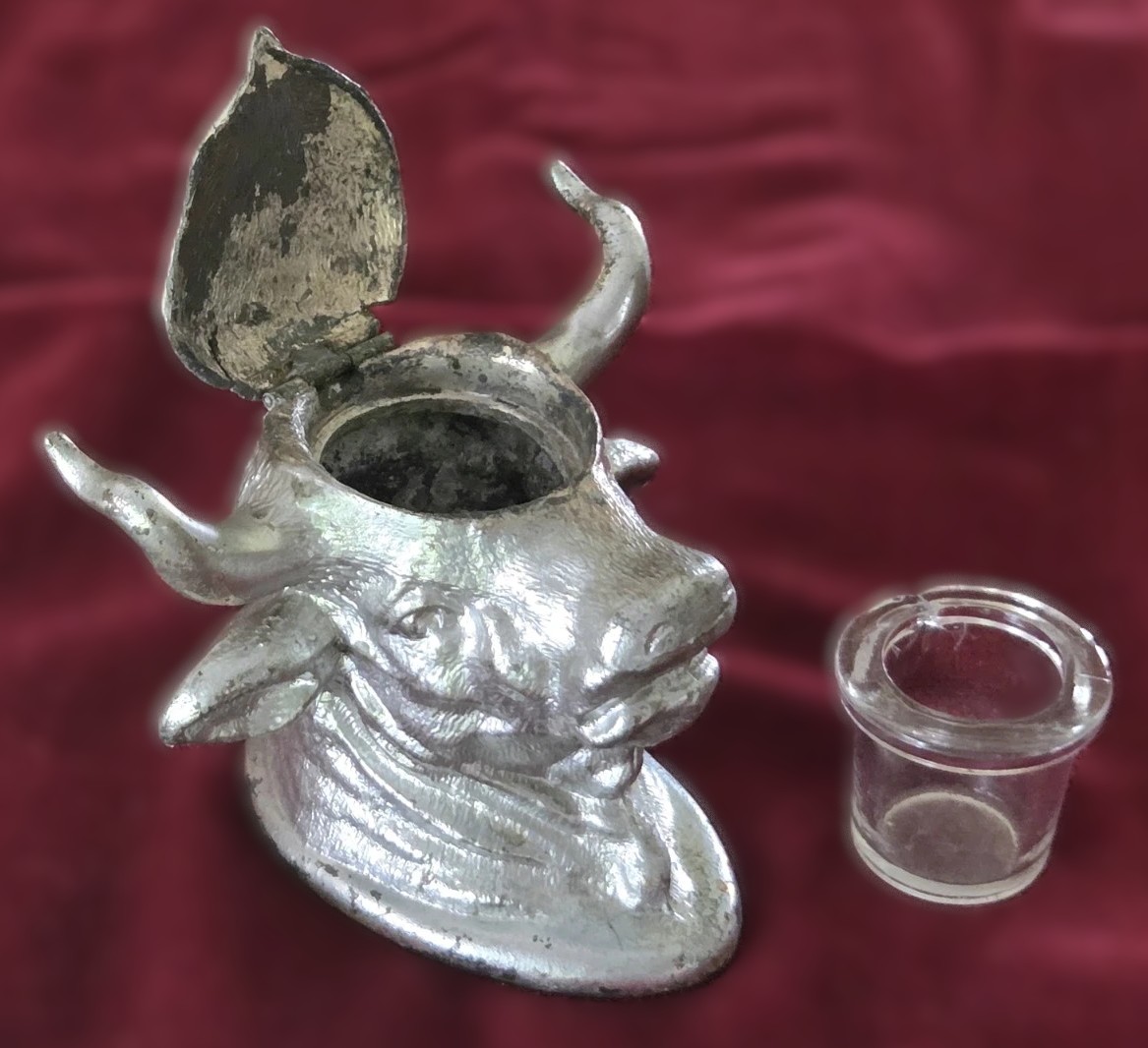 This inkwell is in the form of a detailed bull’s (or longhorn’s) head with prominent horns. The head is made of a cast spelter metal (a zinc alloy), finished with a silver color. The top of the bull’s head is a hinged lid that lifts to reveal the well for the ink. The detail of the metal casting captures the animal’s textured hide, powerful snout, and expression.