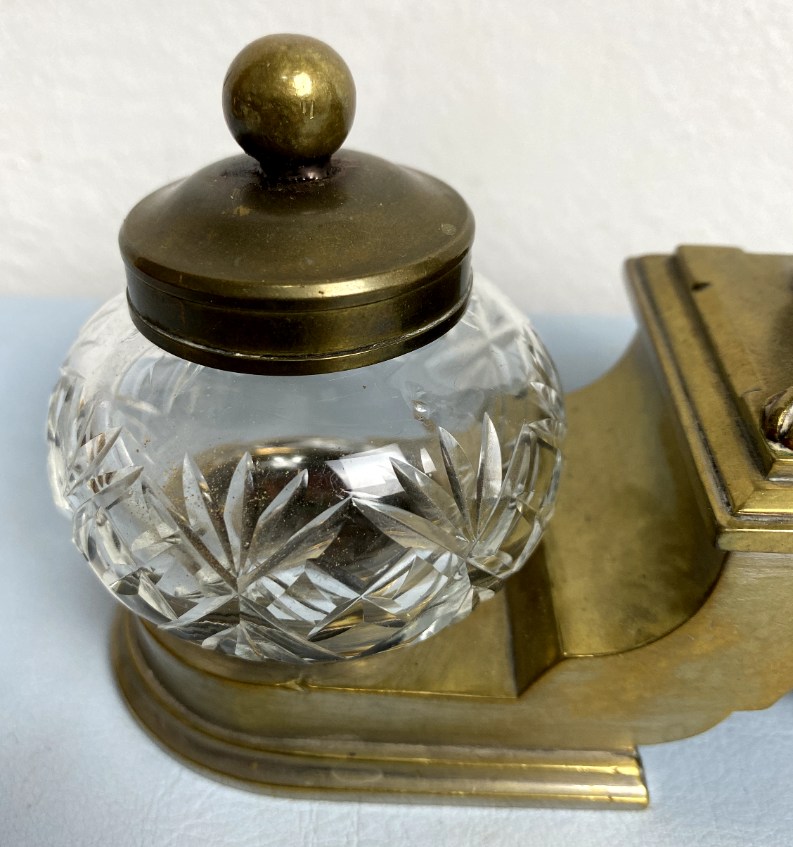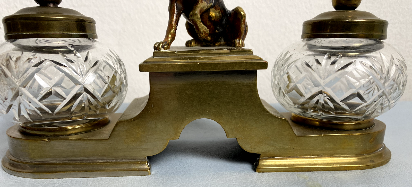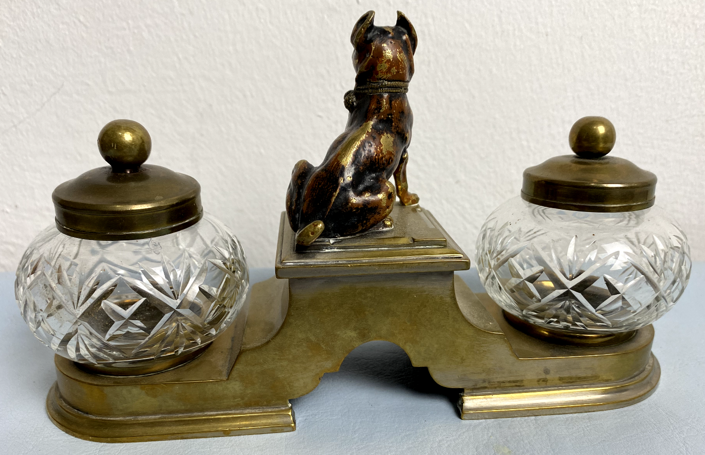 A sitting bulldog (or boxer) sits on a brass inkstand between two globed shaped inkwells with unattached lids.