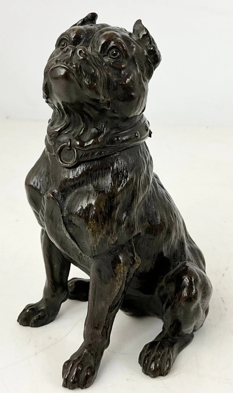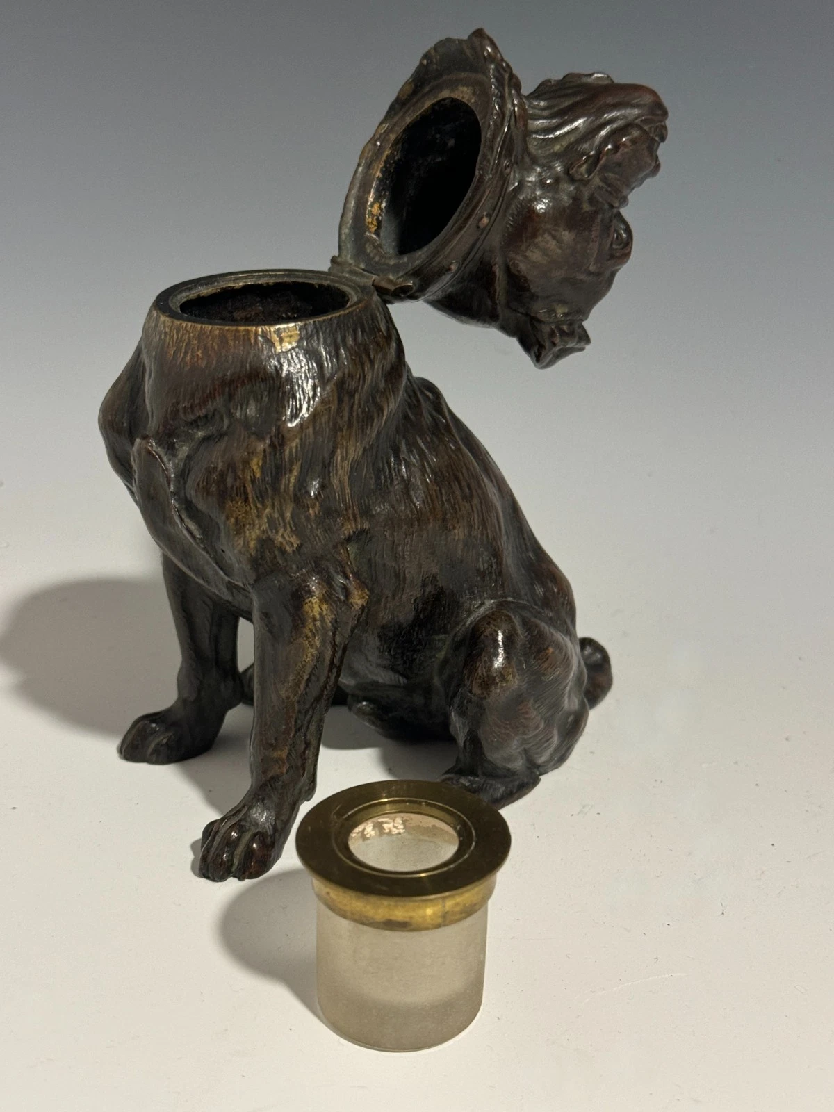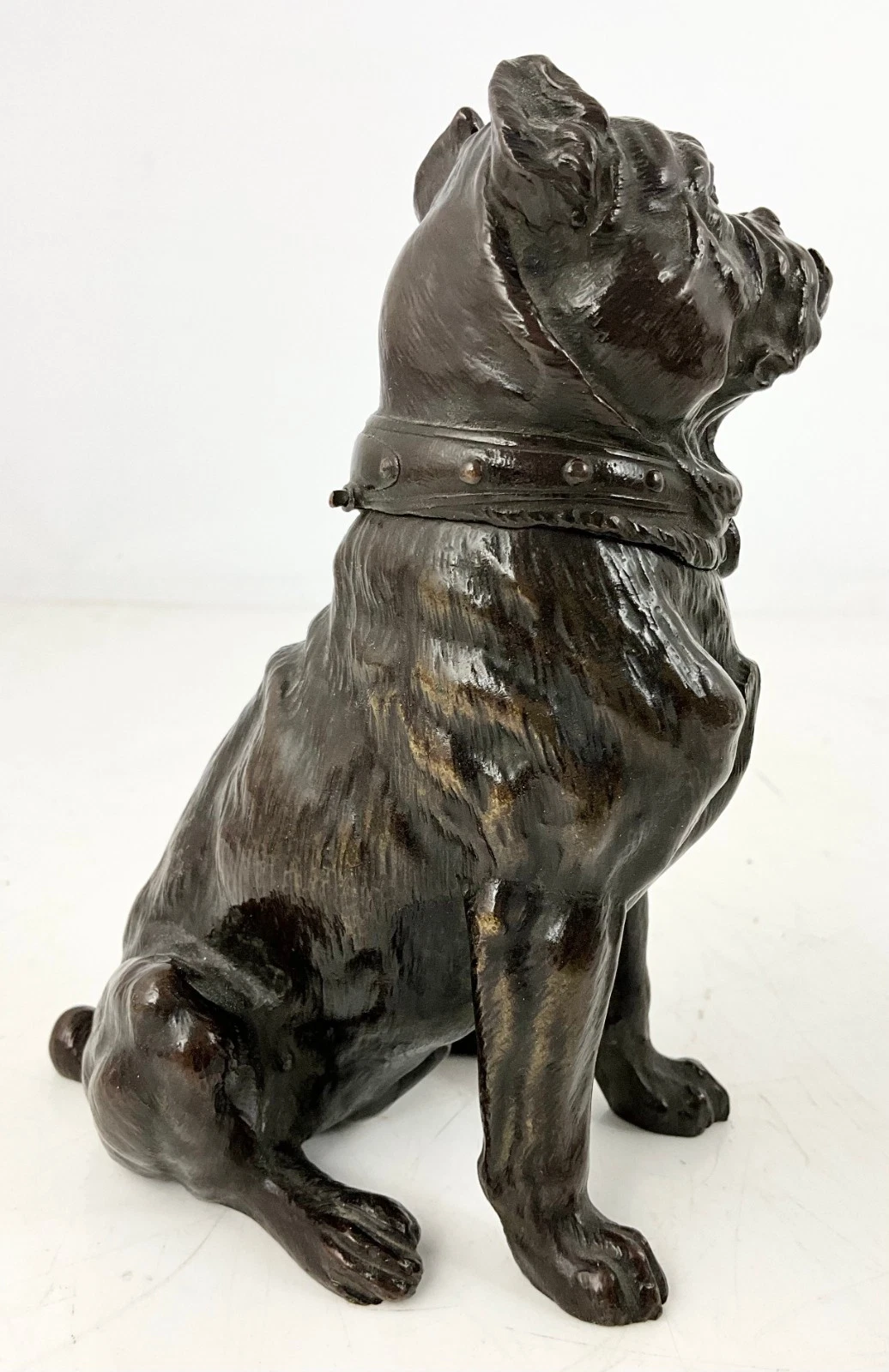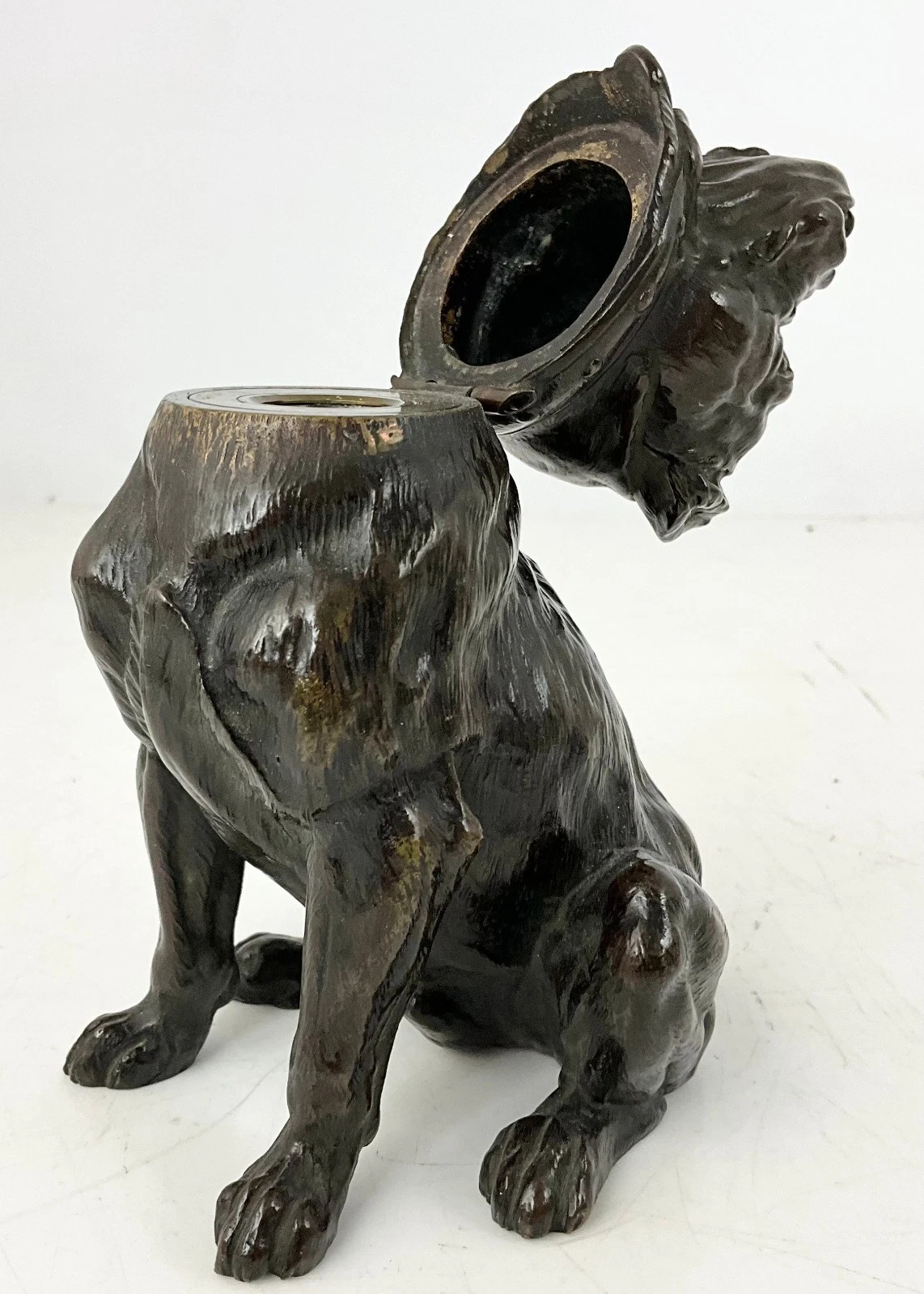 - Construction: The piece is cast in dark patinated bronze with excellent detail in the fur texture and musculature. The head is hinged at the back of the studded collar, which features a decorative ring at the front—a common motif for “tough” or “guard dog” novelties.