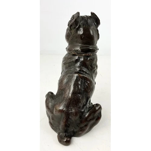 This handsome piece is a classic example of a late 19th-century novelty desk accessory. Based on the “bat ears” and the broad, flat face, the dog is probably modeled after a French Bulldog (Bouledogue Français).