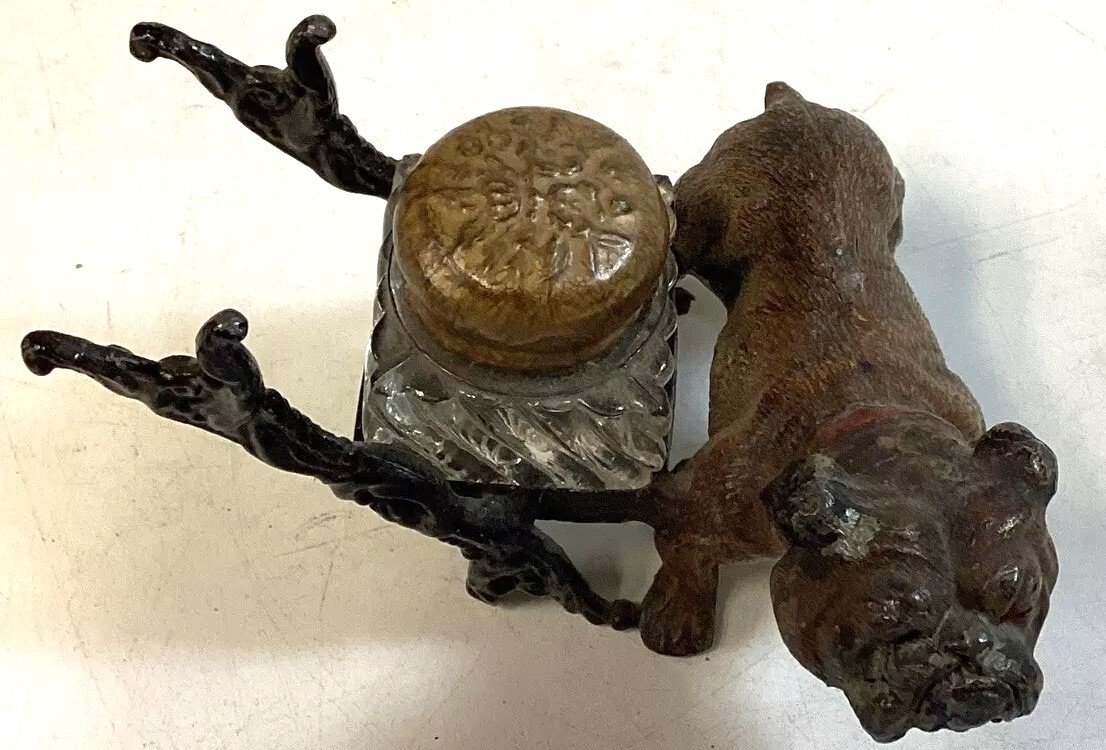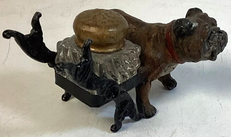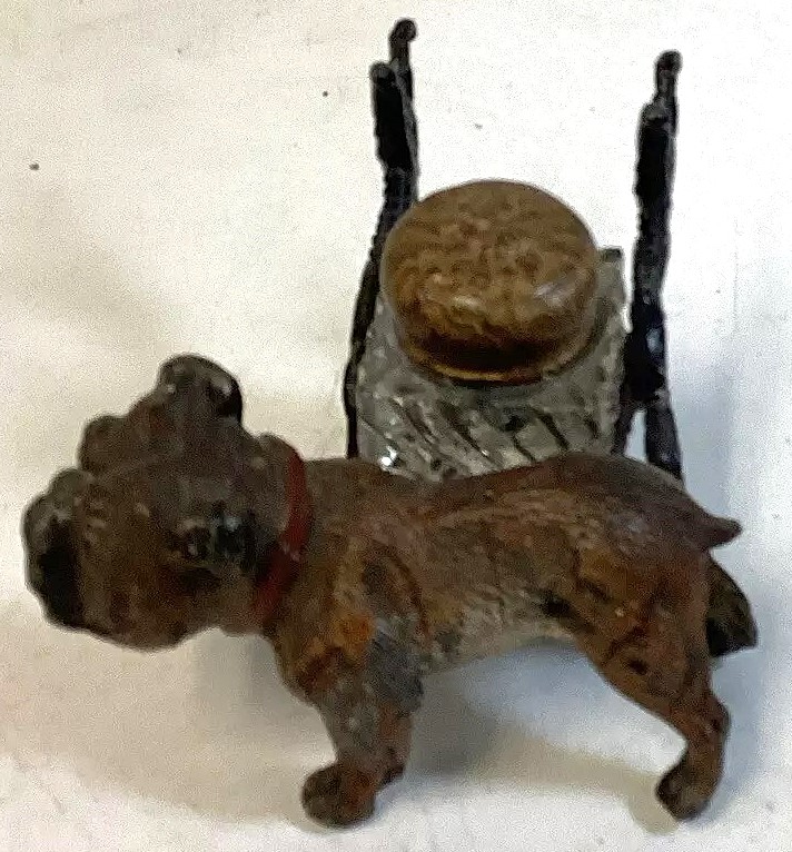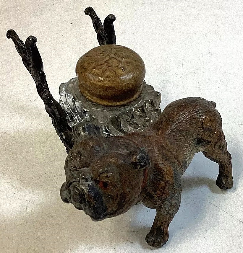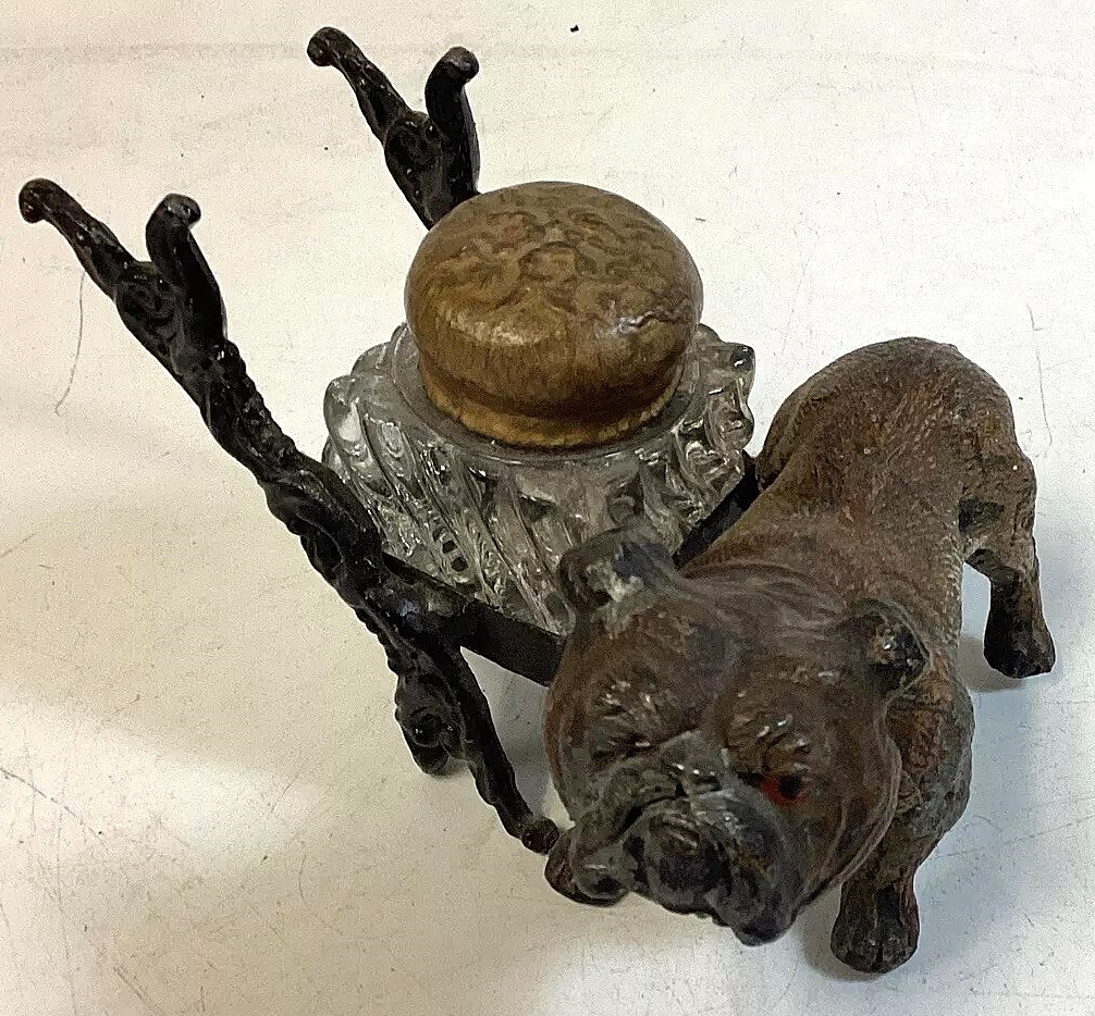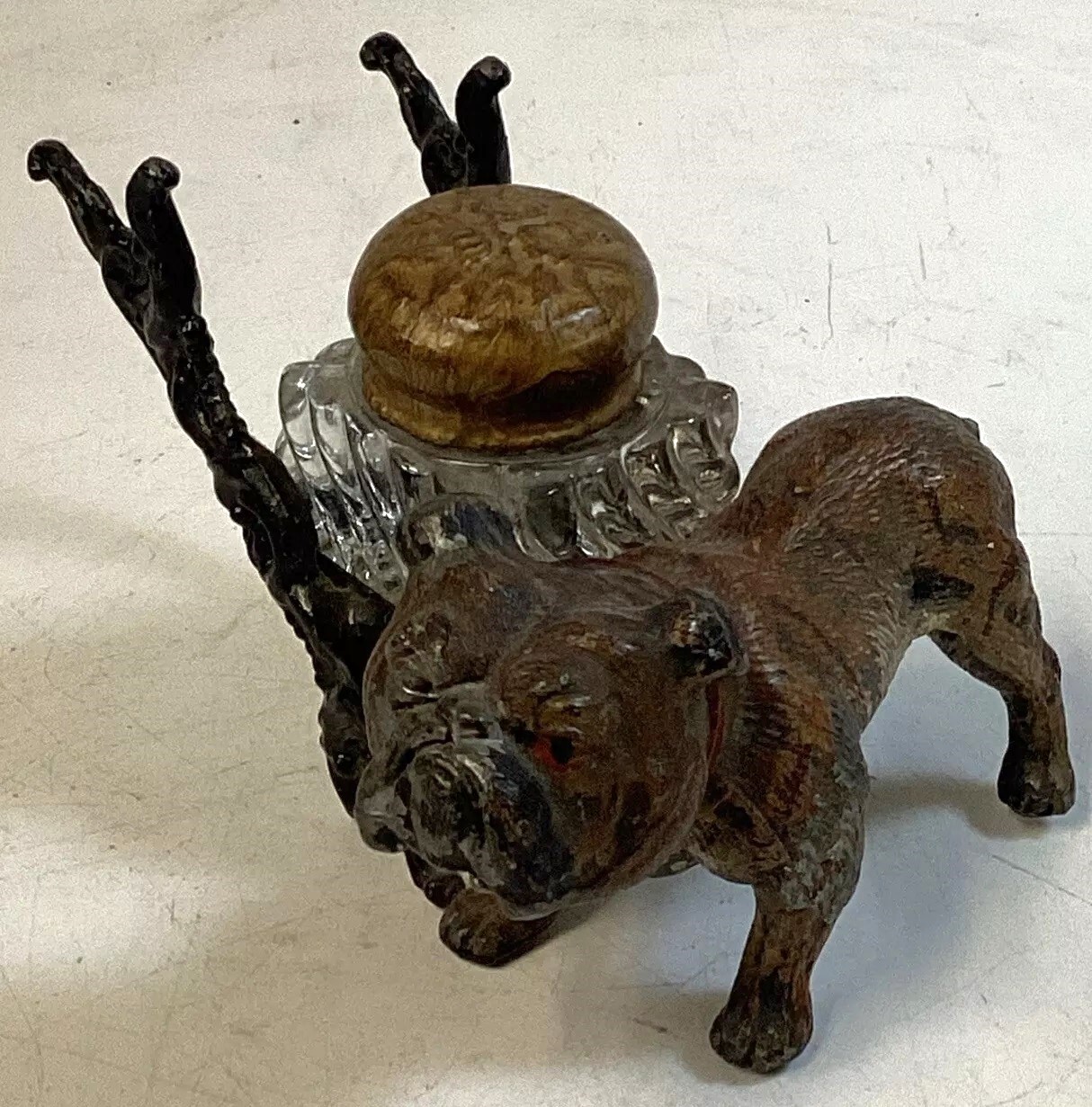A cold-painted, spelter metal bulldog stands next to a glass inkwell with a pen holder attached to the base.