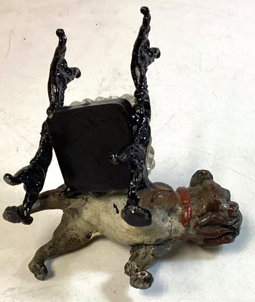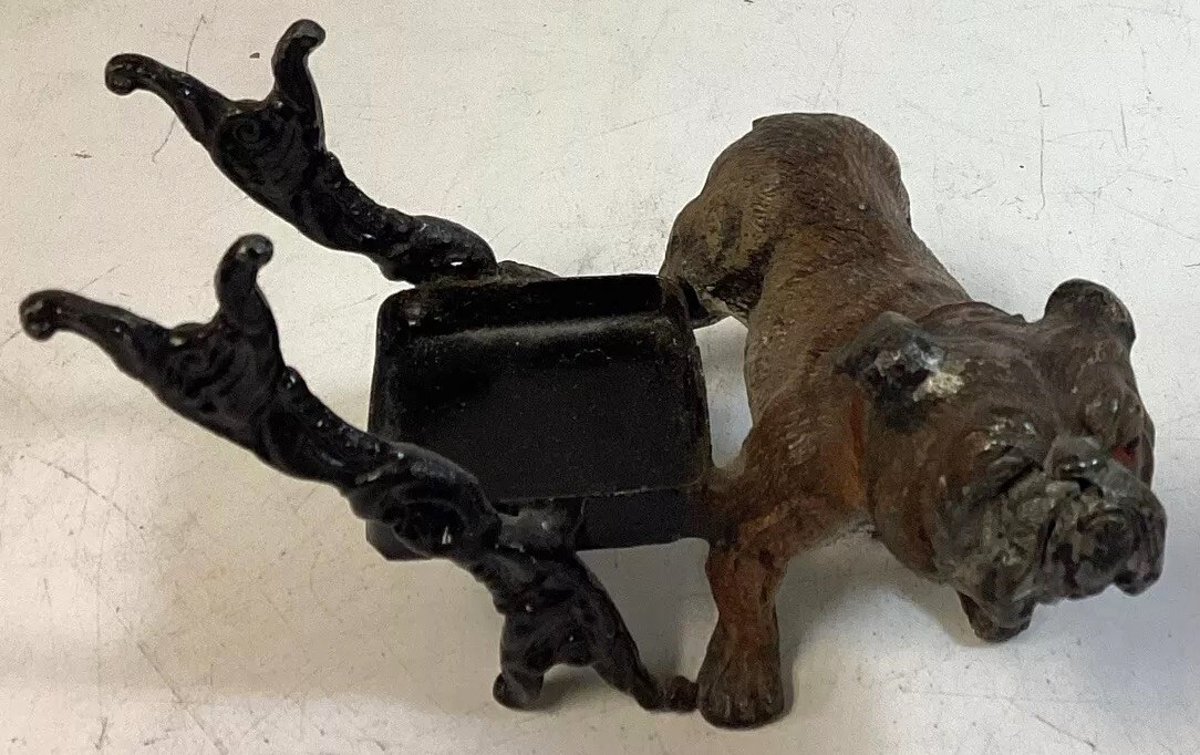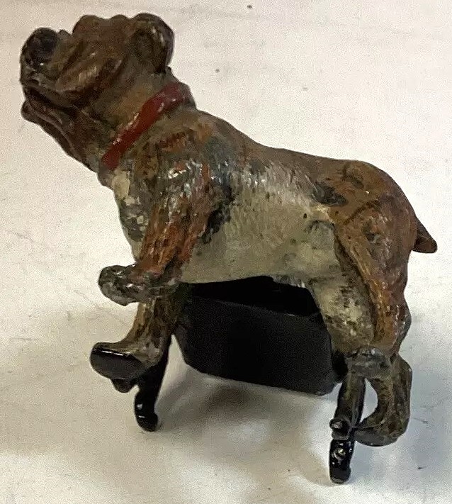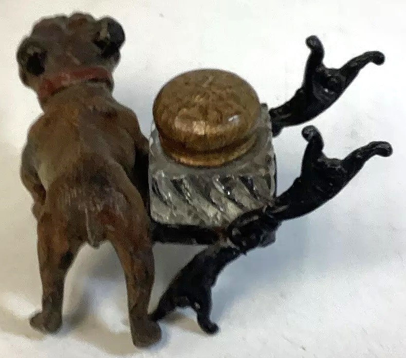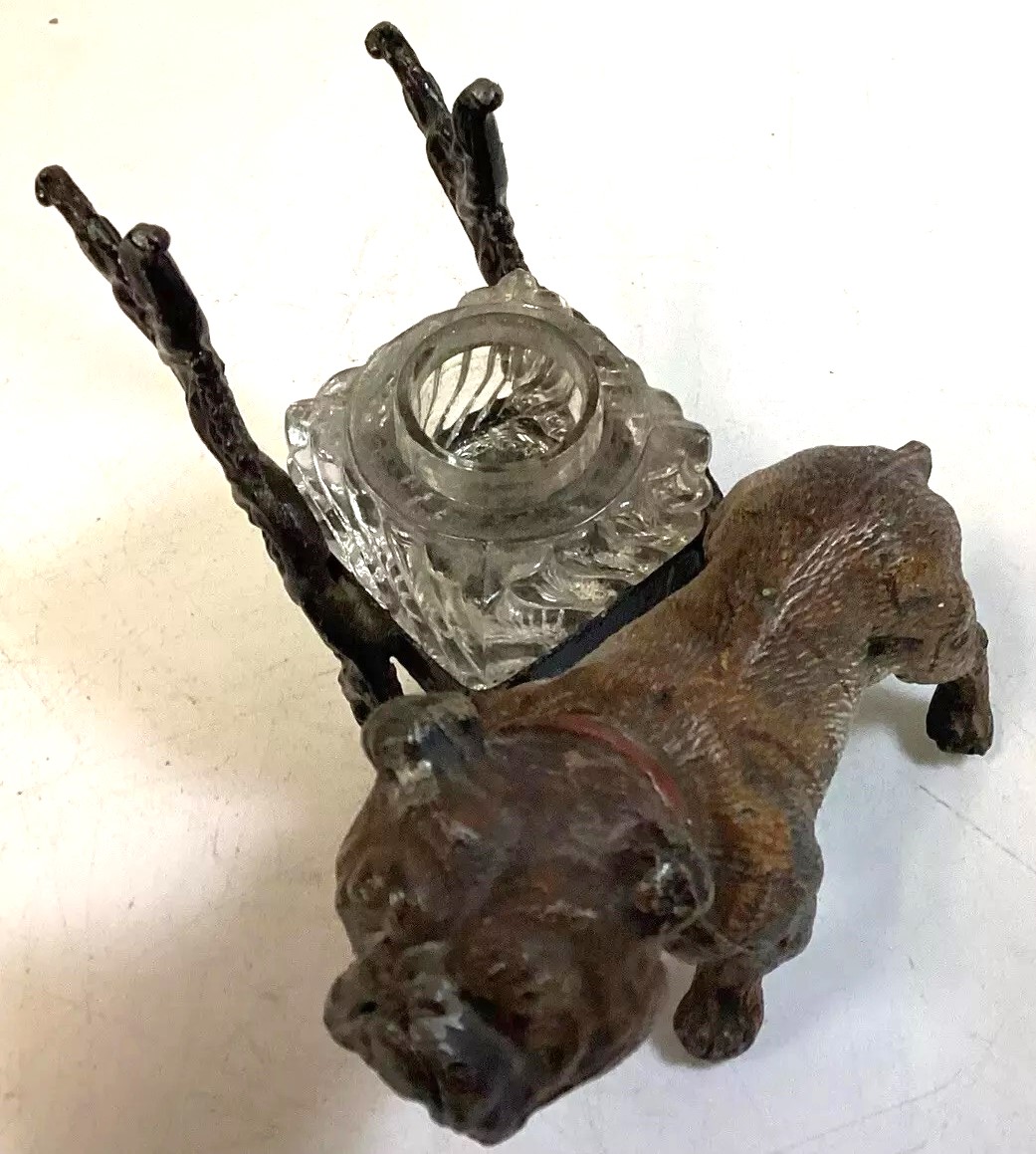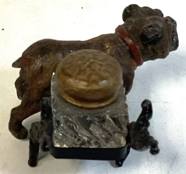 A cold-painted, spelter metal bulldog stands next to a glass inkwell with a pen holder attached to the base.