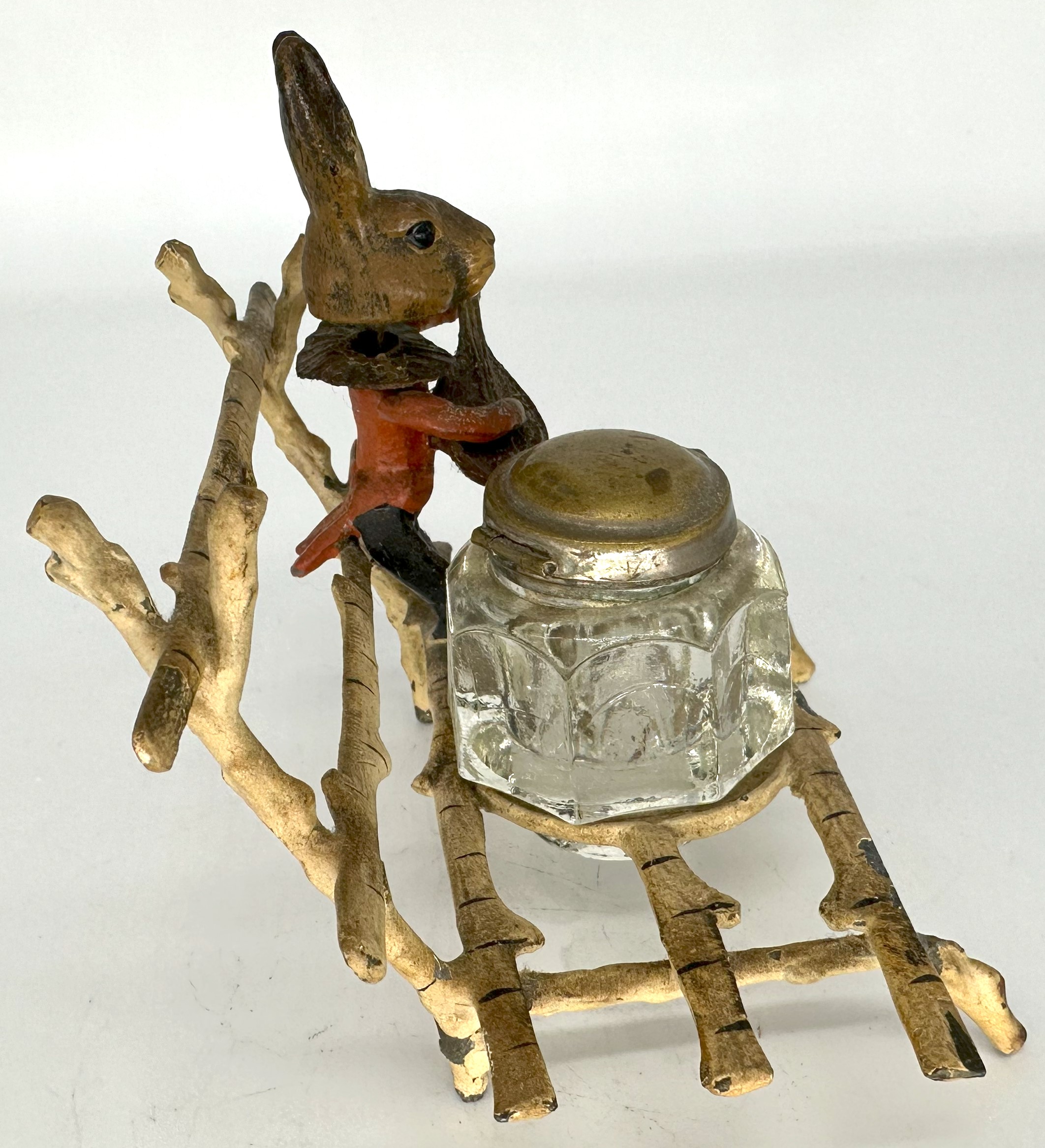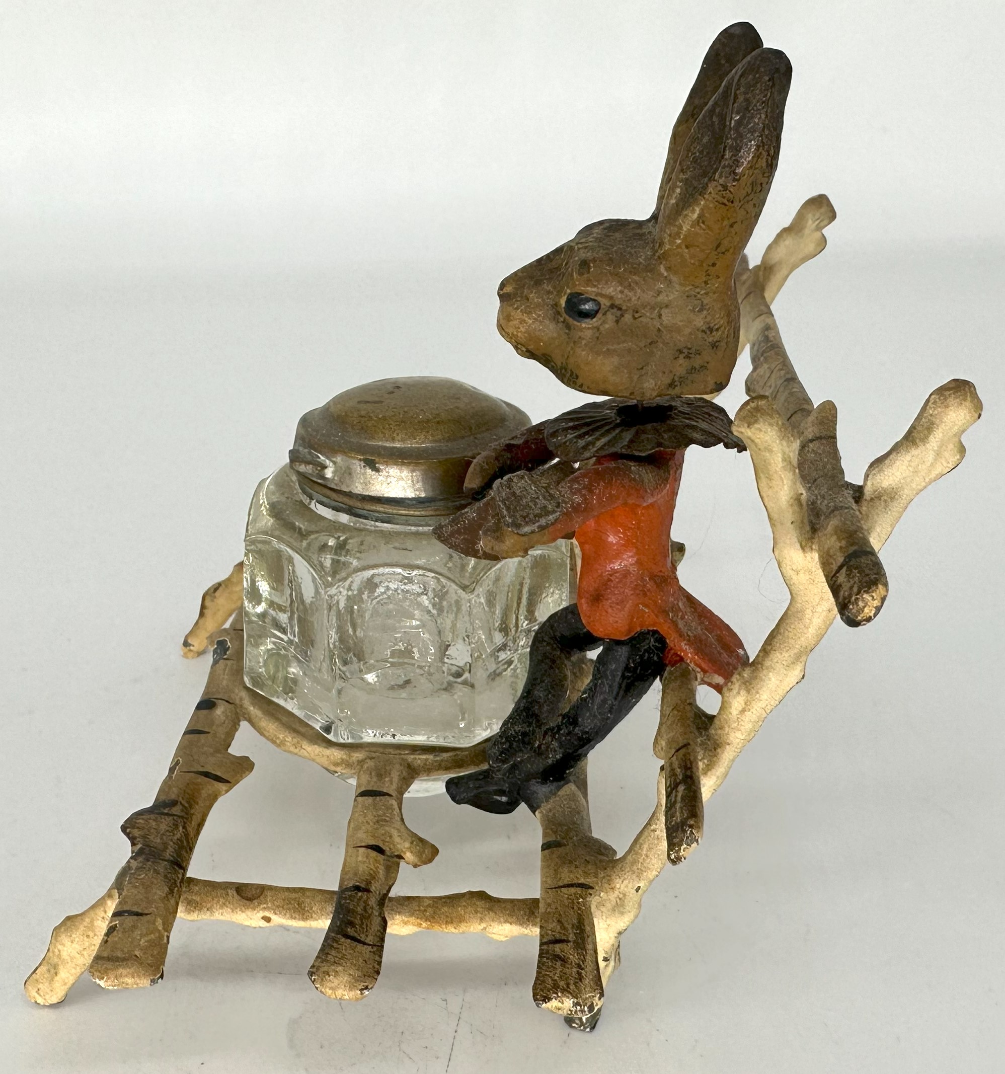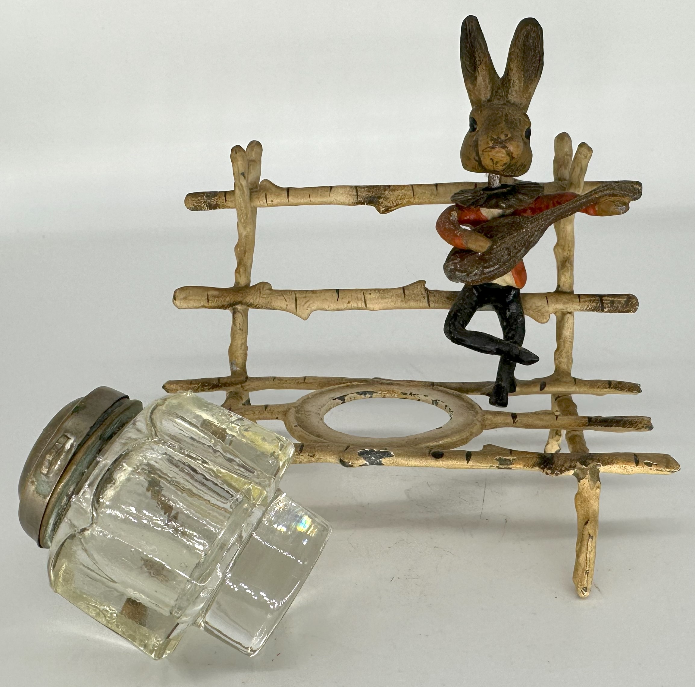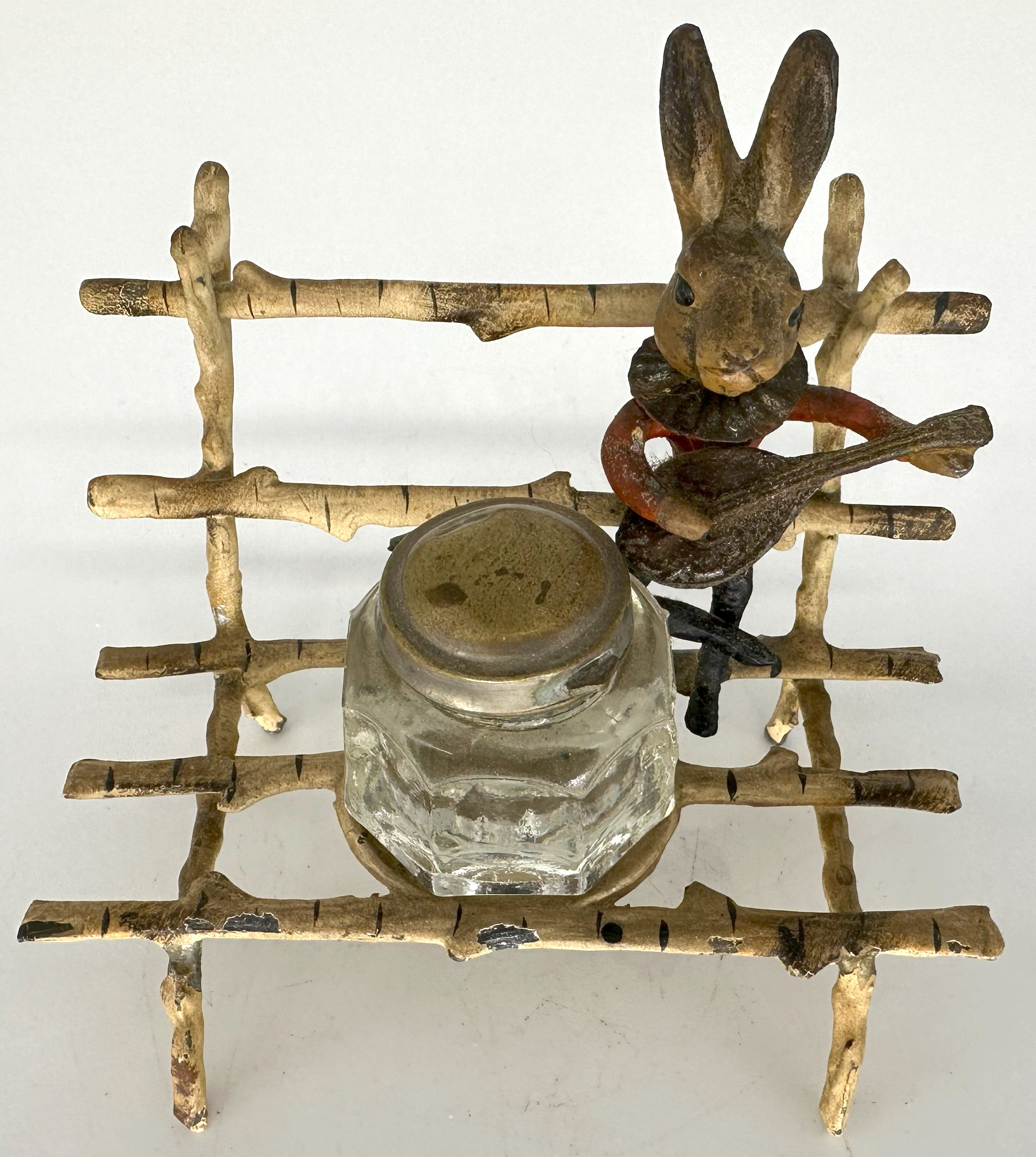 A bobblehead bunny, dressed in a red waistcoat with ruffled collar, is perched on a fence playing a stringed instrument (banjo or ukelele). His head is attached to a metal stick that enables it to nod. The top of the fence forms a pen holder.