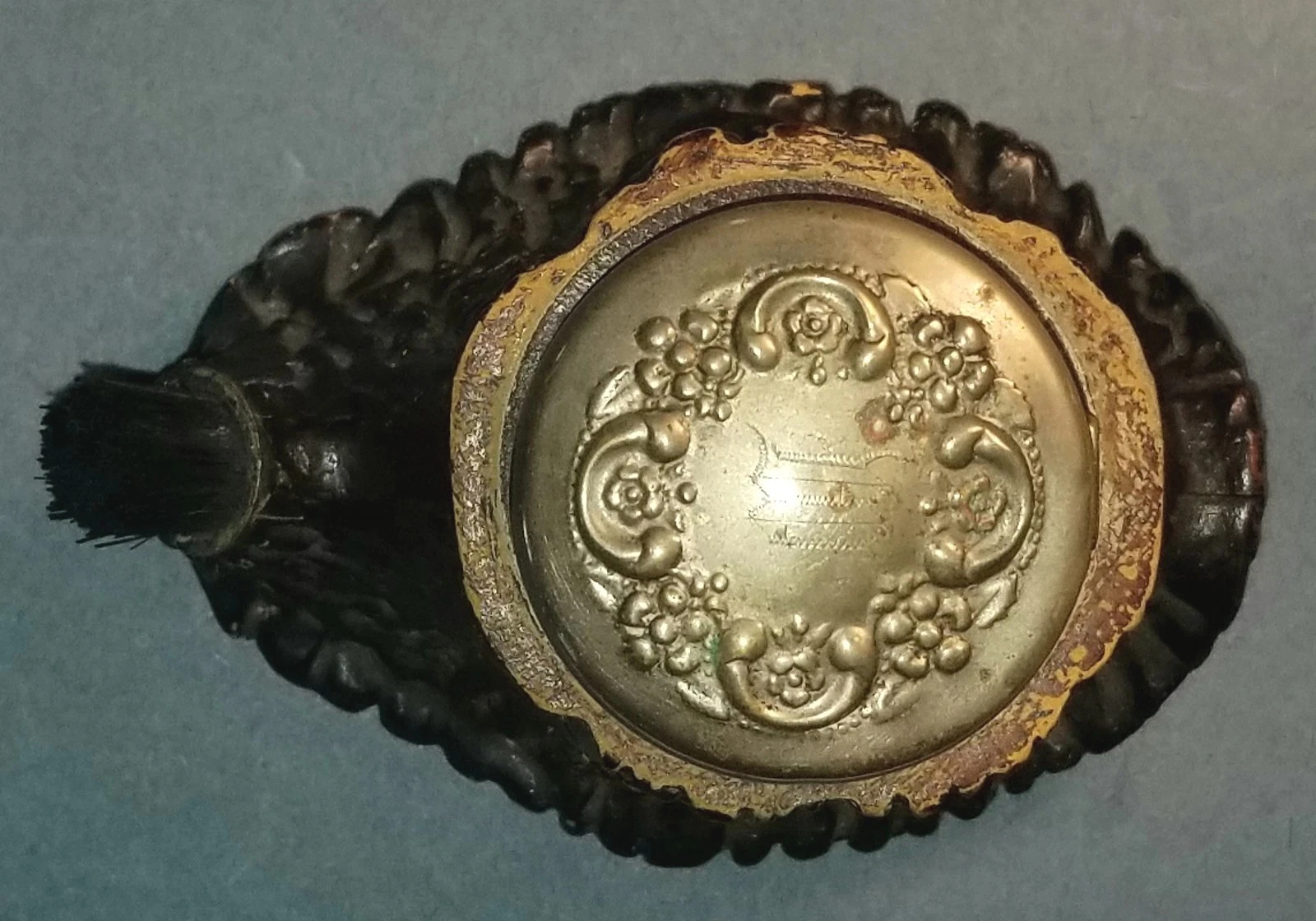 • The Lid & Casing: The metalwork is elaborate. The lid features a repoussé (hammered from behind) floral and foliate design. At the center is a stylized monogram, which appears to be a Gothic-script “JH.” The interior of the lid  shows the reverse of this detailed hand-work.