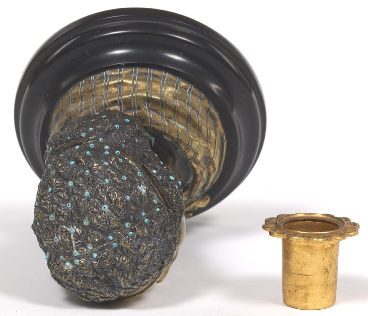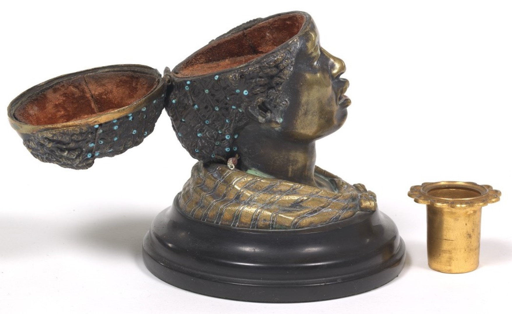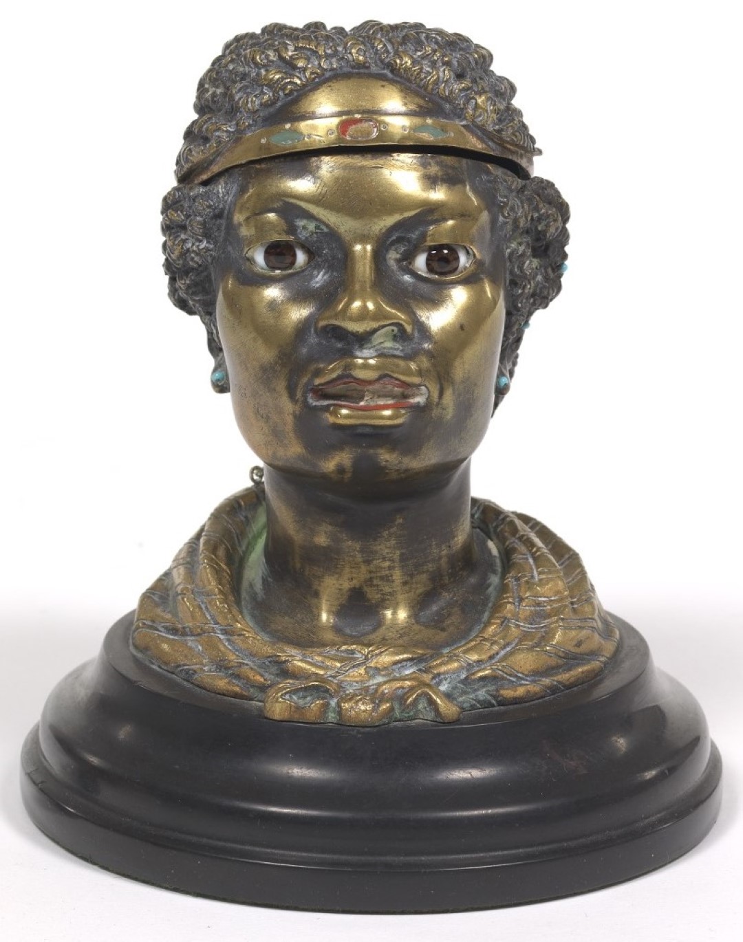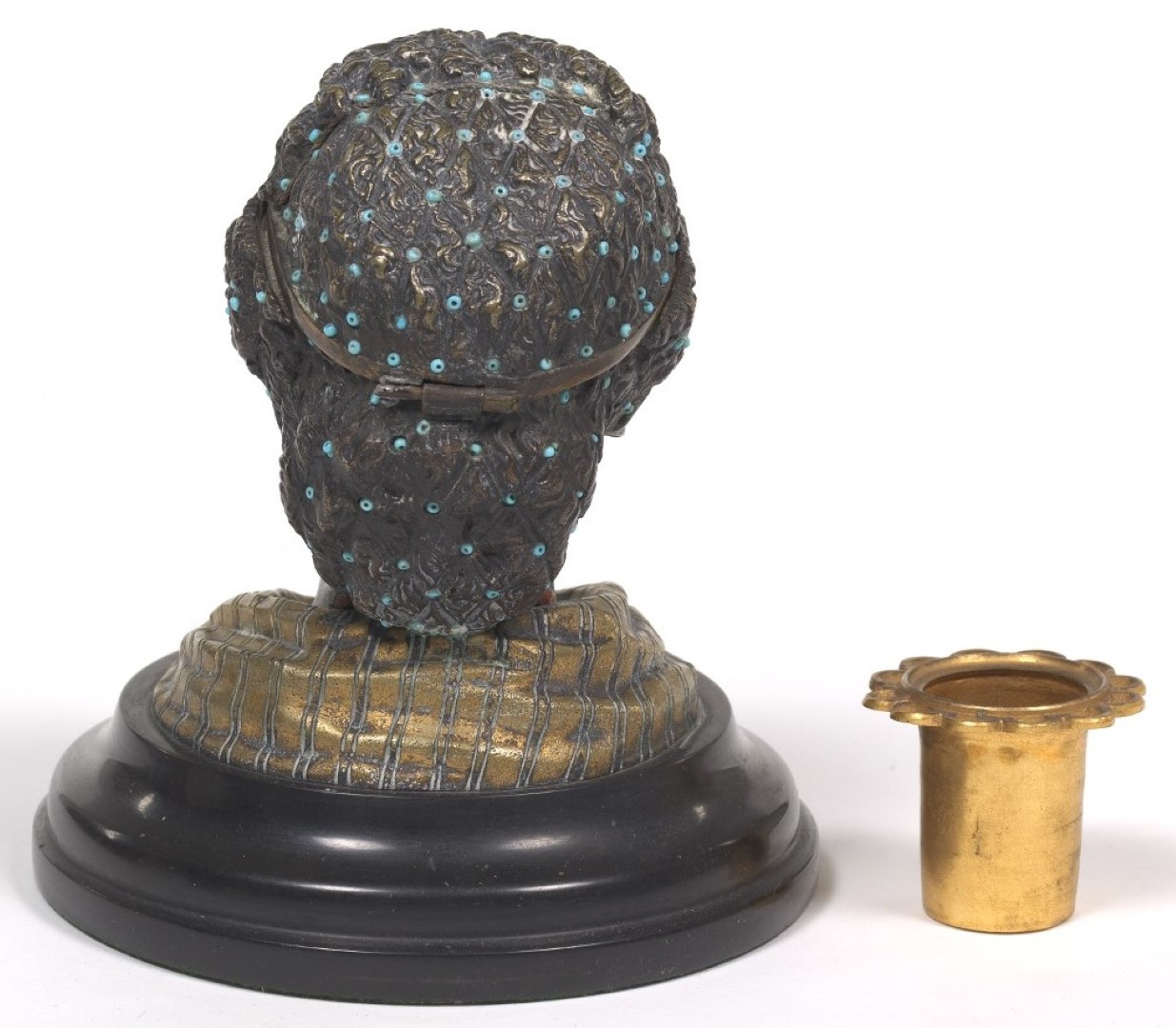 Bronze inkwell in the form of a Moorish woman’s bust attached to a black slate base. She has reverse painted glass eyes, and wears a headband, turquoise earrings, and a turquoise accented hair net. Lift the top of her head to access a velvet lined space which holds a metal insert. I believe this piece was made by the Goldscheider Porcelain Factory in Austria.