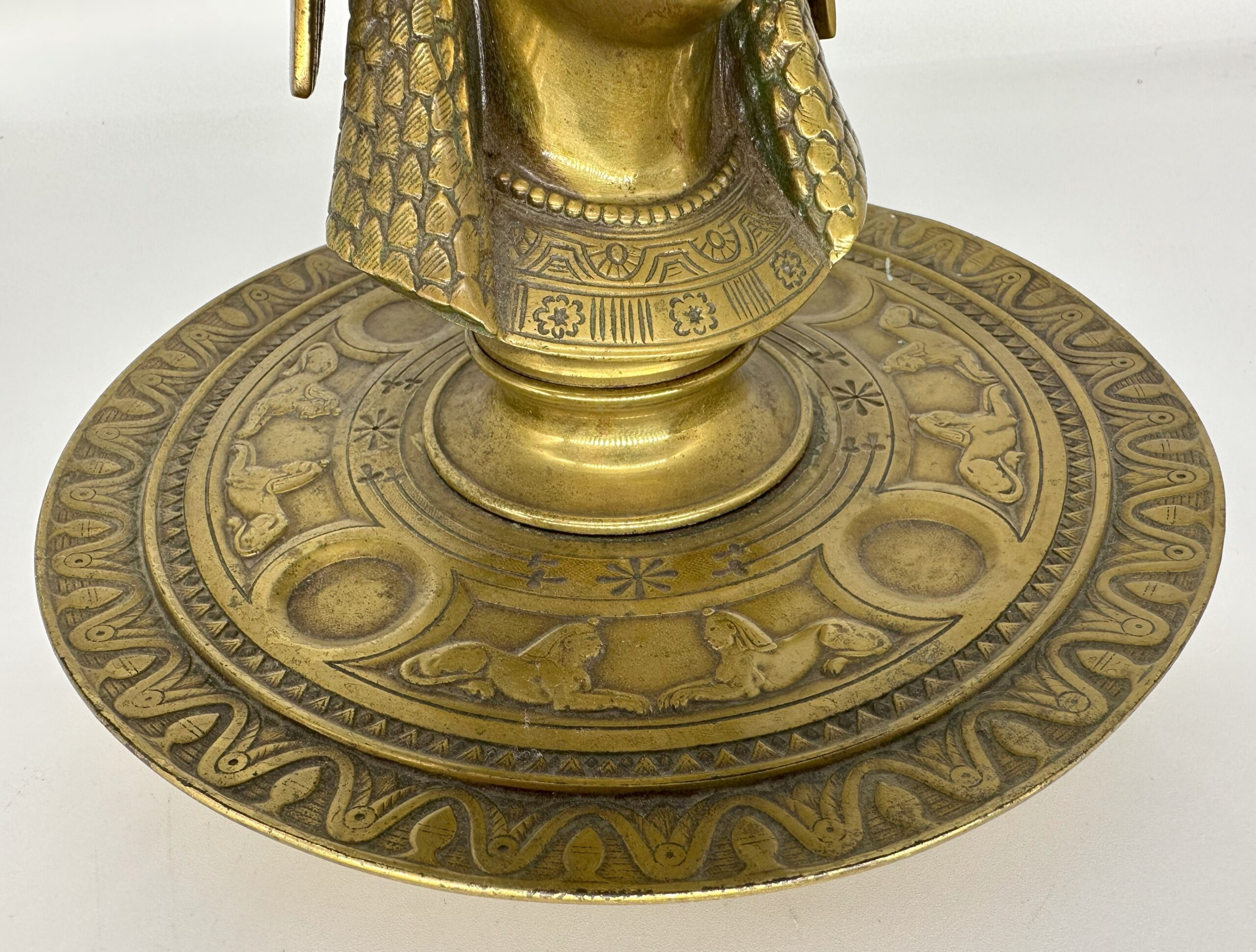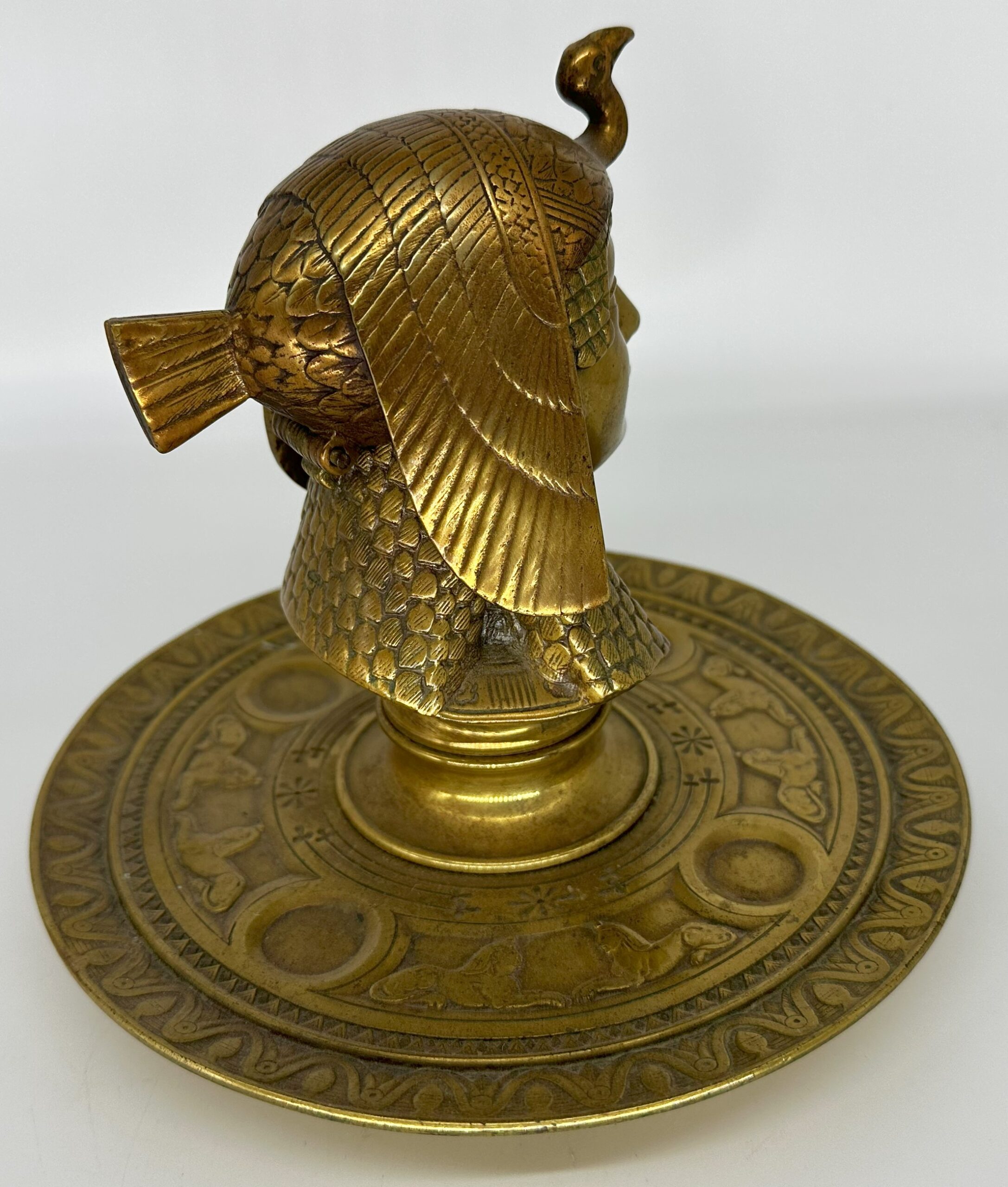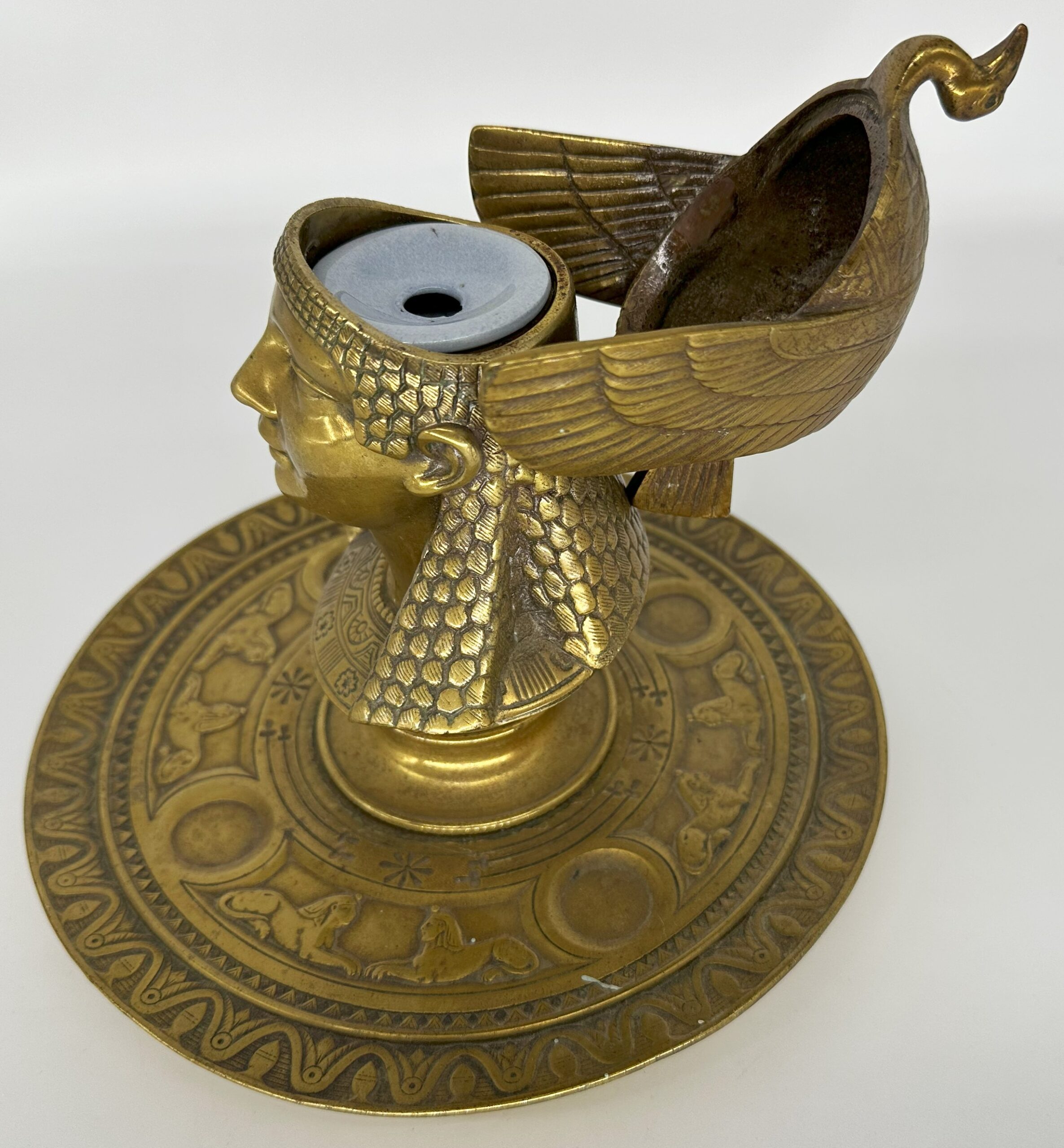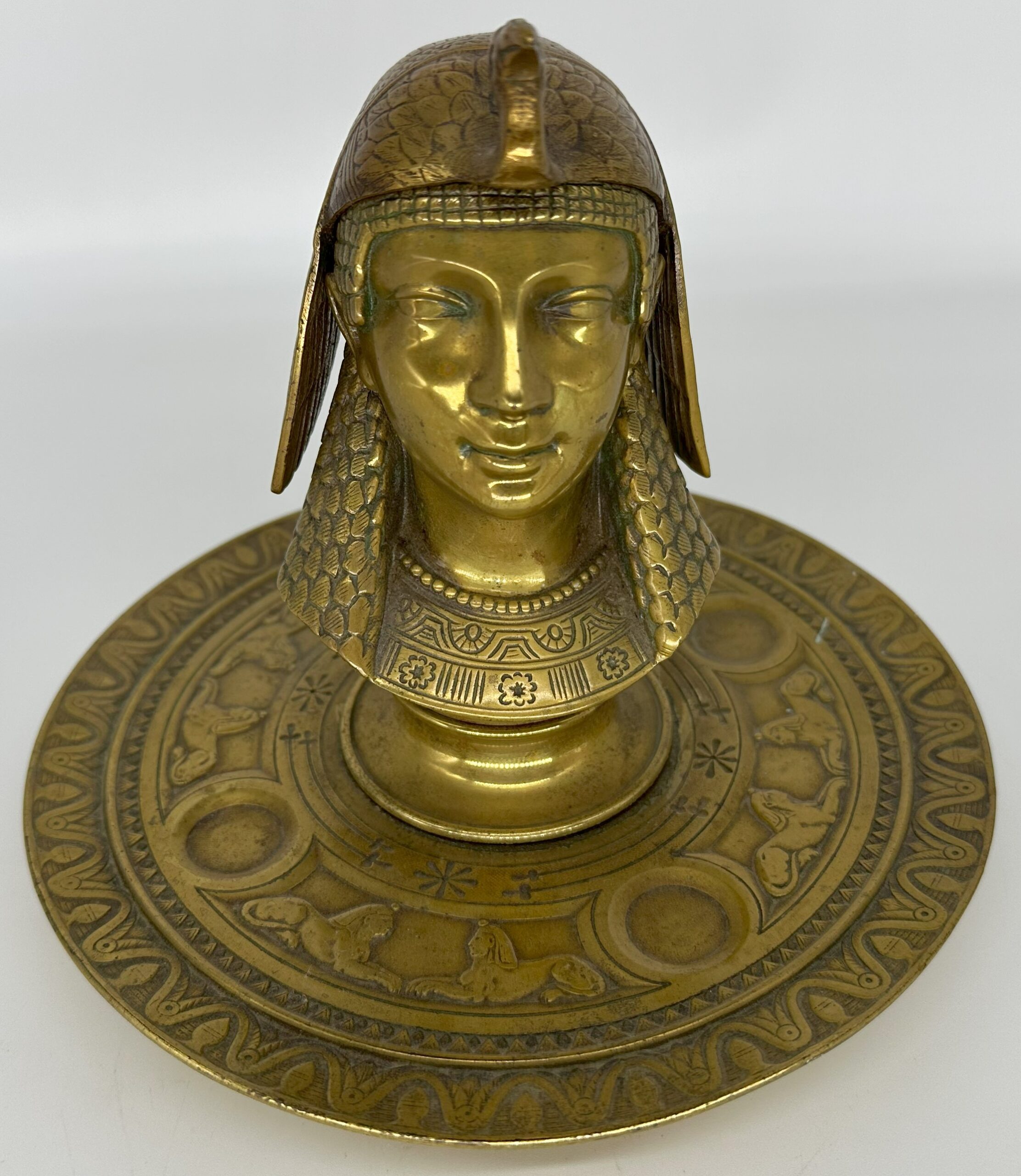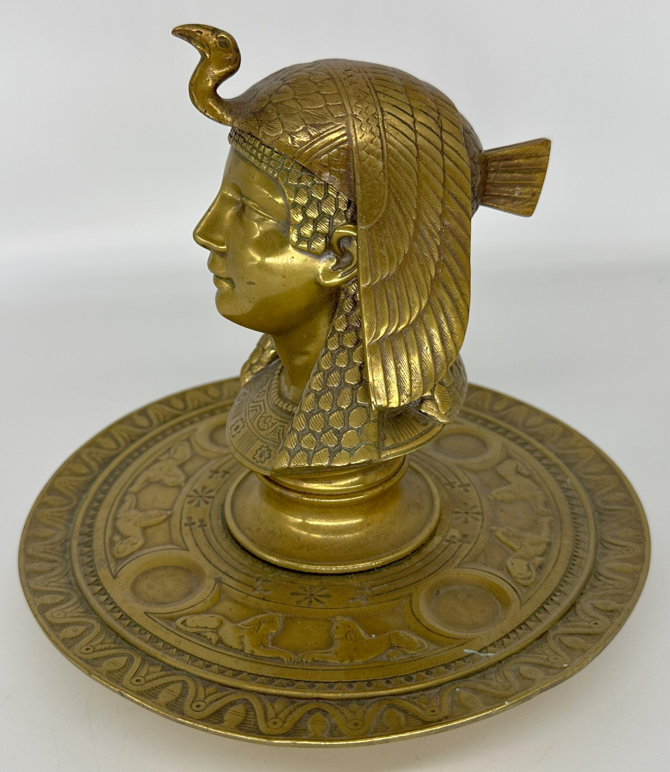 Egyptian style inkstand with the bust of Cleopatra. She wears a vulture crown – a headdress in the shape of a vulture draped over her head, with its wings hanging down on the side. The head is hinged and opens to access the inkwell. The saucer base is decorated with sphinxes face to face interspersed with circles.
