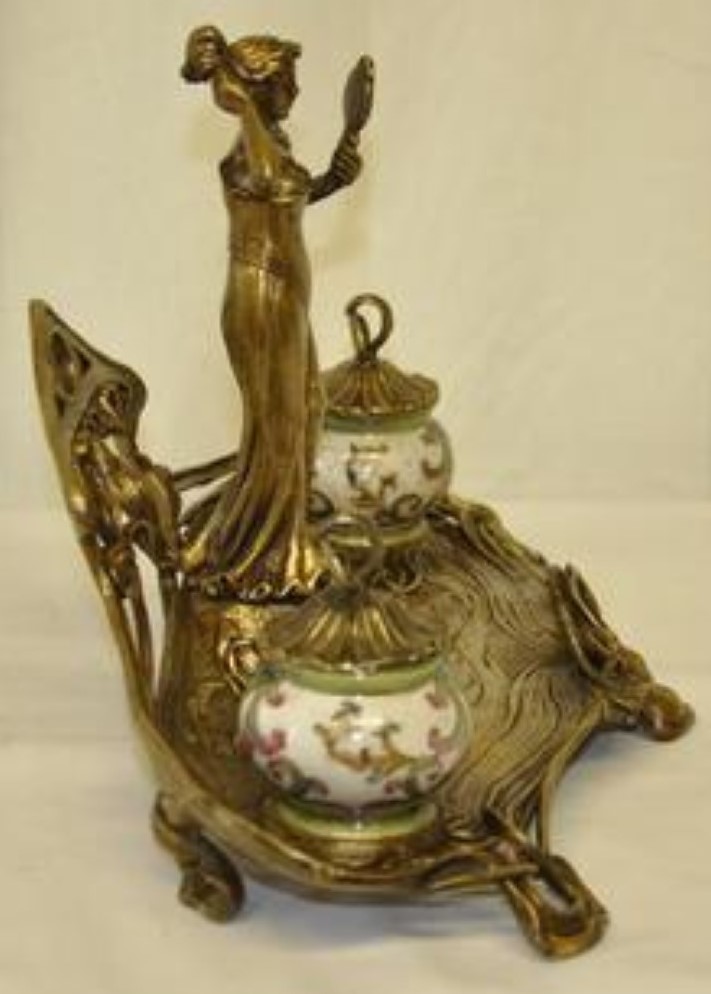 “Exquisite antique Art Nouveau lady bronze and porcelain Inkwell This is a very elegant and decorative Art Nouveau inkwell in excellent condition. It features a woman standing on a pedestal vainly gazing at her reflection in the mirror. The base has intricate carvings of flowers and vines with hand painted porcelain ink wells standing on either side. The inkwells are in great condition and have the original covers. This is an exquisite piece that would look great on any desk”.