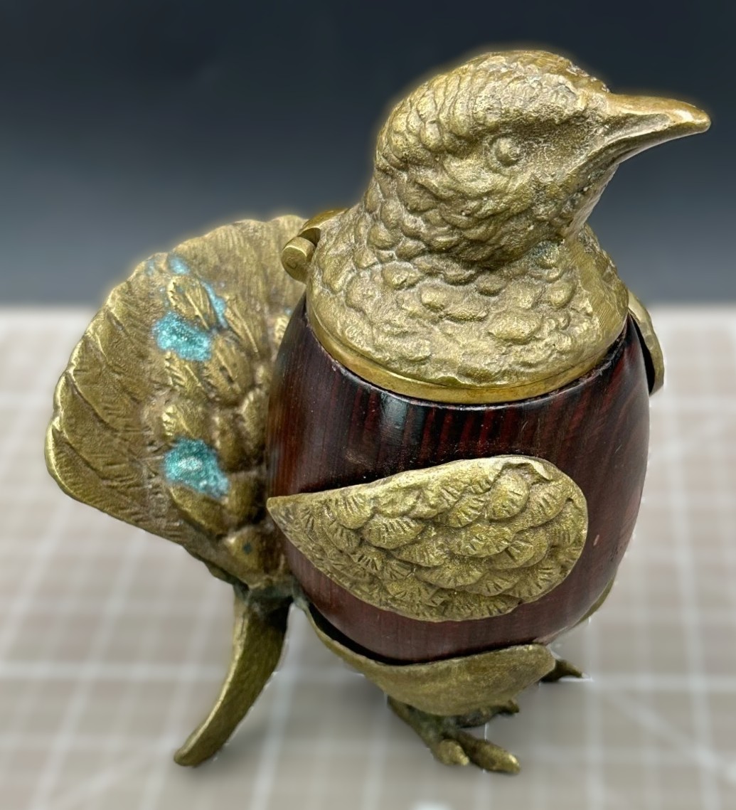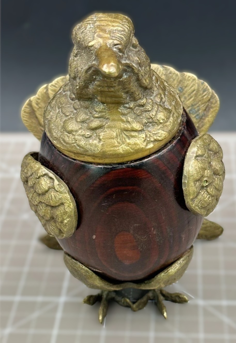 Arthur Court, founded in 1966, is a company that designs and produces giftware. Starting around 1976, the company designed pieces referred to as “trinket boxes” or “inkwells” in the form of animals, including a bulldog, rabbit, penguin, and bird. The body for each animal is turned wood, coconut shaped. Brass heads, feet, wings, tails, feathers, etc. were then attached to the wood, with the head hinged, opening to a brass cup.