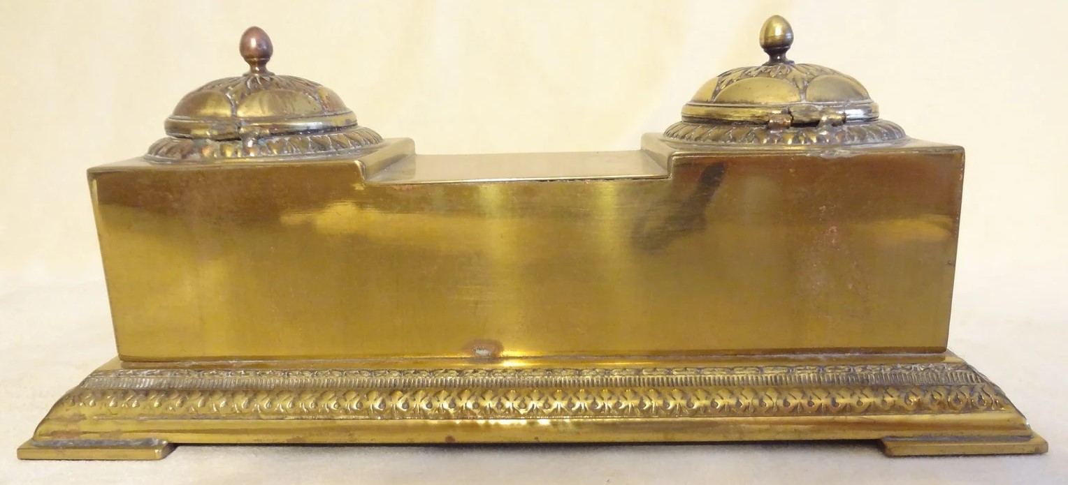 This brass double inkstand has a traditional look, and even has glass inserts. Just be aware that it was made in Korea in the 1980’s and was sold as a decorative piece.