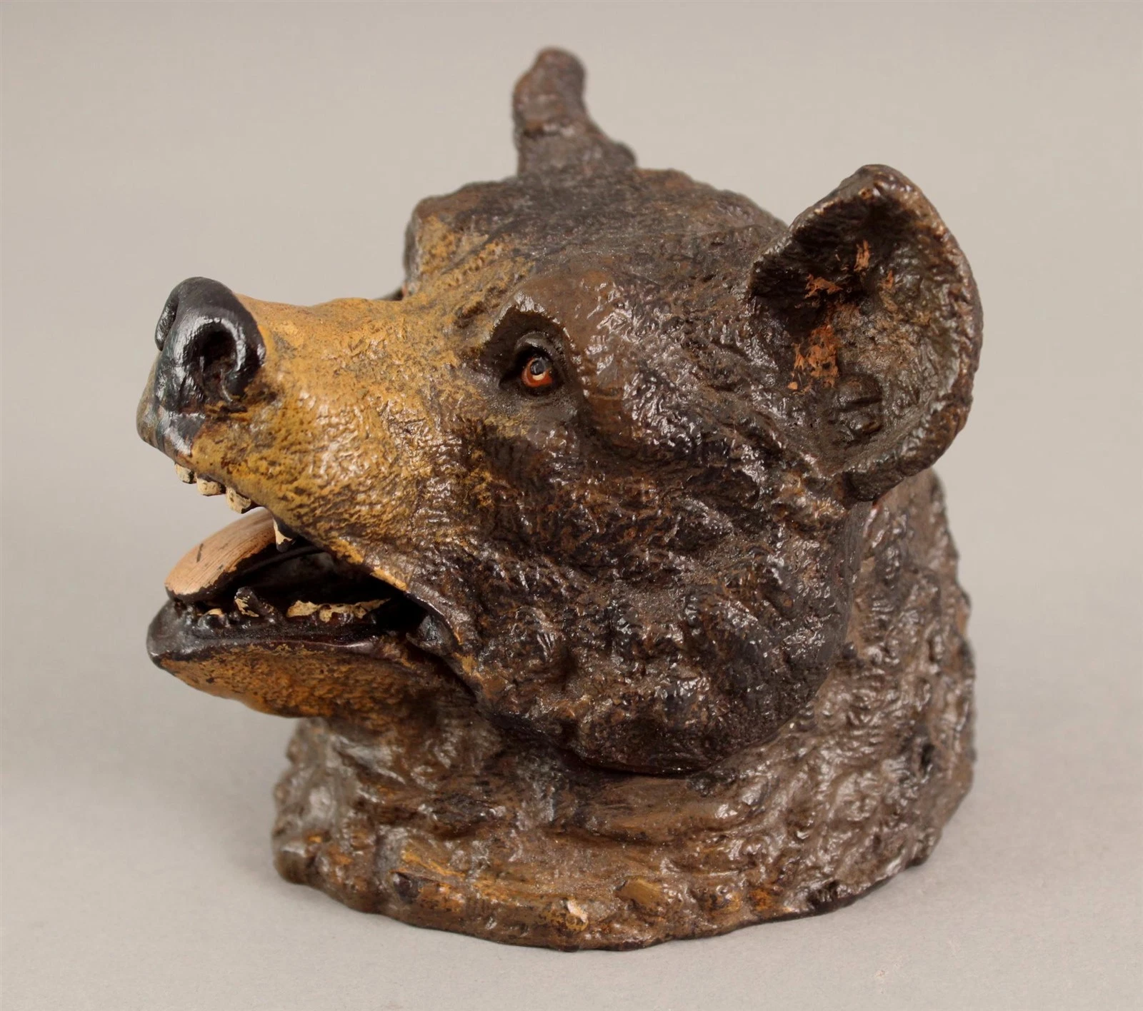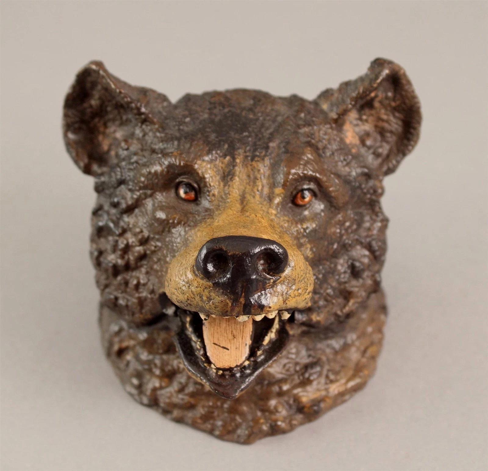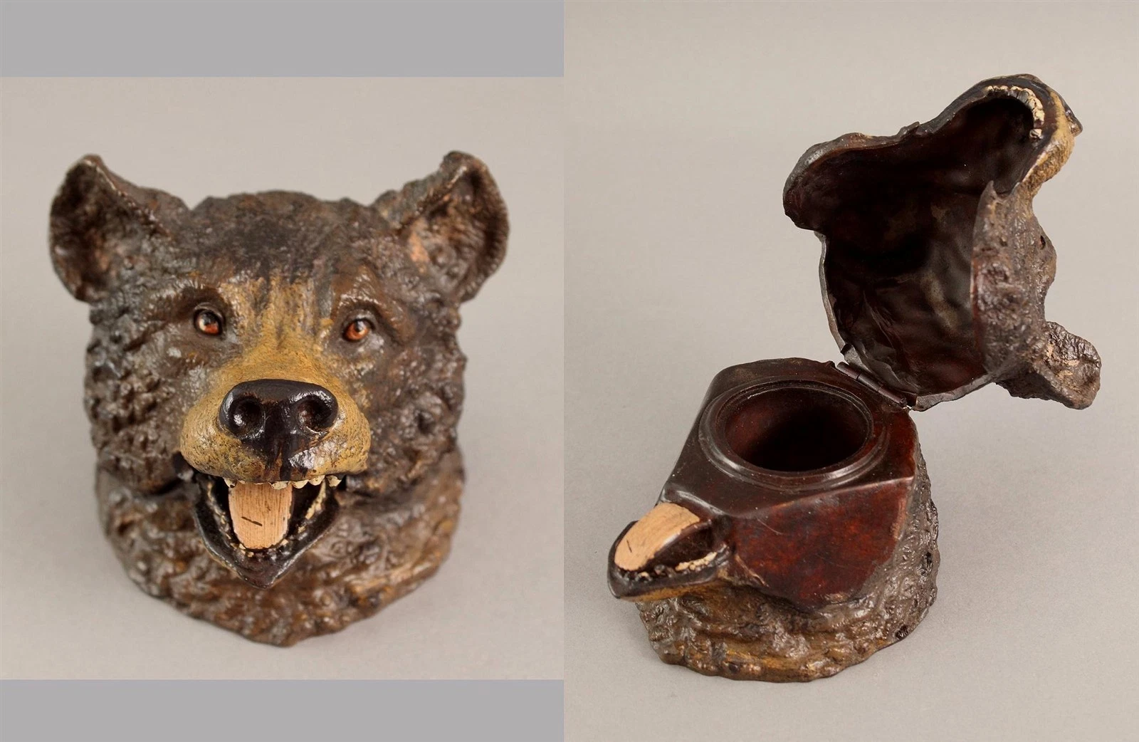 This charming bear’s head inkwell is believed to be a modern production, mimicking the late 19th to early 20th-century Austrian or German cold-painted bronzes, especially those from the Bergman workshop. But unlike the originals, they’re made for decorative appeal, not utility or craftsmanship. And, unfortunately, they are sold as antique pieces.