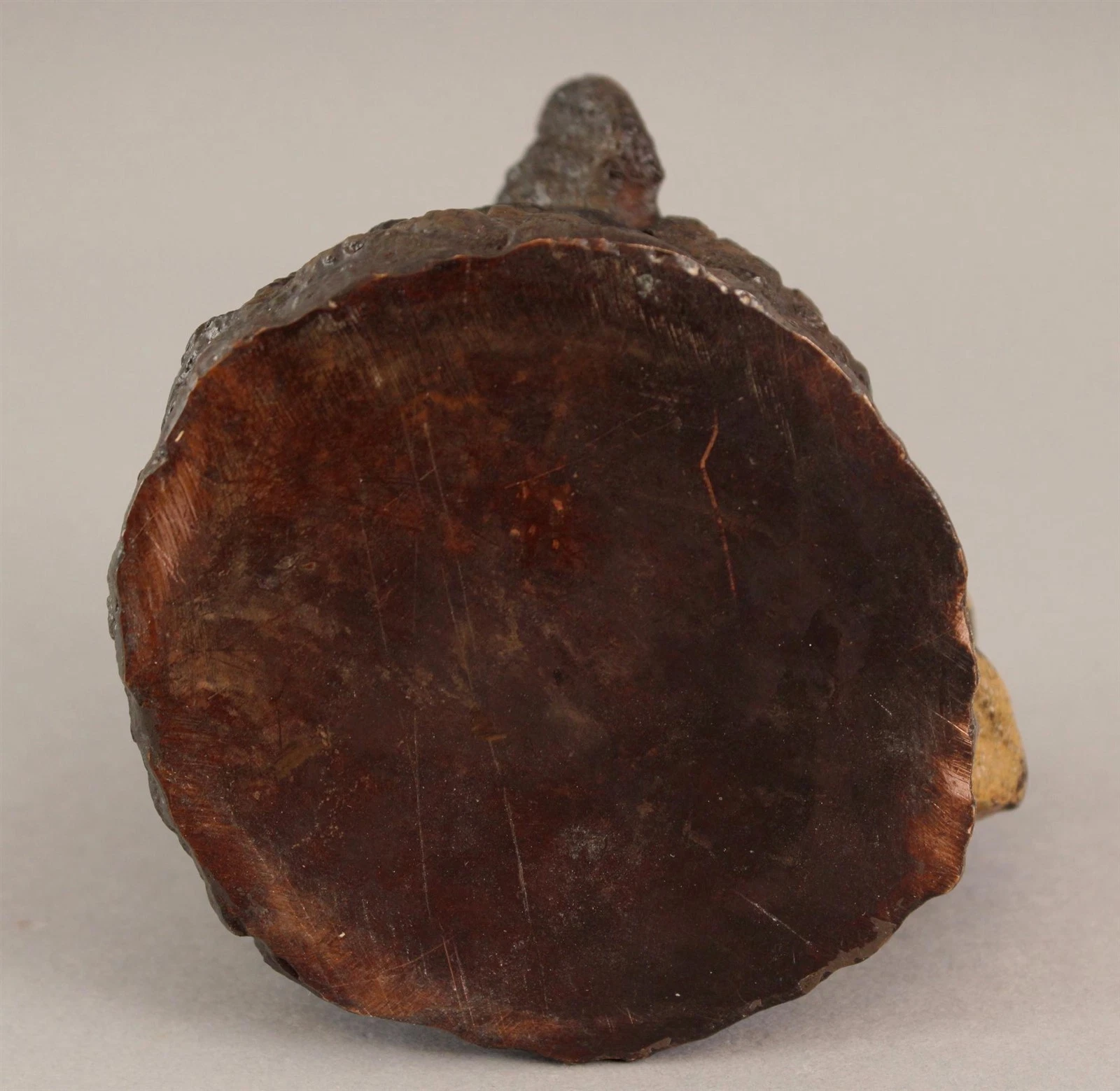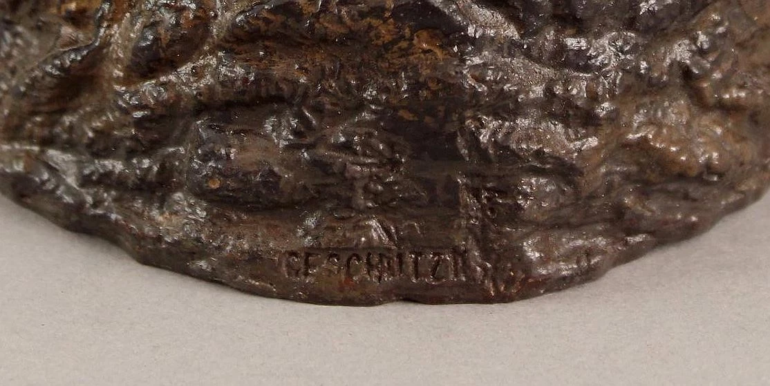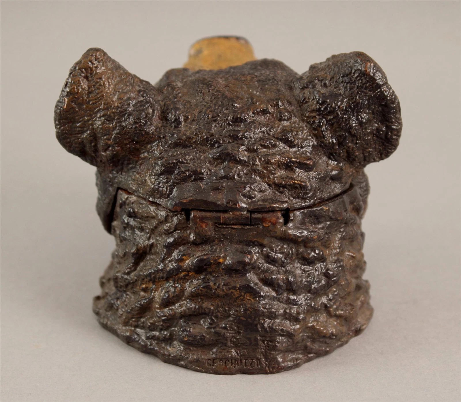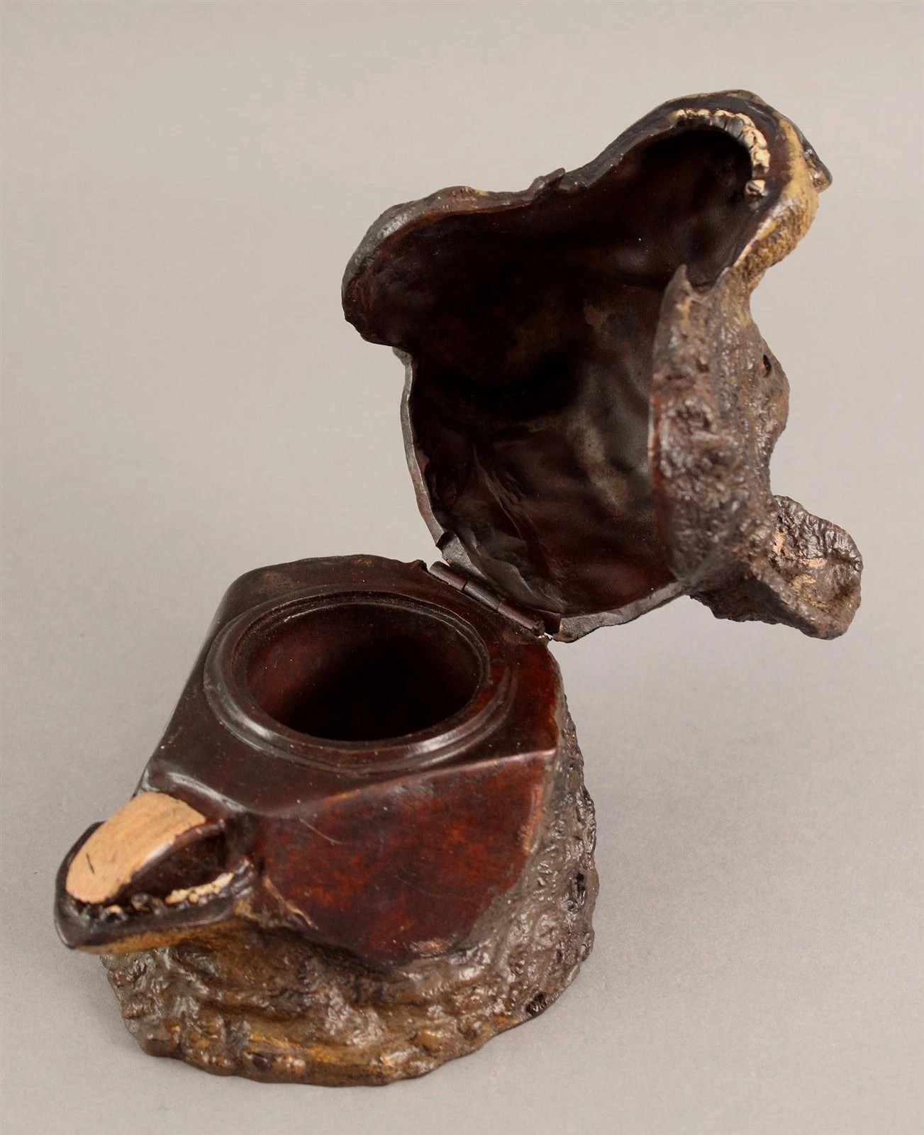 This charming bear’s head inkwell is believed to be a modern production, mimicking the late 19th to early 20th-century Austrian or German cold-painted bronzes, especially those from the Bergman workshop. But unlike the originals, they’re made for decorative appeal, not utility or craftsmanship. And, unfortunately, they are sold as antique pieces.