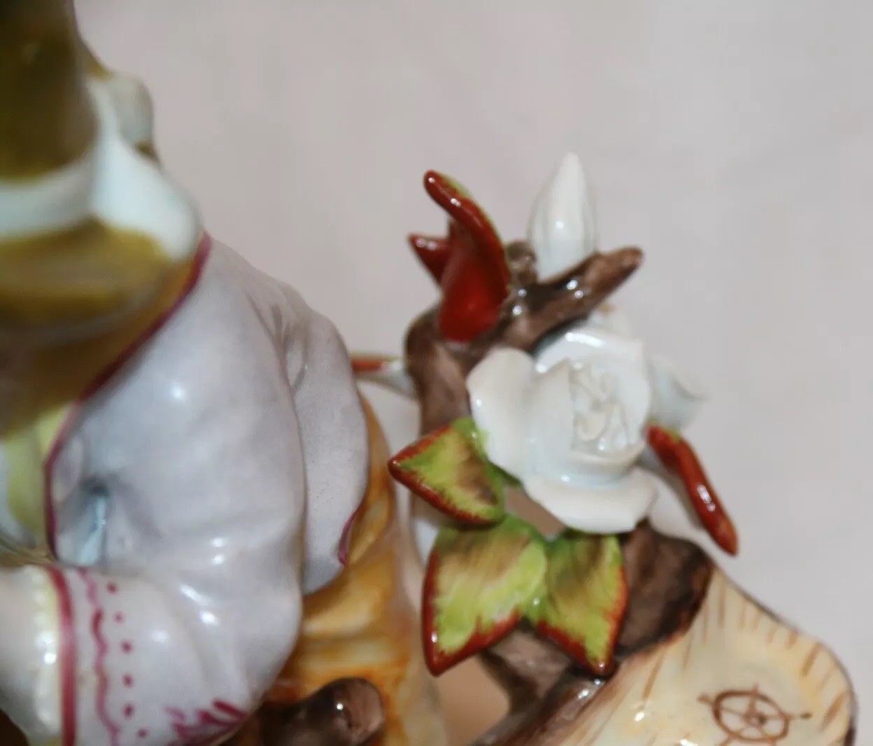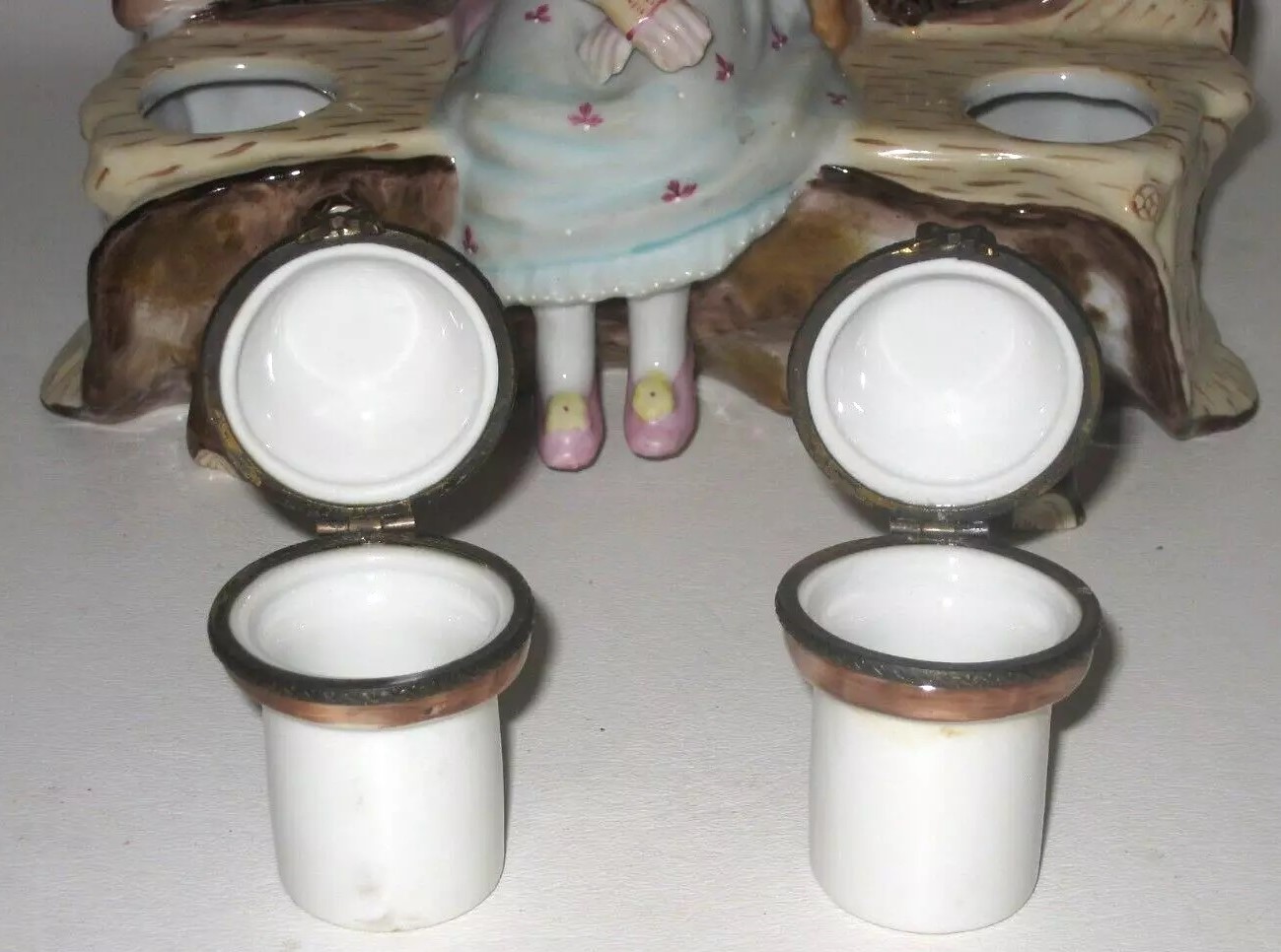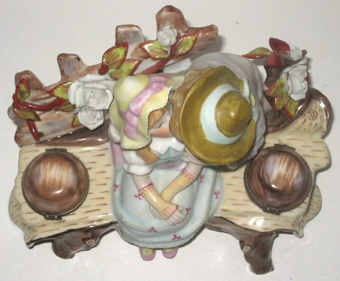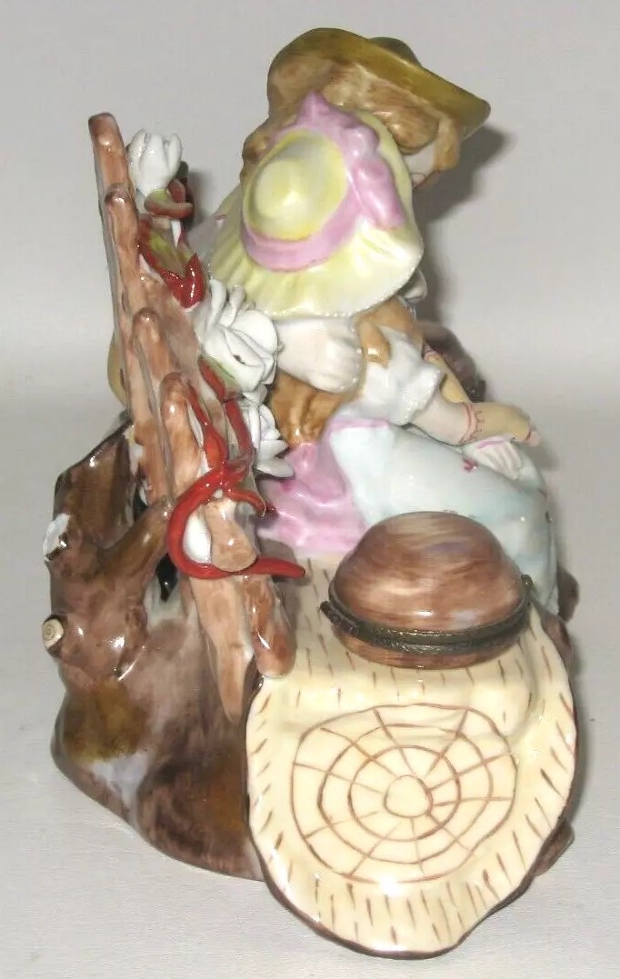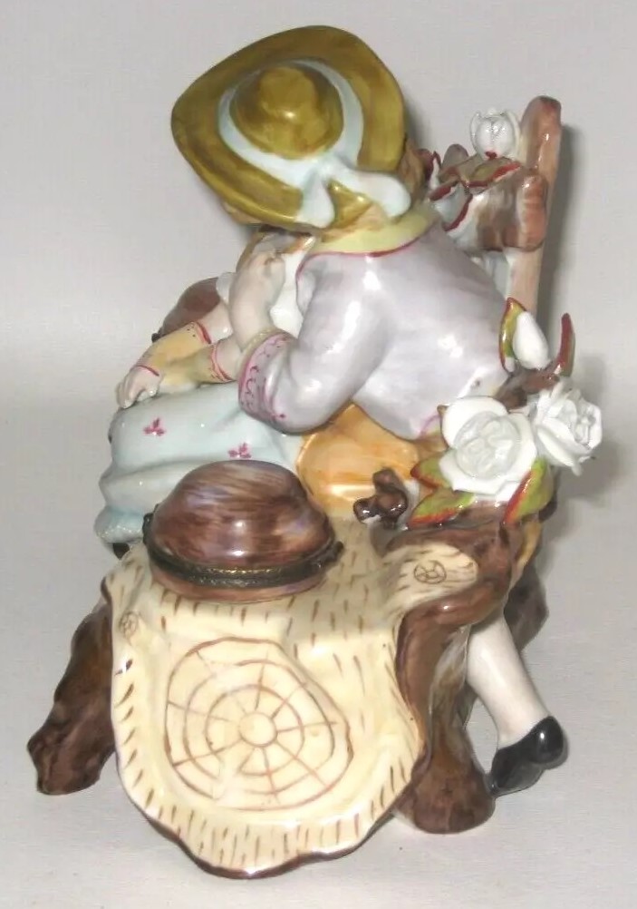This porcelain inkstand is a charmer! It captures a romantic scene of a young peasant couple sitting on a log bench adorned with flowers. The couple is depicted in an intimate moment, with the young boy leaning towards the girl as if they are about to kiss. The log bench, detailed with natural brown tones, integrates two inkwells resembling tree stumps with hinged lids on either side of the couple. The figures’ clothing is painted in pastel shades. It is marked on the bottom with a gold anchor.
