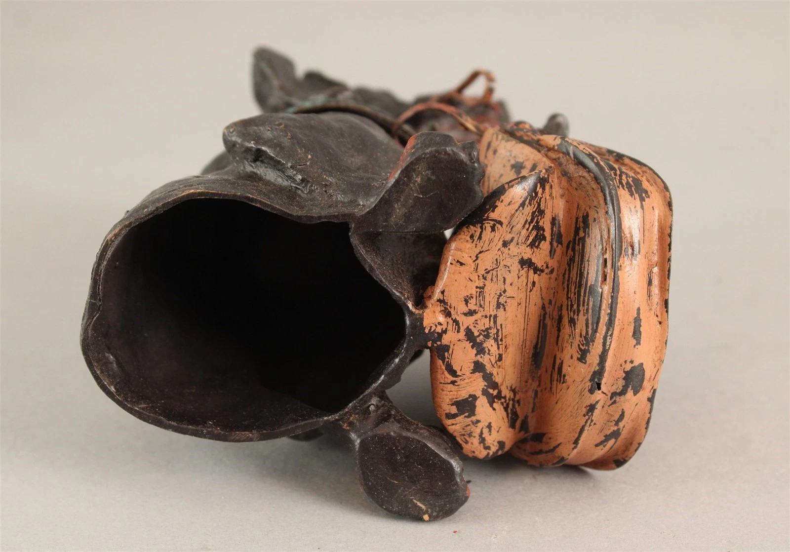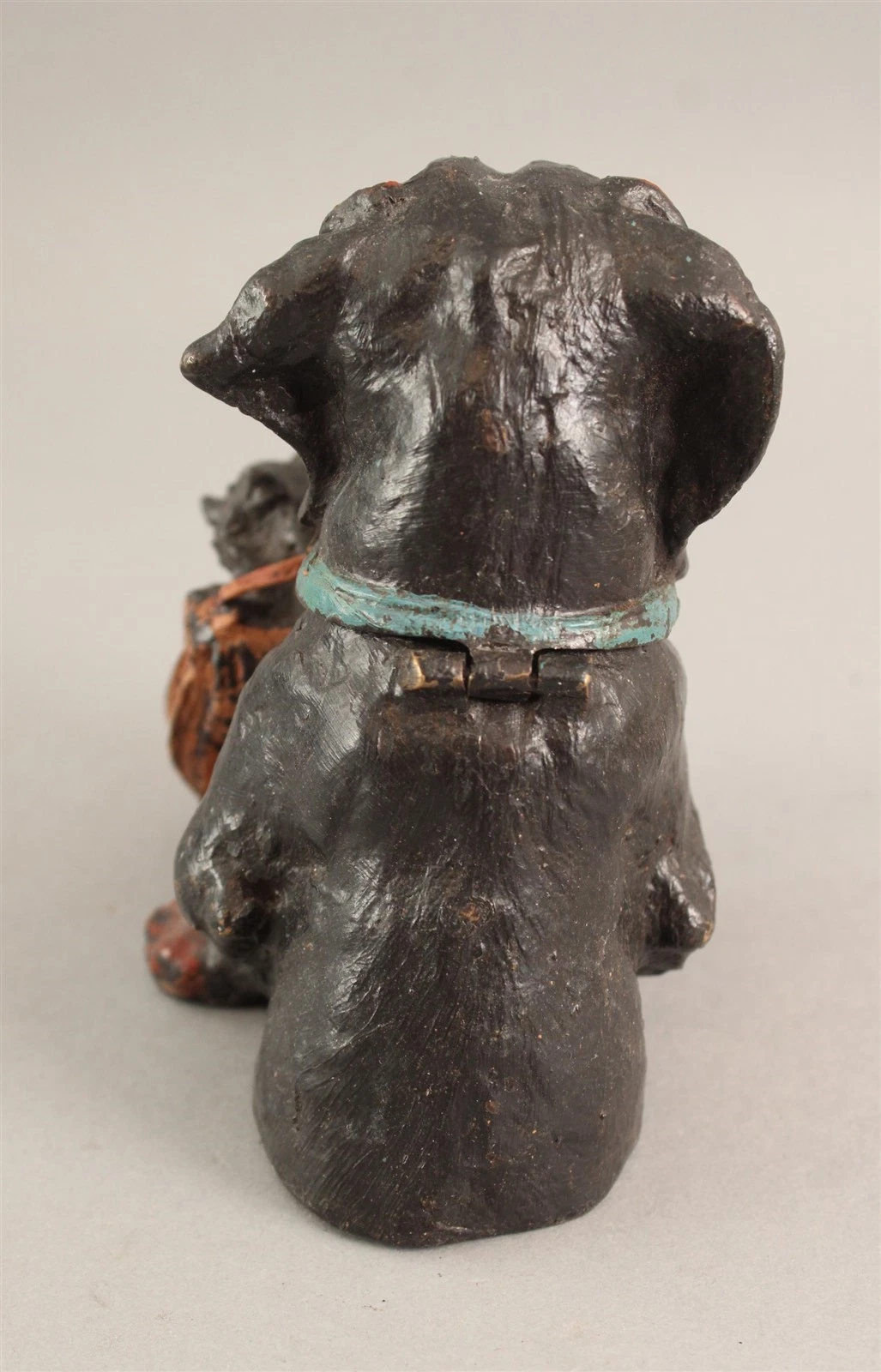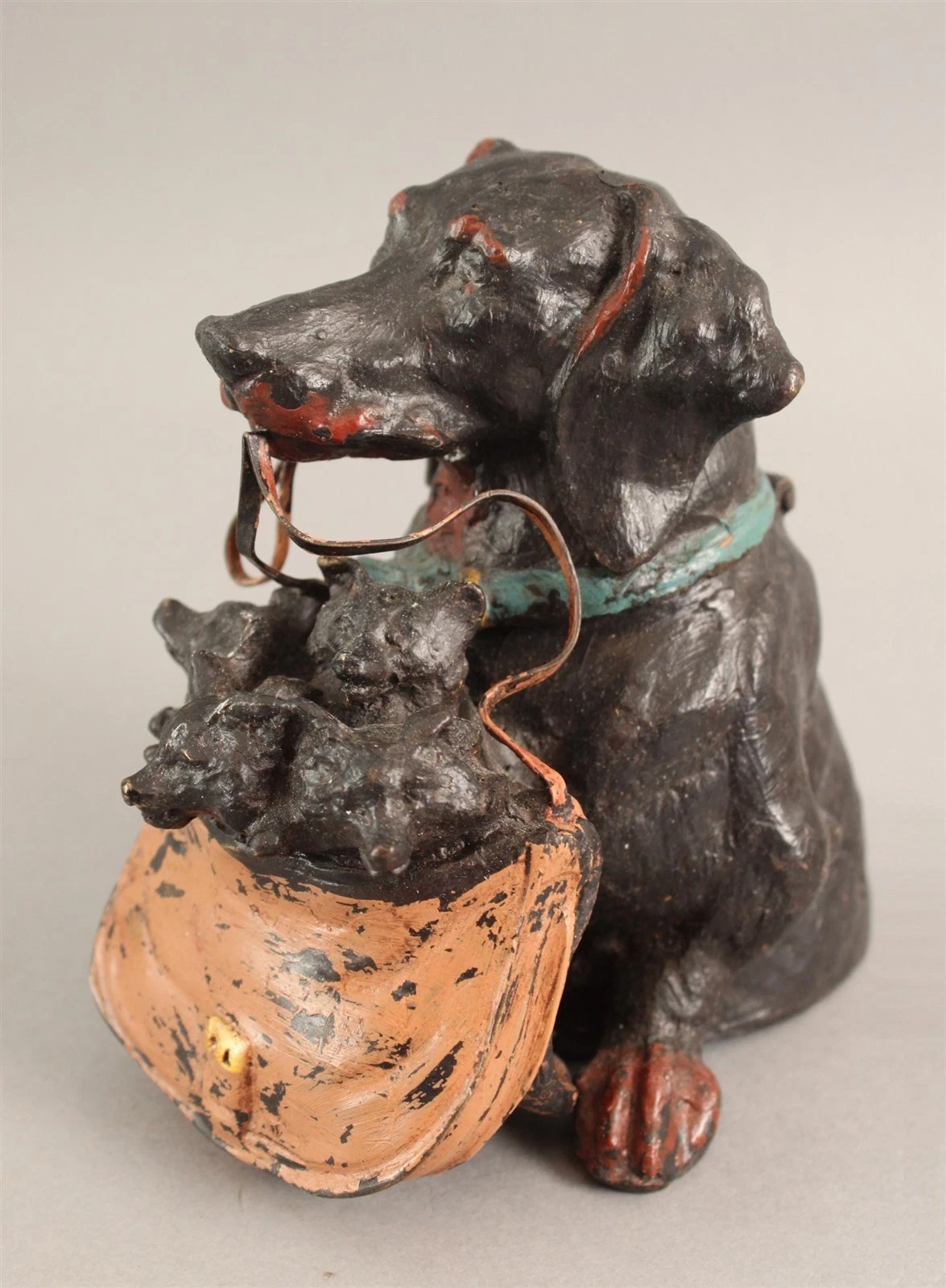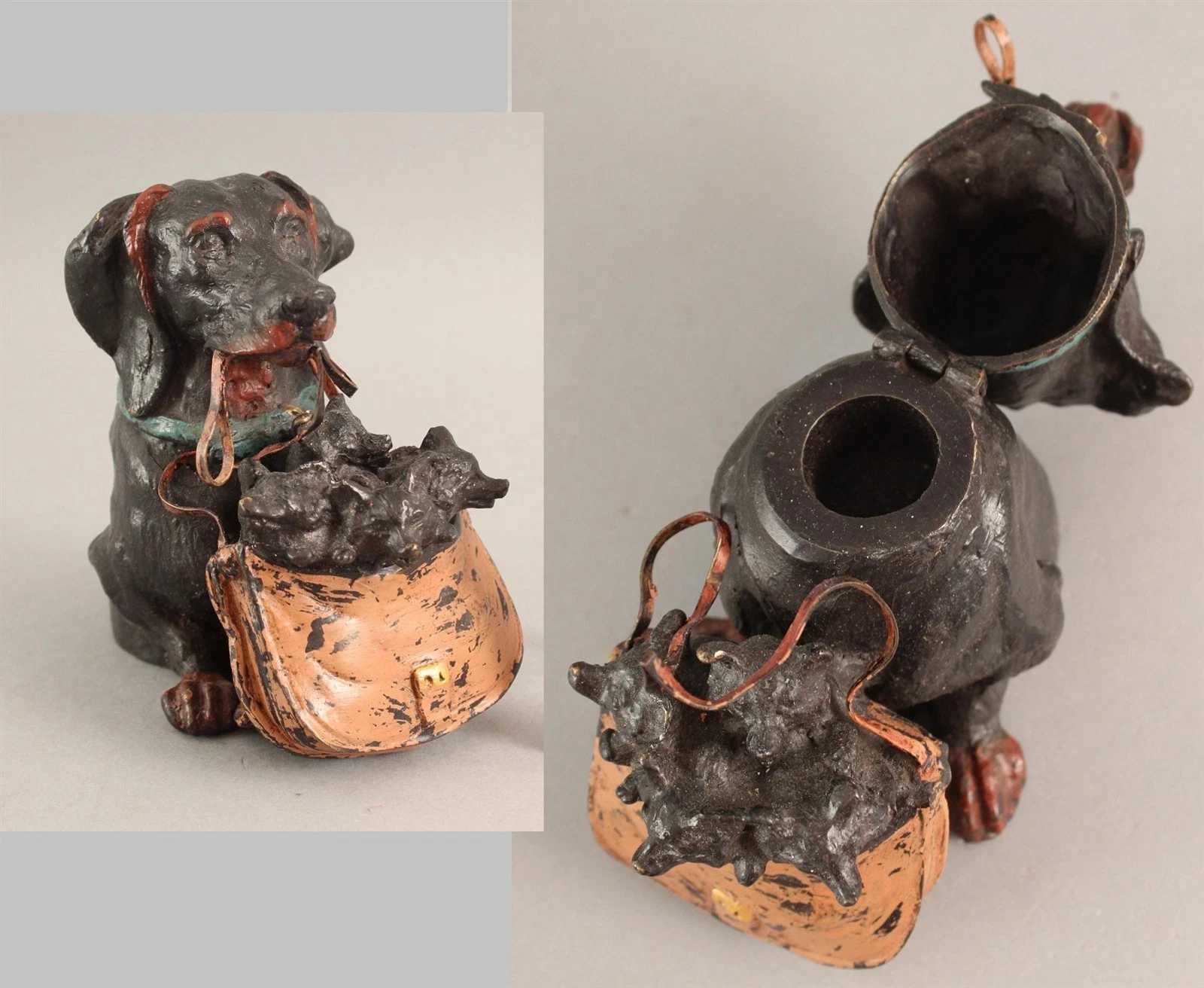 This inkwell – a cold painted bronze dachshund holding a satchel of fox cubs – is a charmer but has many indicators of a modern production.  The subject matter itself – a whimsical, engaging figural – lends itself to being a contemporary creation. And then, something never seen before suddenly appears in numbers on the internet.