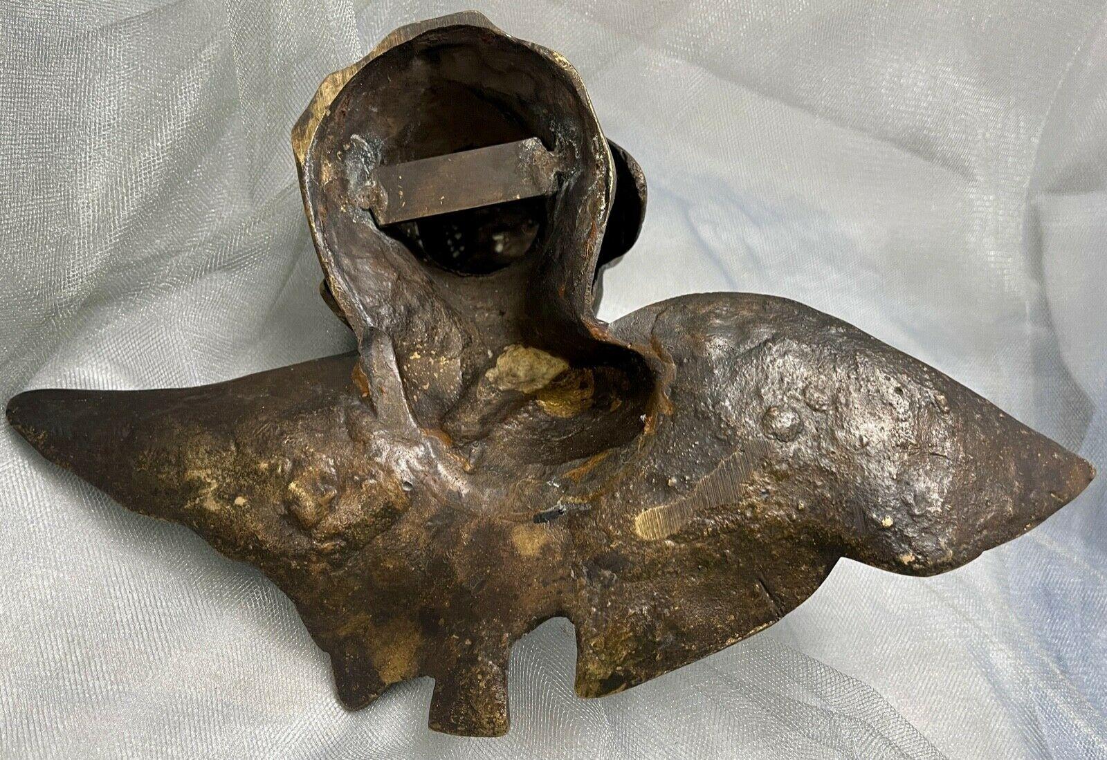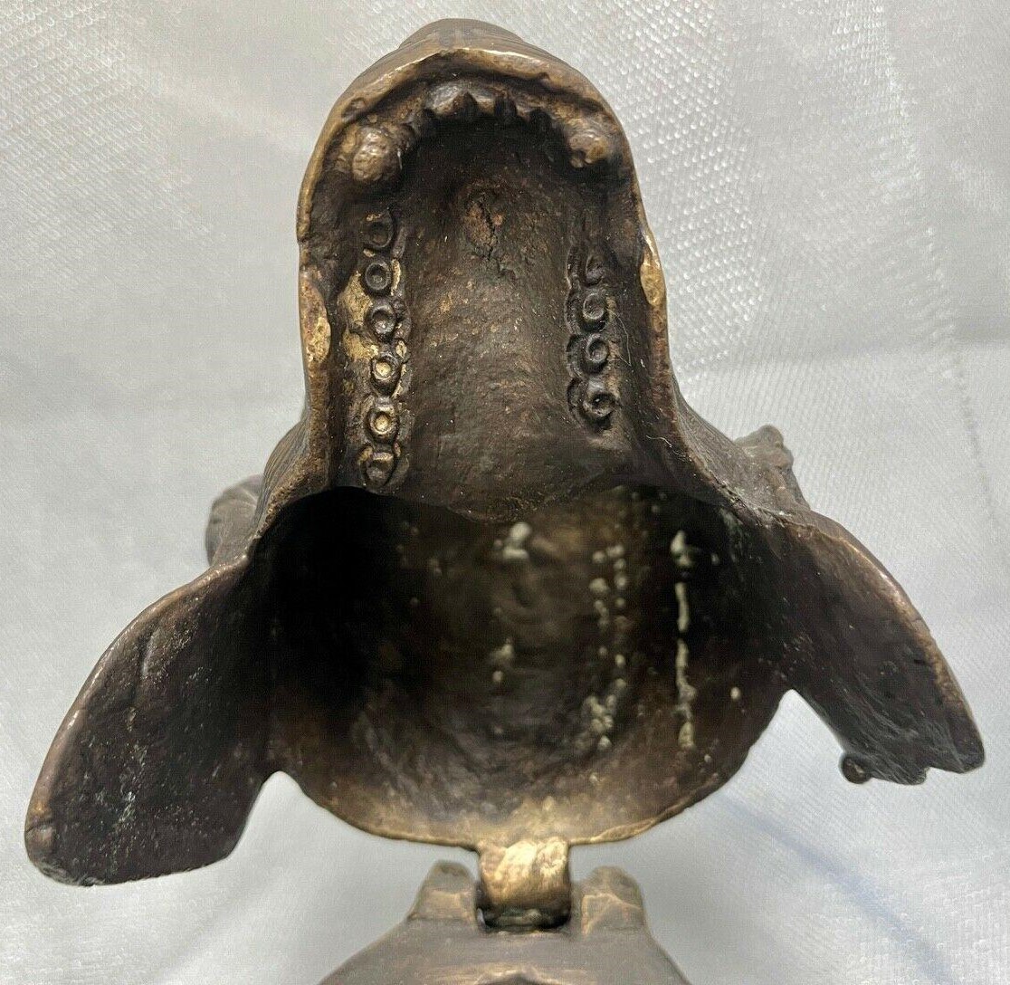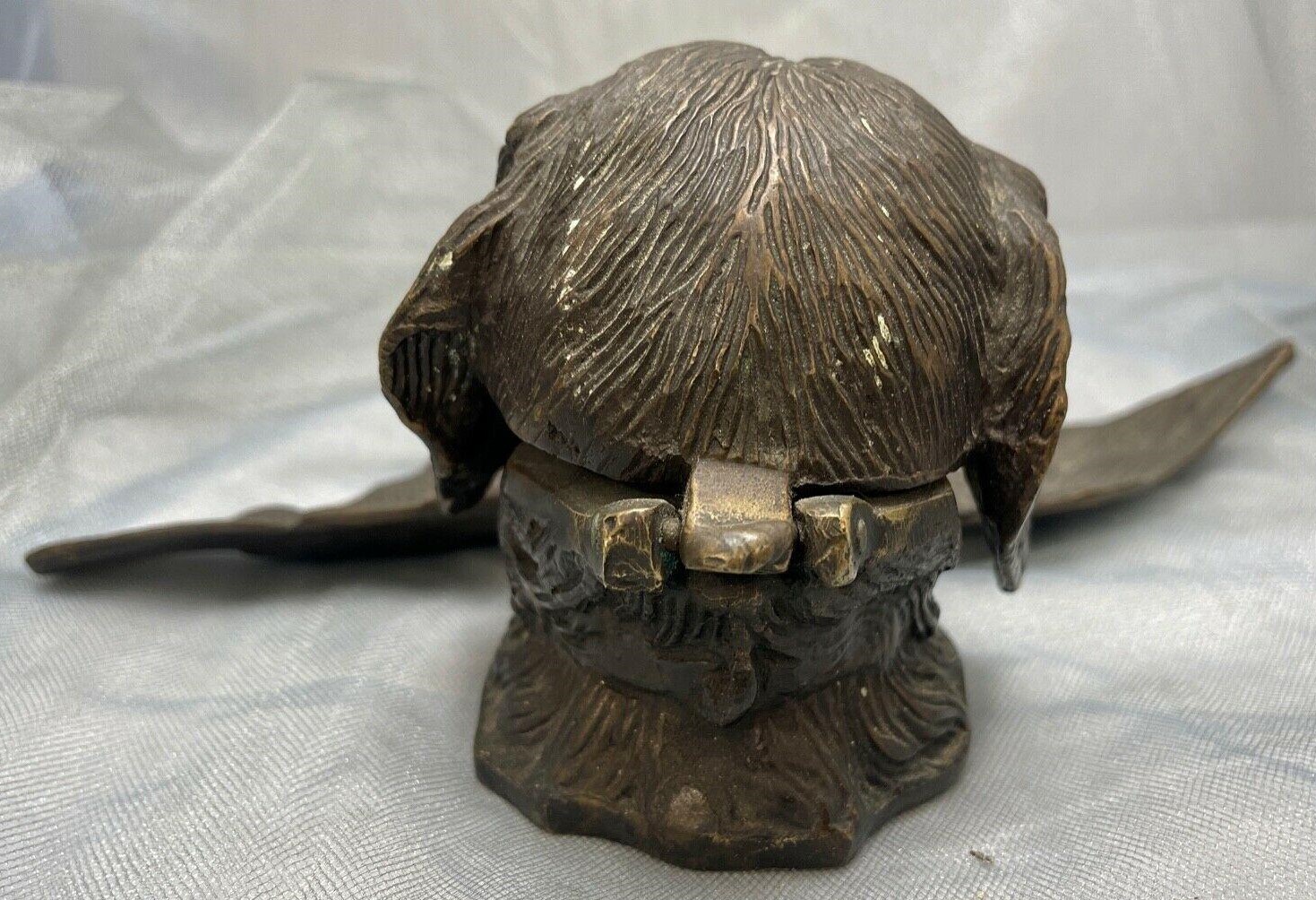 Notice how the dog’s coat is cast in grooves. Notice the large, primitive hinge. Notice the roughness under the snout and on the underside of the piece. There is no insert on this example, but it would have been made of metal like the other specimens found online.